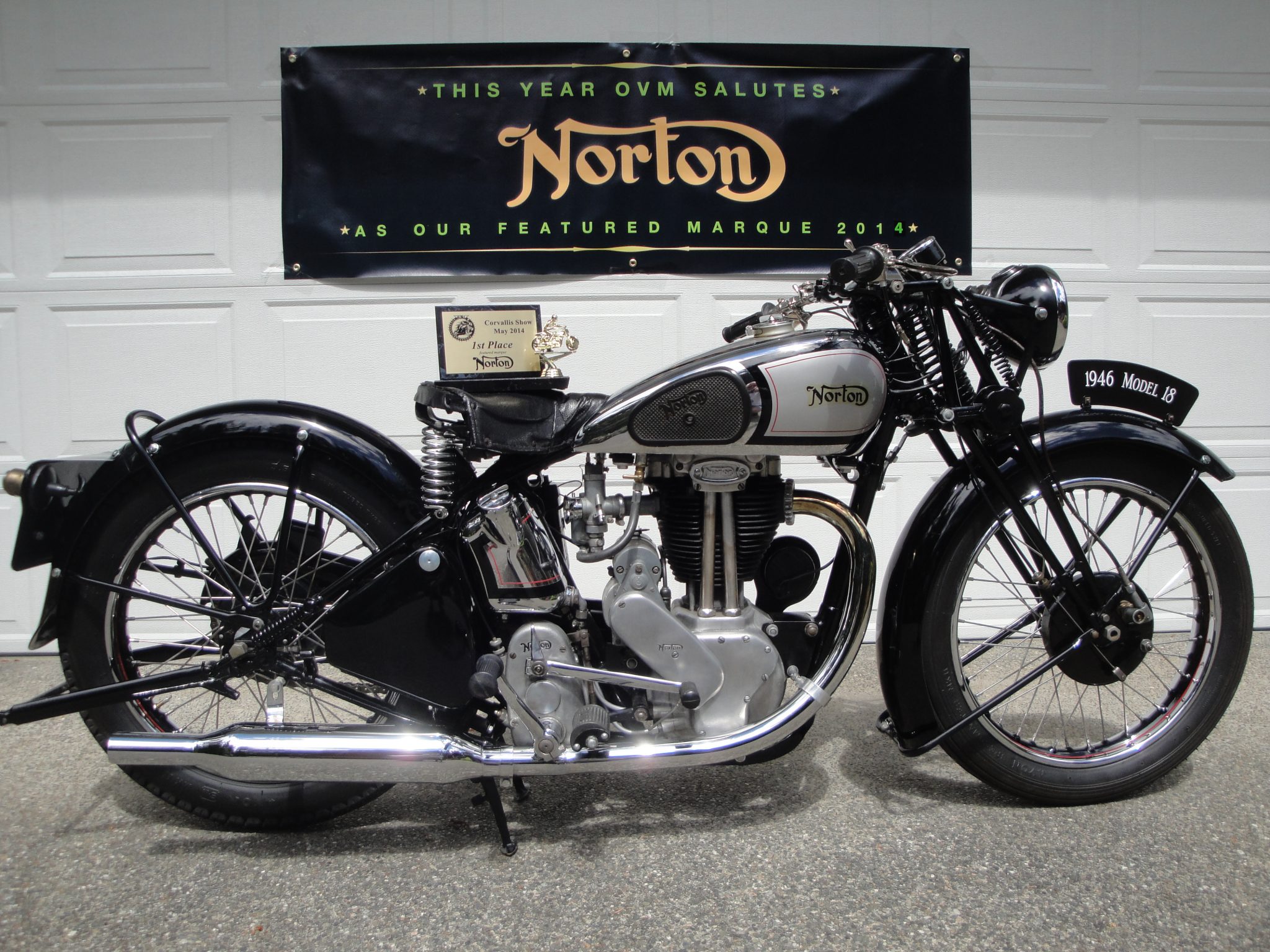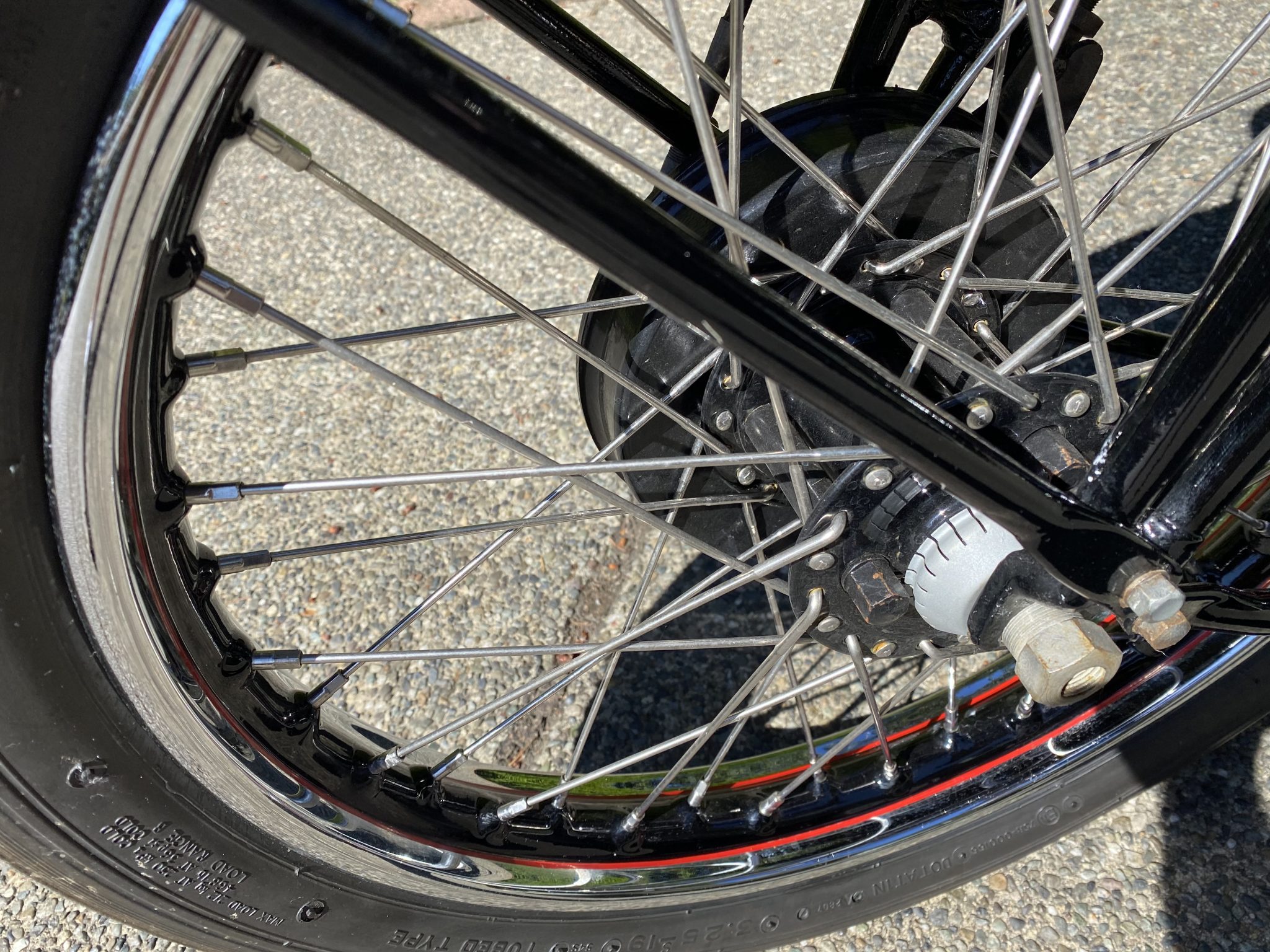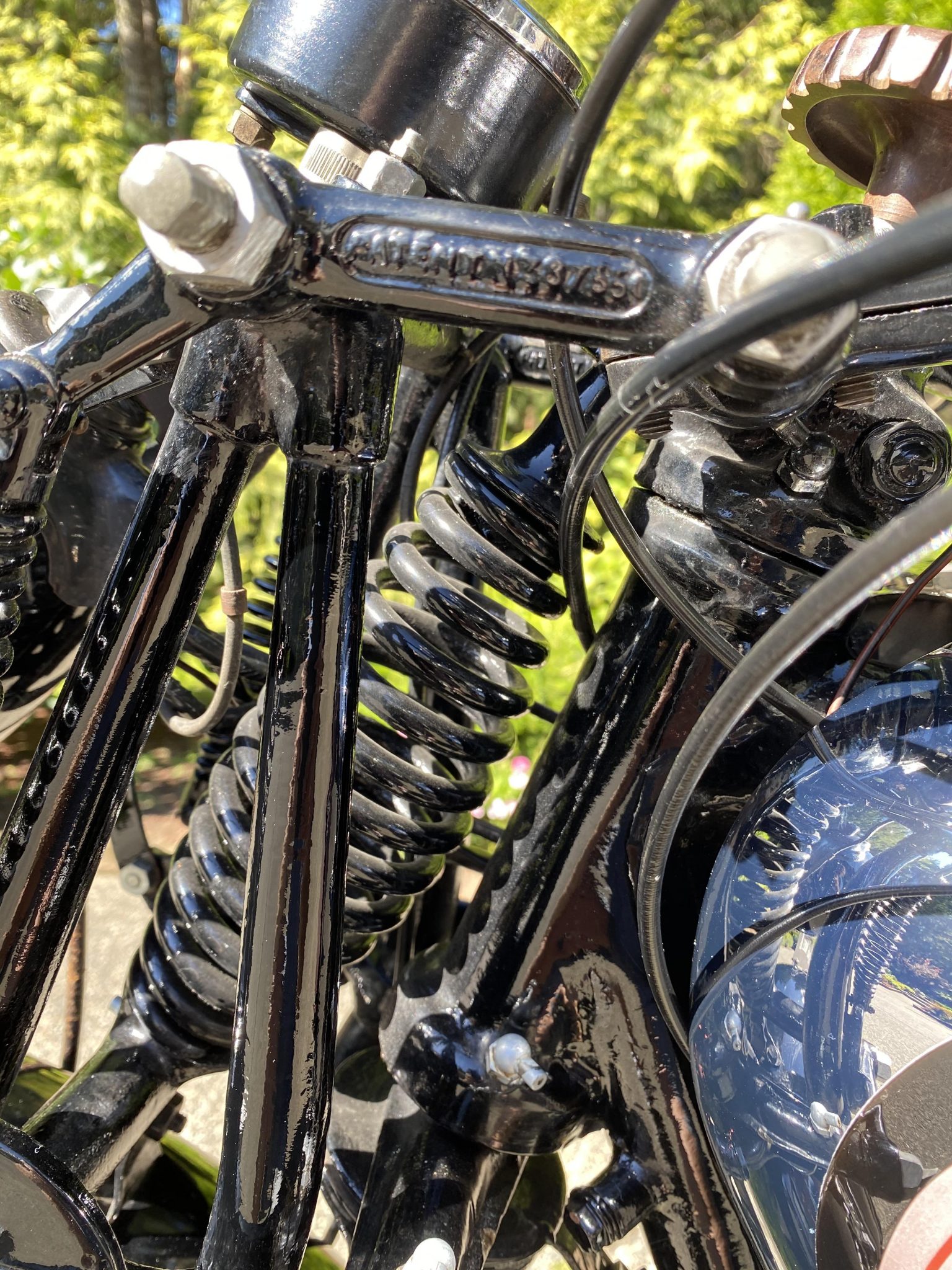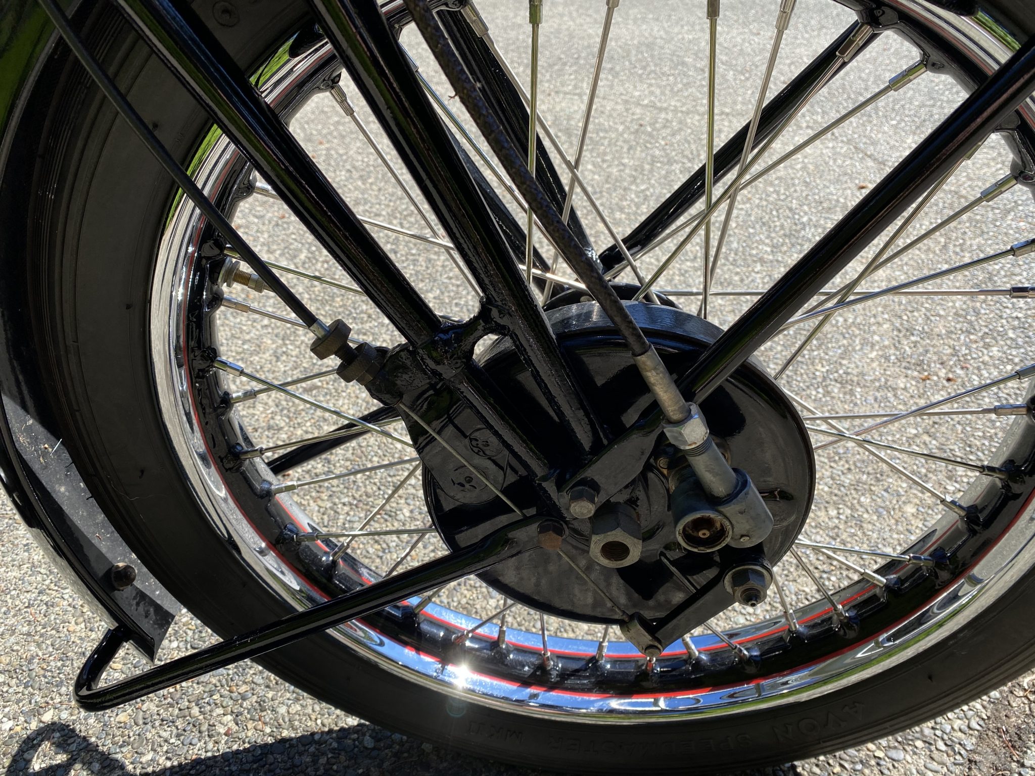 Wire wheels were laced with stainless steel spokes under current ownership, while the rims were rechromed and finished with black and red center stripes. 1946 was the final model year for mechanical girder forks, while the rear end is rigid. Braking is from drums at both ends.