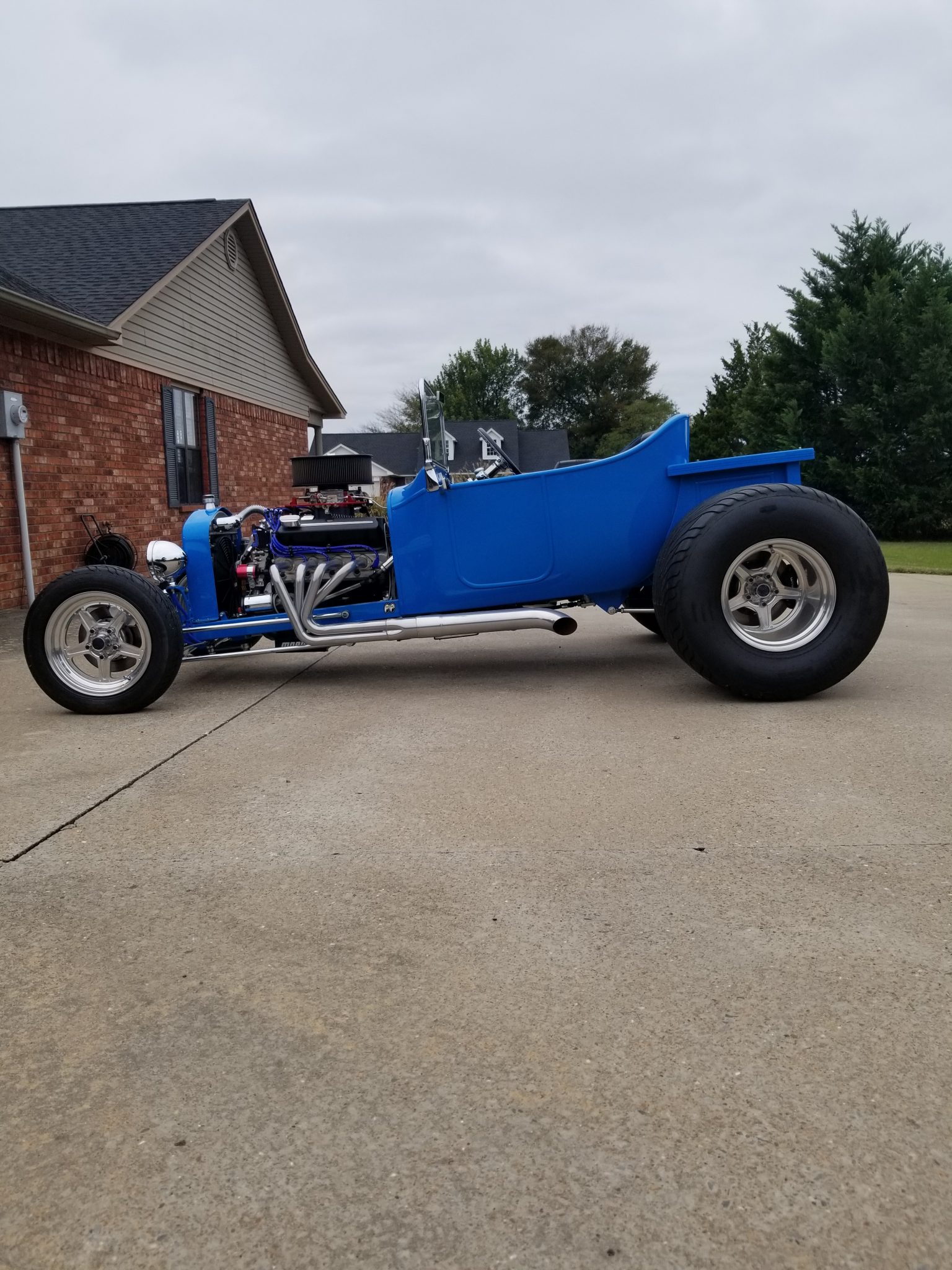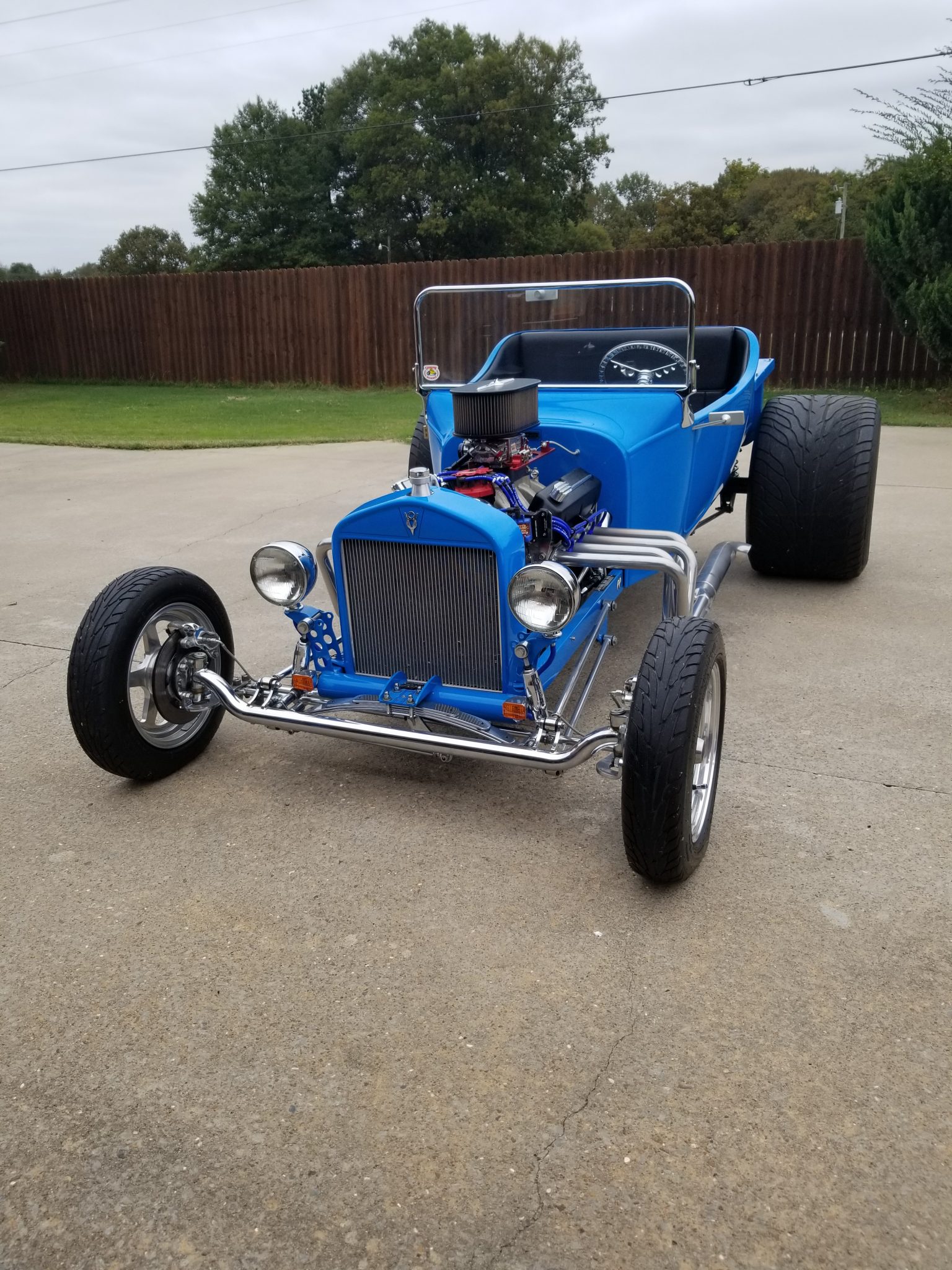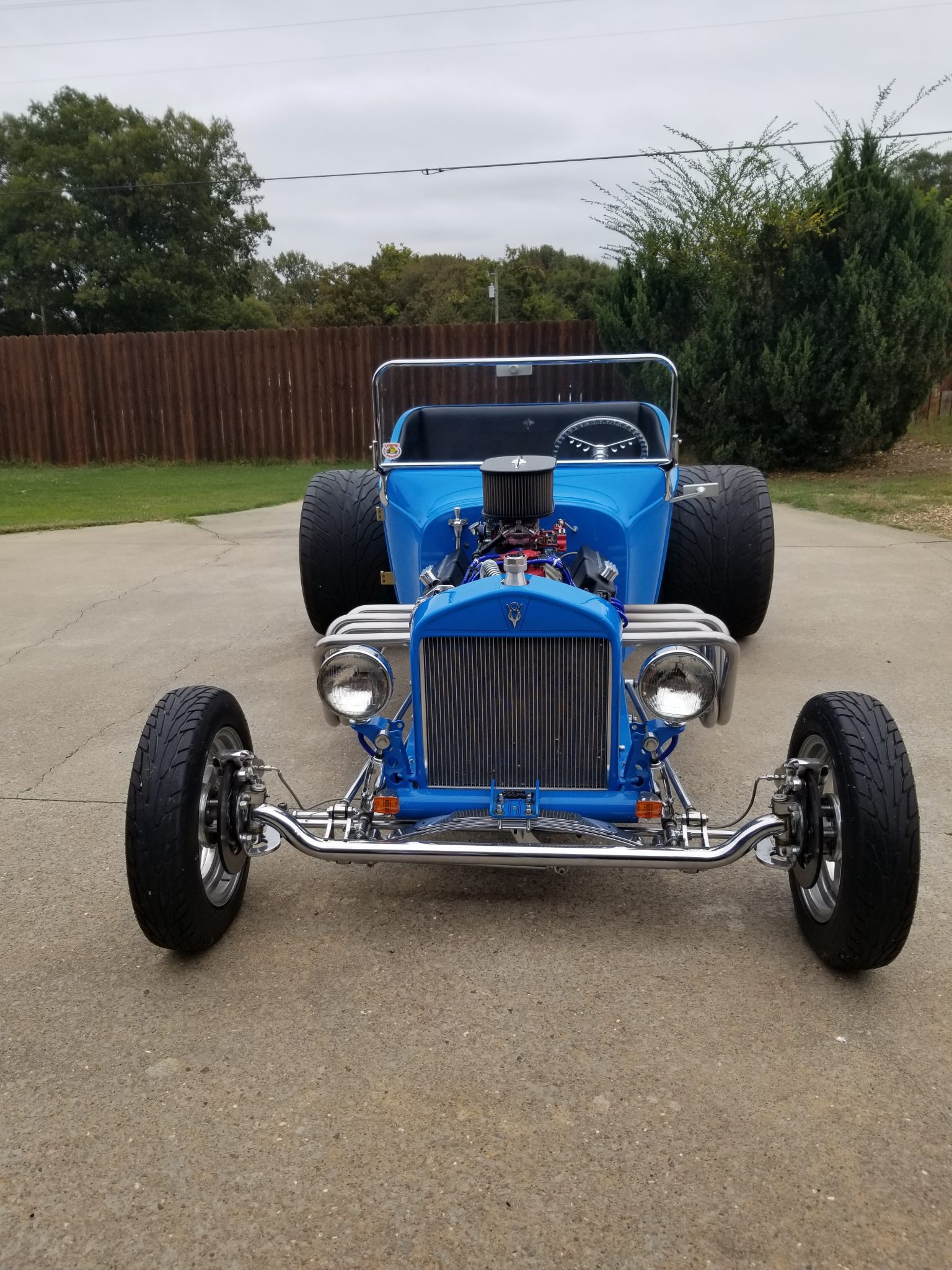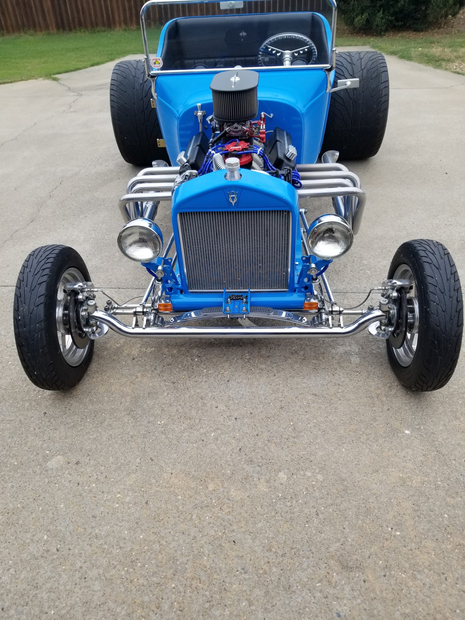 Staggered five-spoke polished Billet Specialties wheels are mounted with Mickey Thompson tires that measure 18″ wide out back. The car is equipped with four-wheel disc brakes and chromed suspension components including a front drop axle and rear coilovers.
