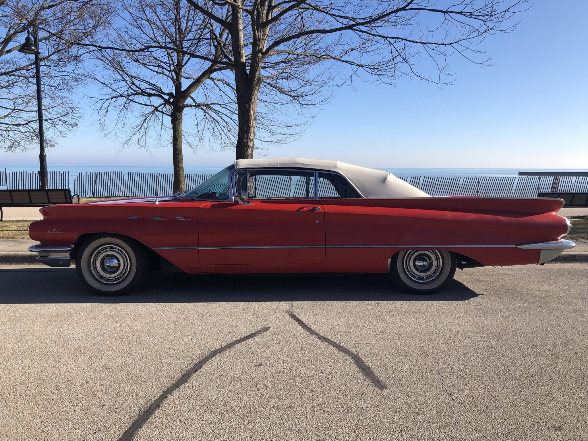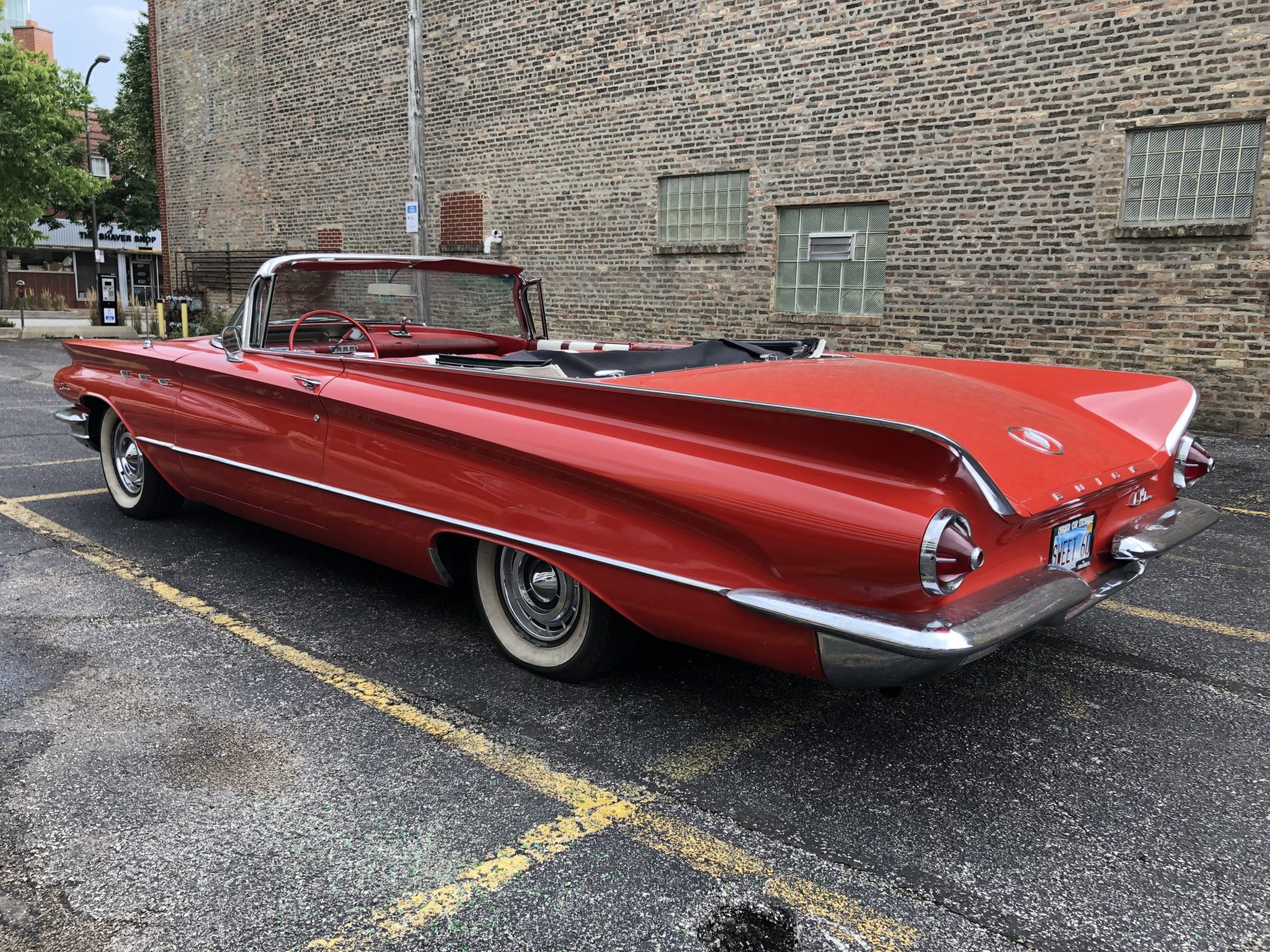 The 15″ wheels are wrapped in BFGoodrich Silvertown Radial whitewall tires. Braking is from power-assisted front discs and rear drums, and the brake master cylinder was replaced in March 2020. Power-assisted steering is said to have been added.