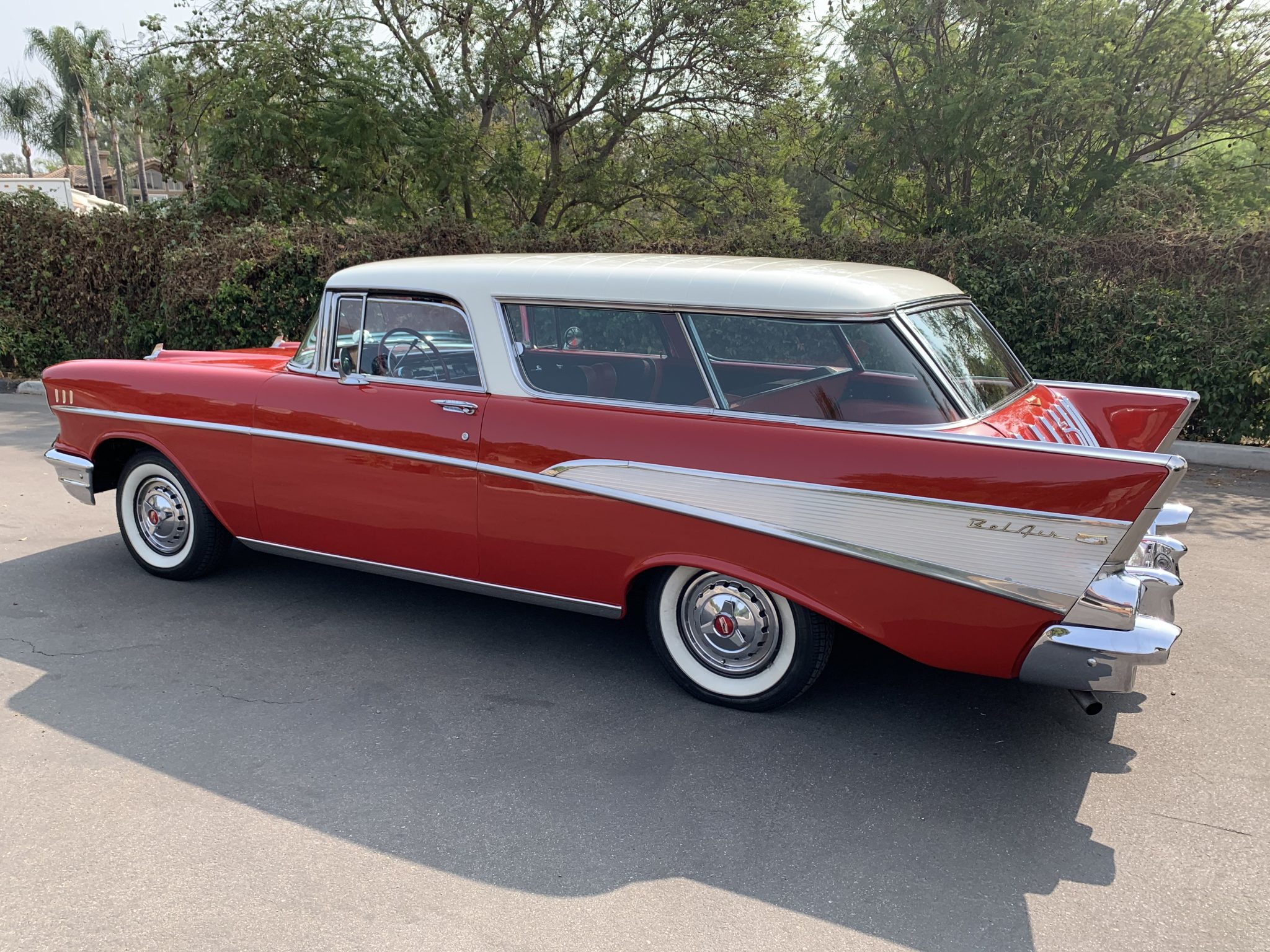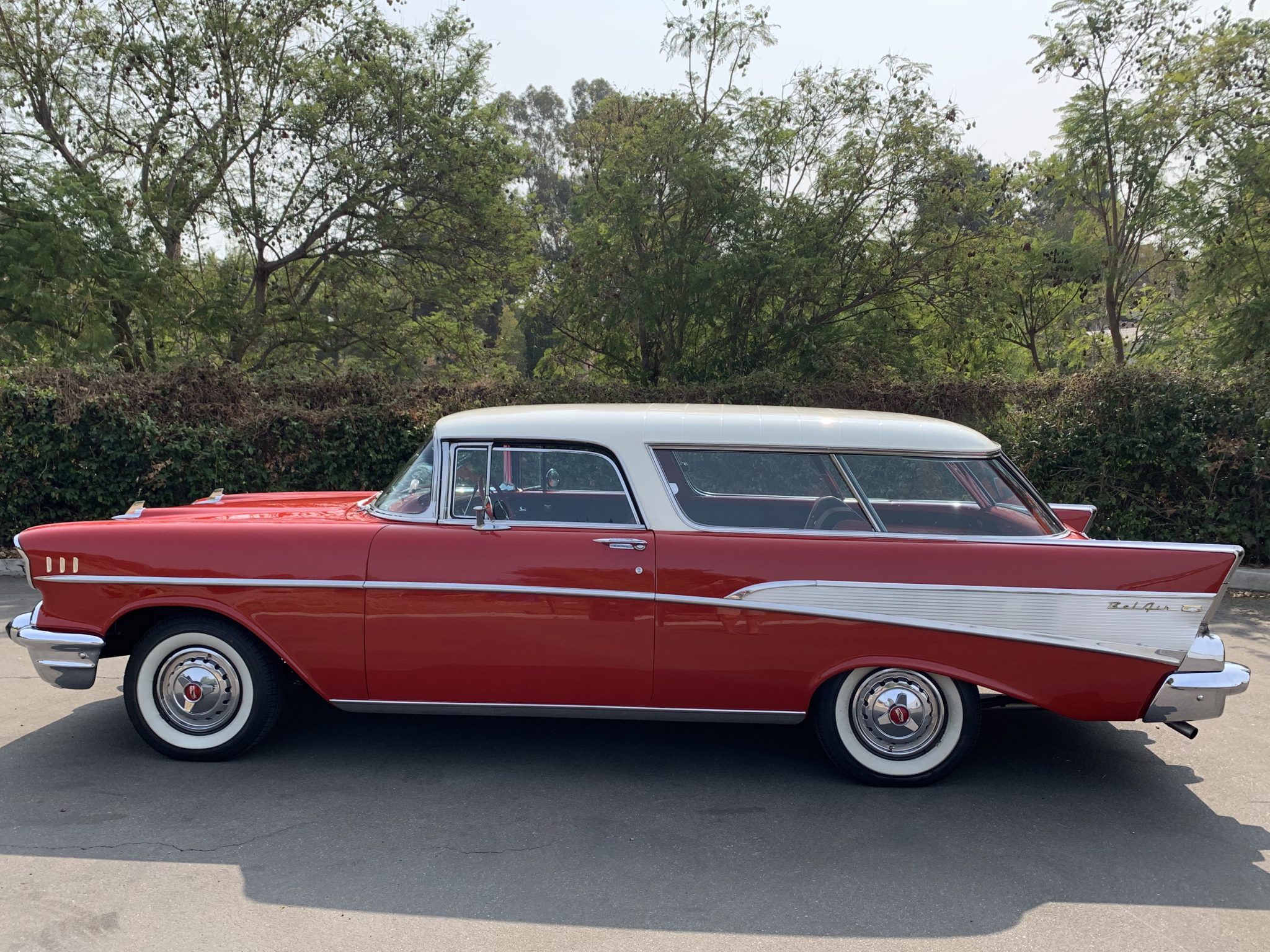 Steel wheels wear three-eared hubcaps and 14″ Coker Classic whitewall tires. A spare is located in a compartment below the rear cargo area. The 1957 model’s sloped B-pillar and sliding rear side windows are pictured above, as is the hidden fuel filler incorporated into the driver-side tail-fin trim.