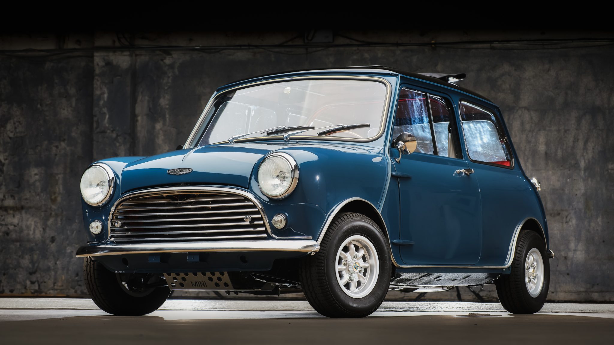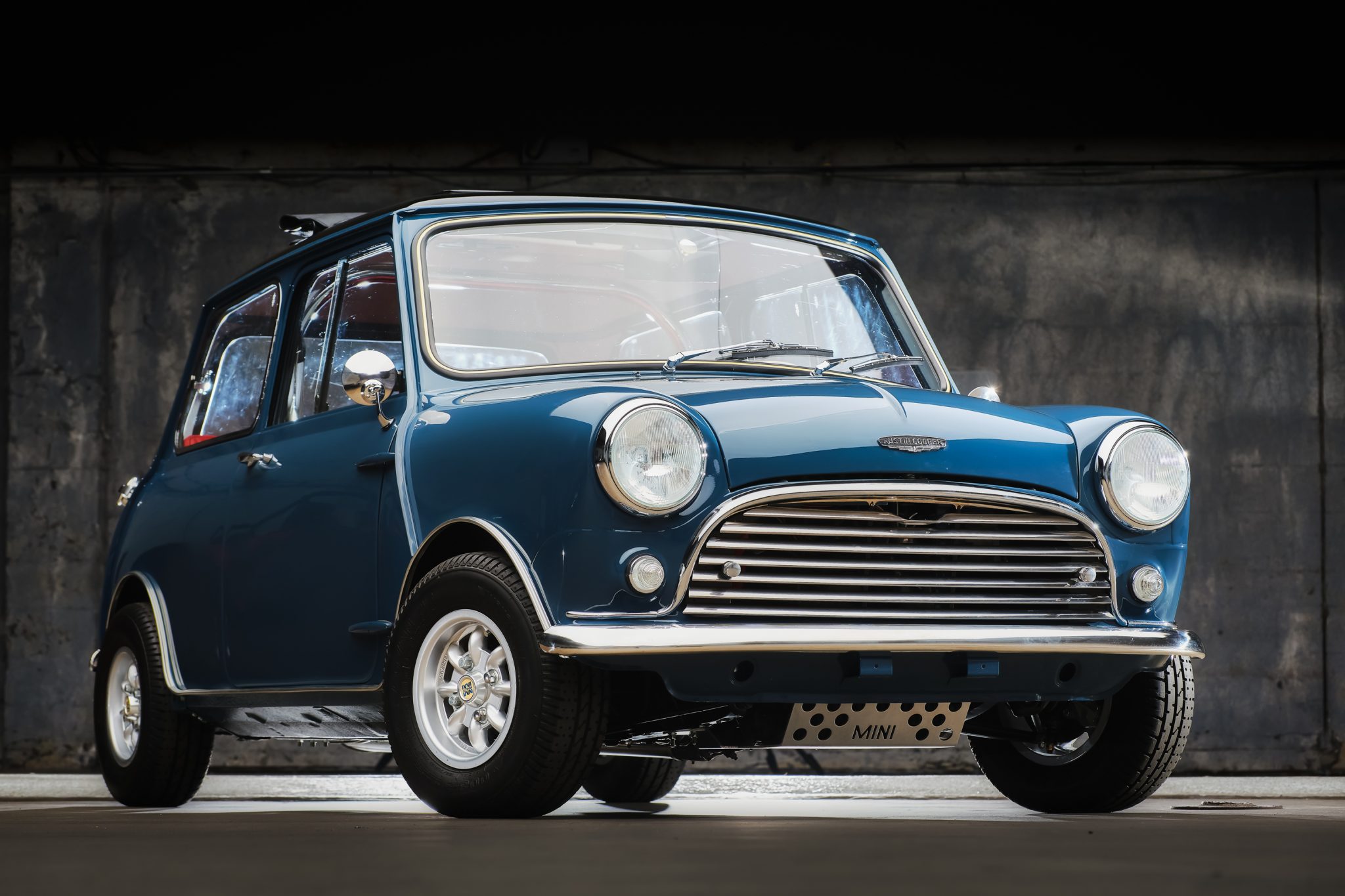 Silver Minilite wheels measure 10″ x 5″ and wear 165/70 Yokohama Advan A-008 HF tires with 2006 date codes. Braking is handled by front discs and finned Cooper S-style rear drums. The car retains Hydrolastic suspension, and new stainless steel lines were fitted along with refinished suspension arms and bags.