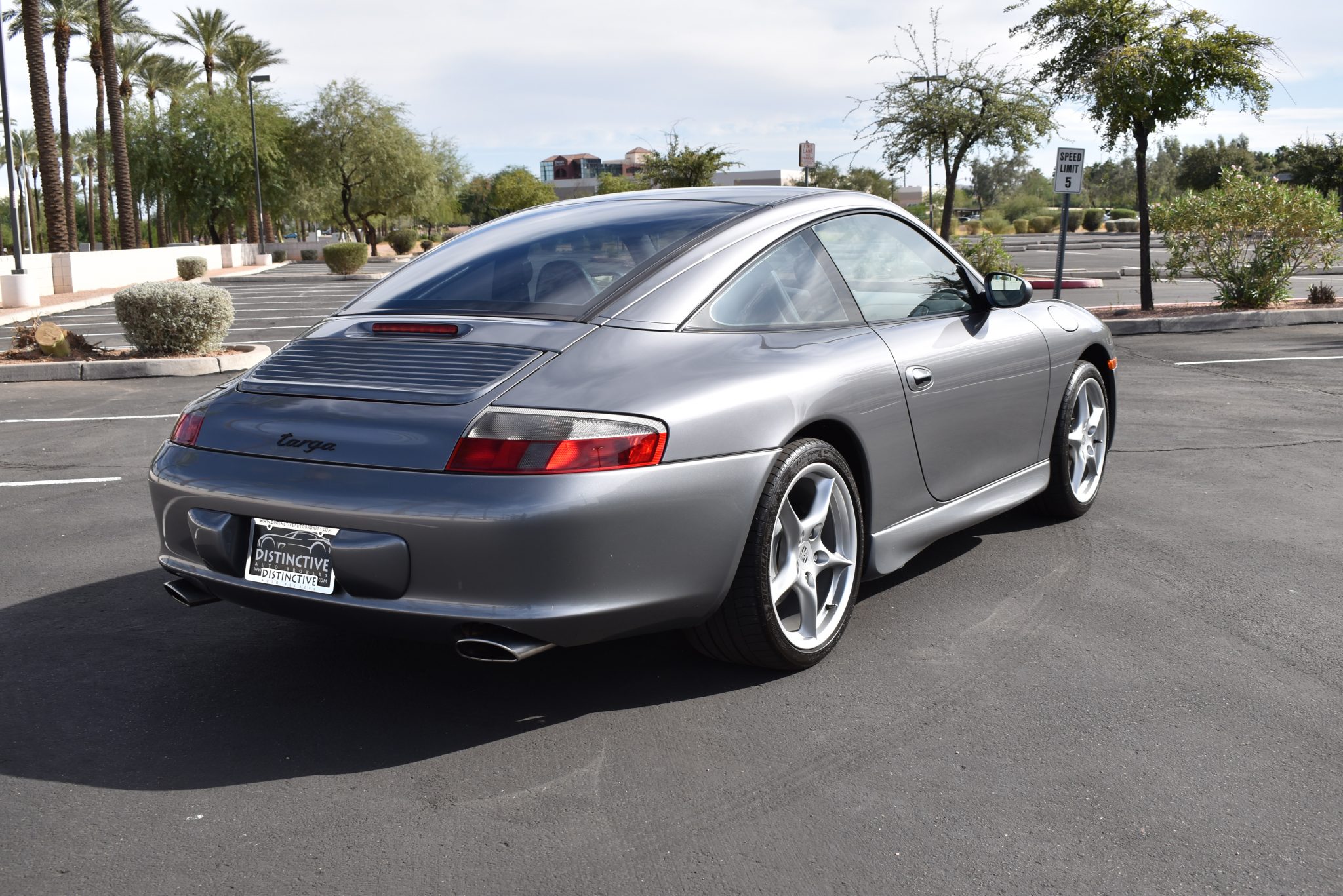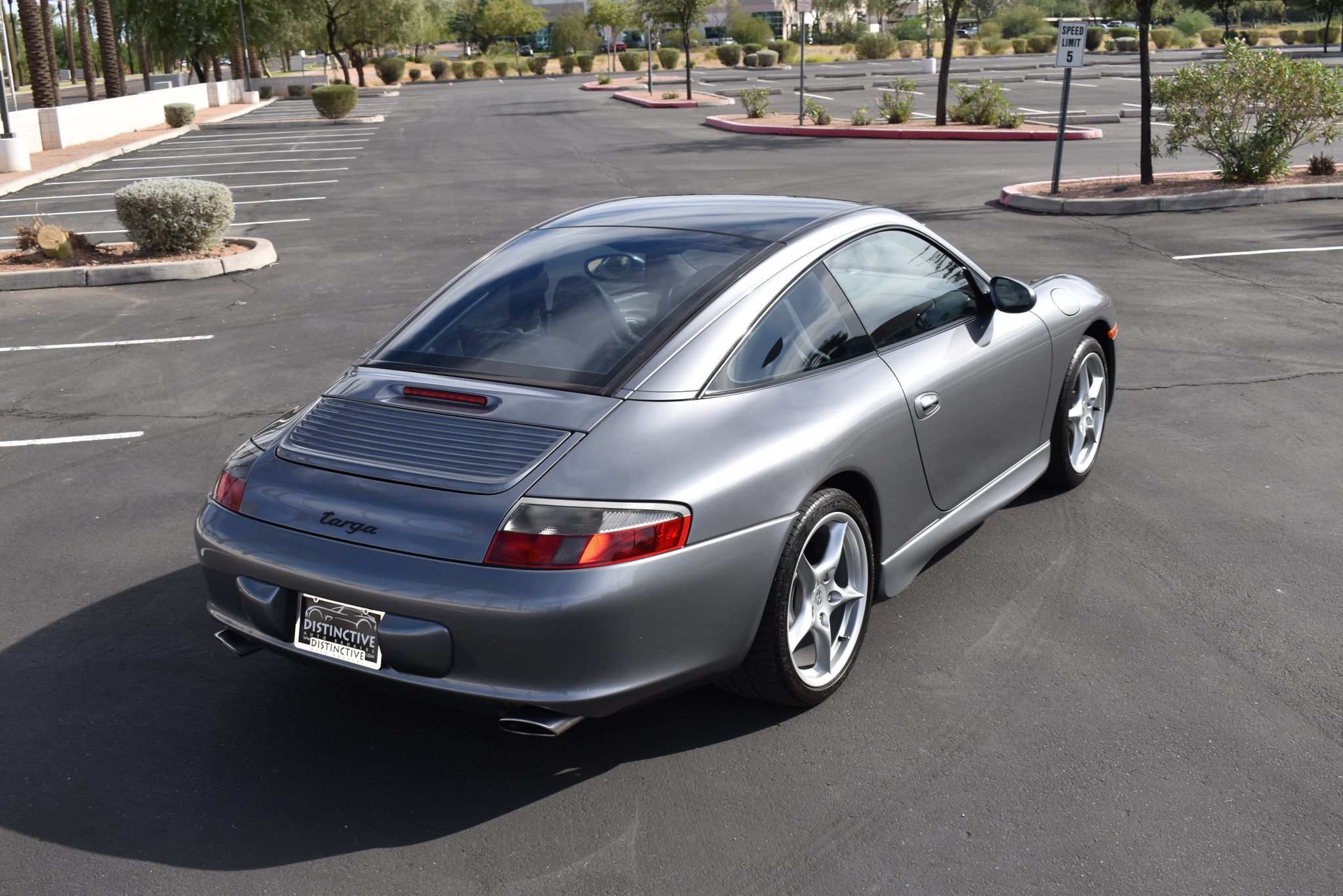 Factory 18″ five-spoke alloy wheels are wrapped in Michelin Pilot Sport tires. The car is equipped with an optional sport exhaust system and four-wheel disc brakes with Porsche-branded calipers.