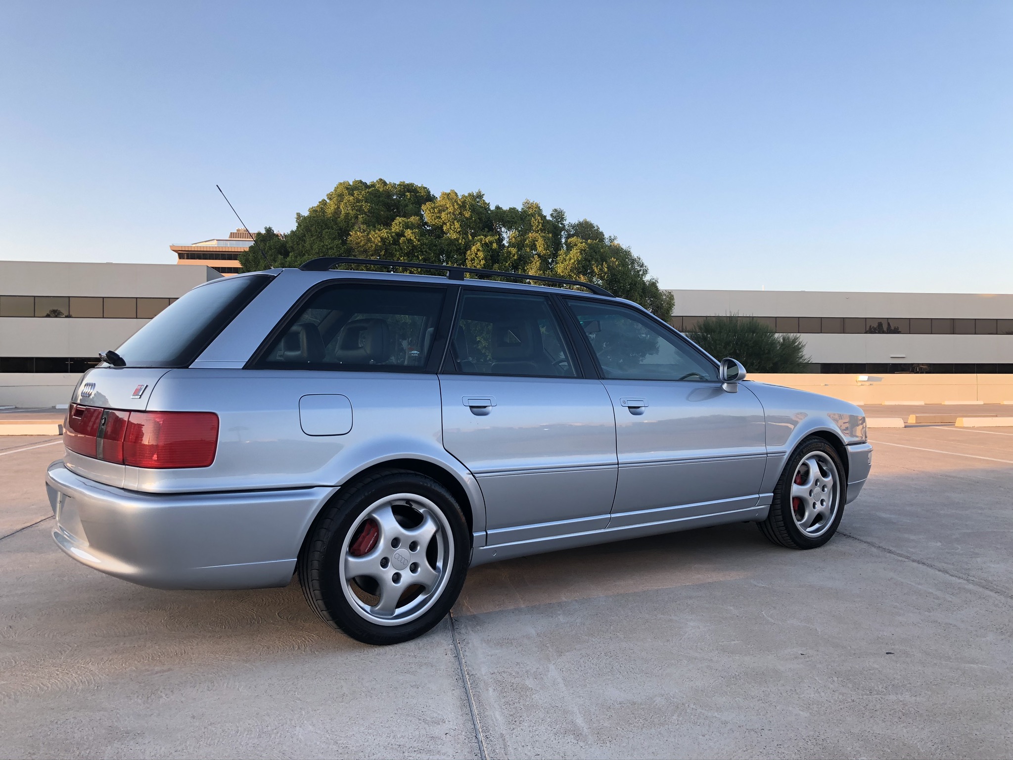 The factory 17″ Cup alloy wheels were shared with the Porsche 964 Turbo and are wrapped in older Michelin Pilot Sport 3 tires sized 225/45. Stopping power is provided by red Porsche-branded calipers at all four corners, and the seller reports that Bilstein sport shock absorbers have been installed. Various blemishes and areas of peeling clear coat are noted on the wheels.