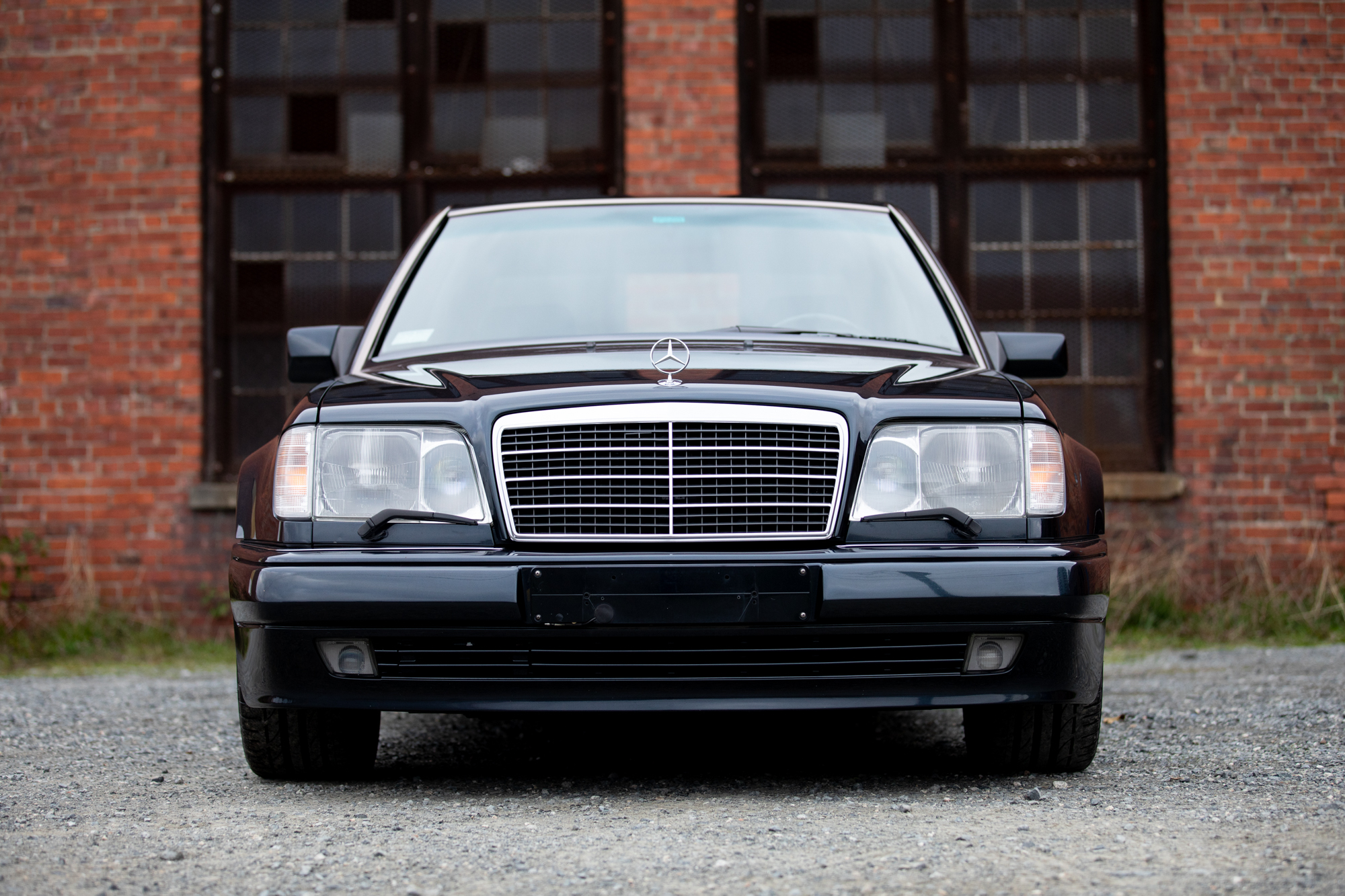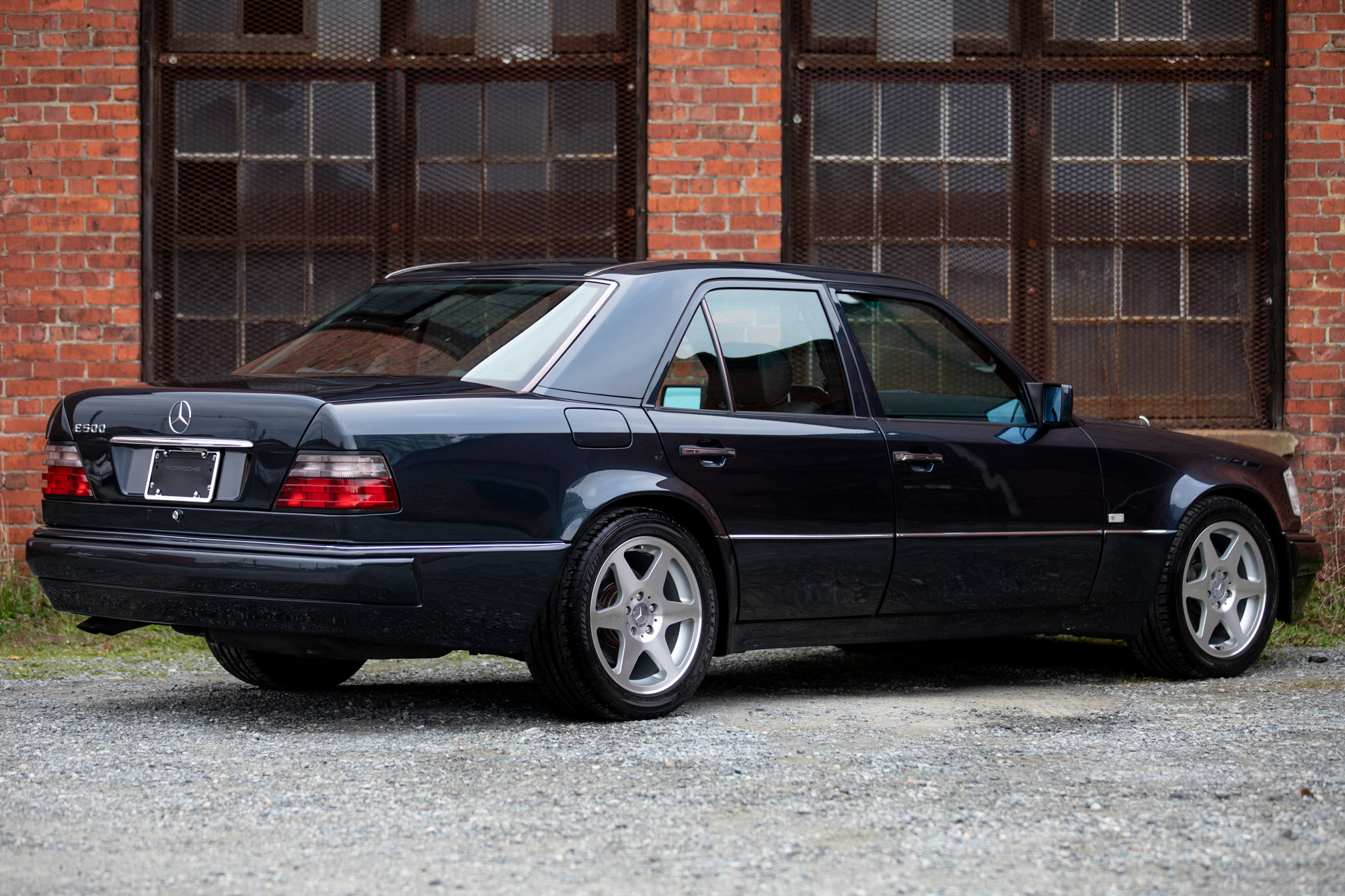 The 17″ Evo wheels were included from the factory and are wrapped in Bridgestone Potenza S001 245/45 tires. A matching spare wheel is fitted under the trunk floor. The E500 featured a wider track and a lower stance compared to other W124 models, while the front disc brakes were shared with the contemporary R129 SL600.