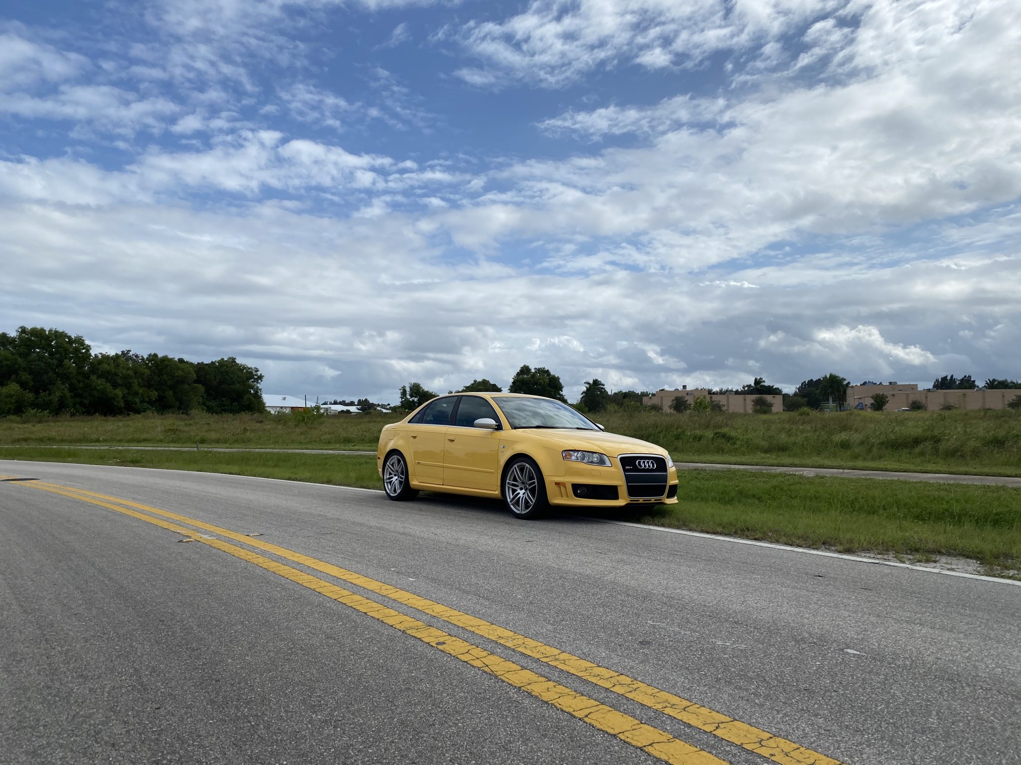 Factory 19″ wheels are wrapped in 255/35 Firestone Firehawk tires at all four corners that were mounted in 2018, and the seller describes peeling paint and curb marks on all four wheels. The RS4 is equipped with eight-piston front brake calipers paired with 365mm cross-drilled and vented discs from the factory.