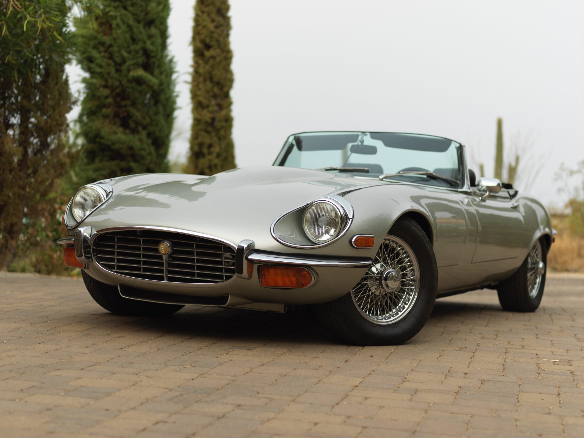 Chrome-finished 15” wire wheels with earless knock-off spinners are wrapped in radial tires measuring 205/70. A black removable hardtop is included in the sale, as is a full-size spare tire and aind jack.