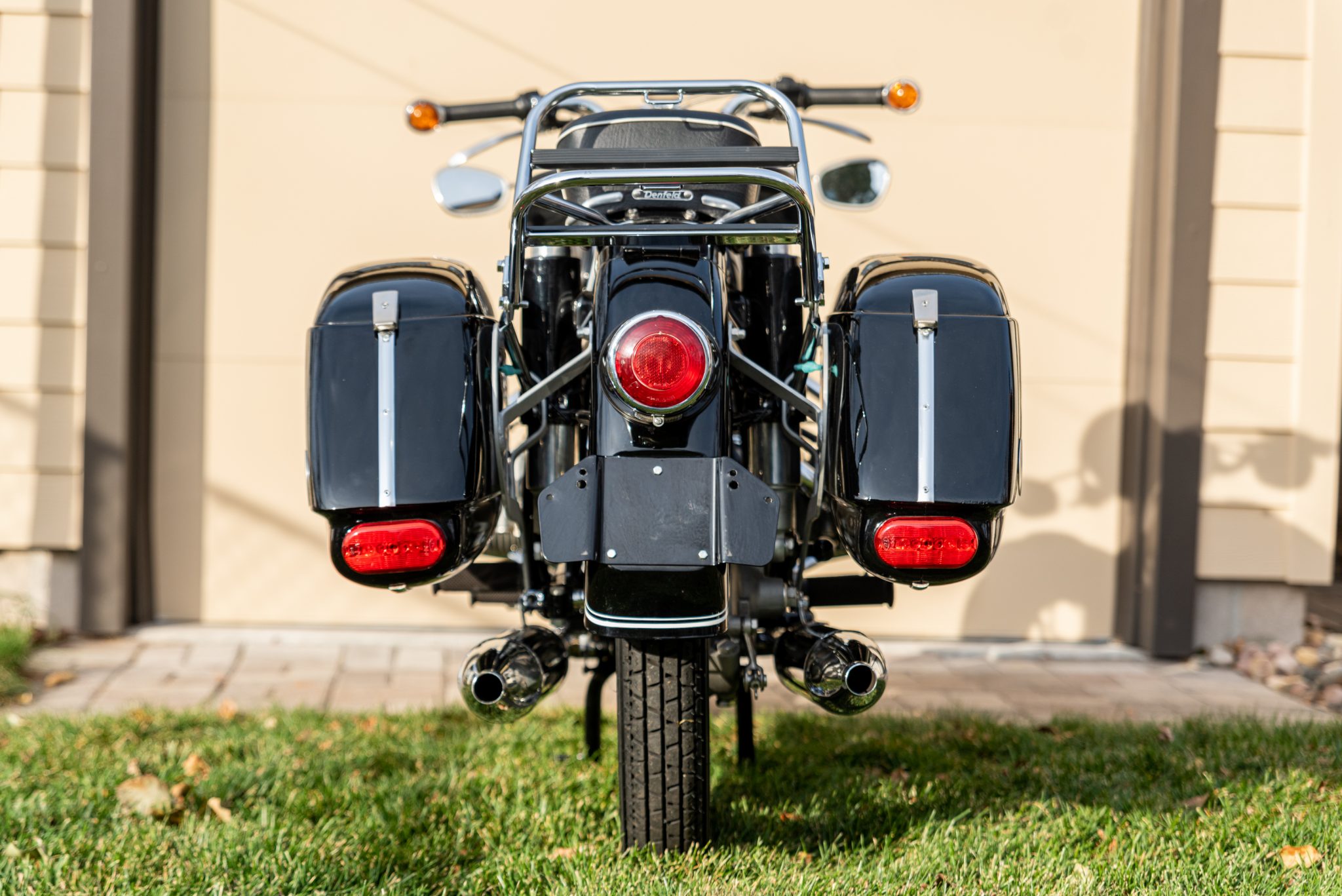 Wire-spoke wheels were mounted with 3.50-18 Metzeler Block C tires in August 2020. Replacement of the shocks for the Earles fork and rear swingarm were carried out in March 2018 using hydraulic components sourced from Bench Mark Works in Sturgis, Missouri. Braking is from drums at both ends.
