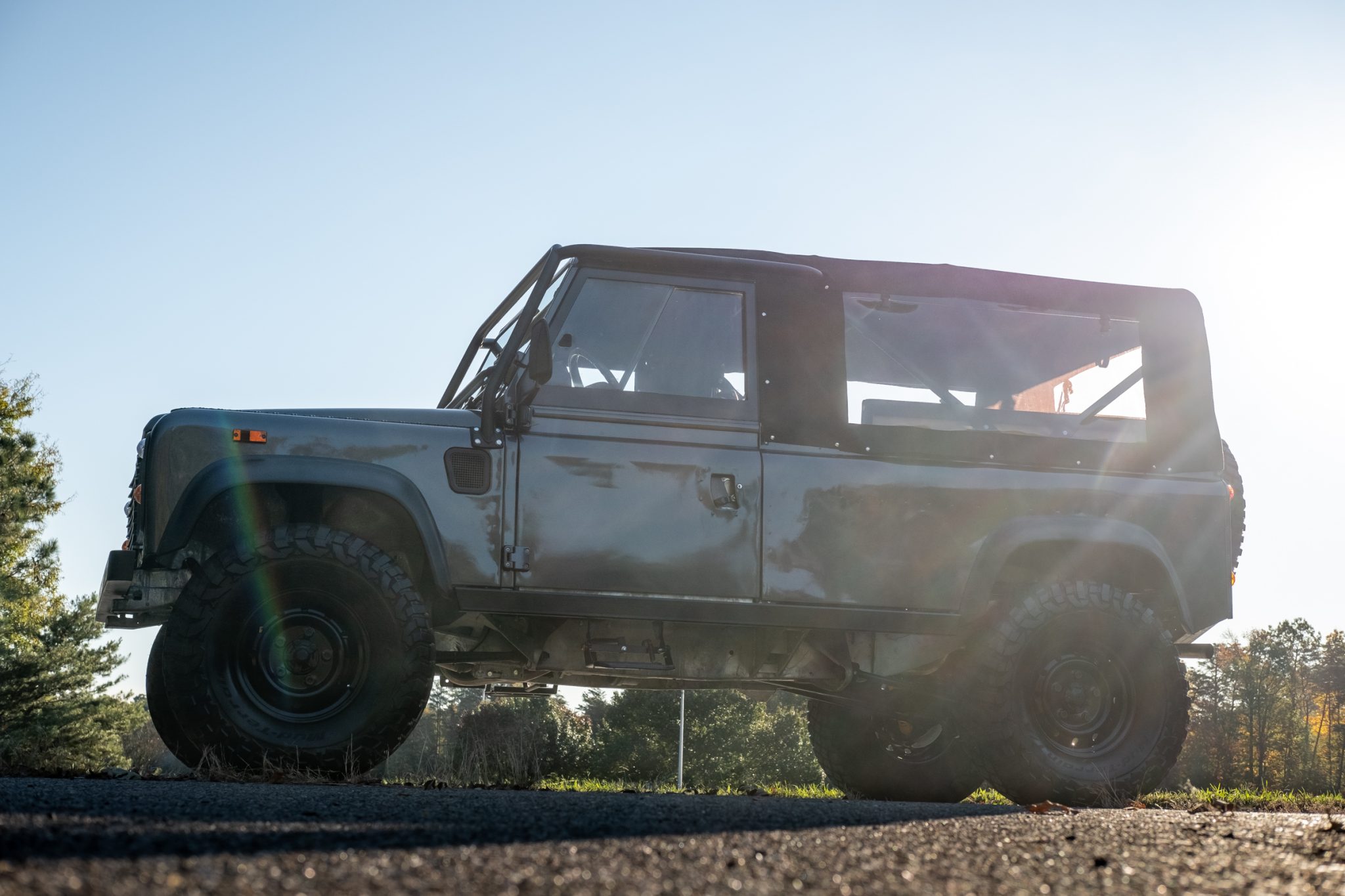 Black steel wheels wear BFGoodrich Mud-Terrain KM3 tires, including the matching spare at the rear. The seller notes tire noise when traveling at speeds in excess of 50 mph. The braking system was reportedly fitted with a new master cylinder, rotors, calipers, and lines, and replacement bushings, springs, and shocks were installed.