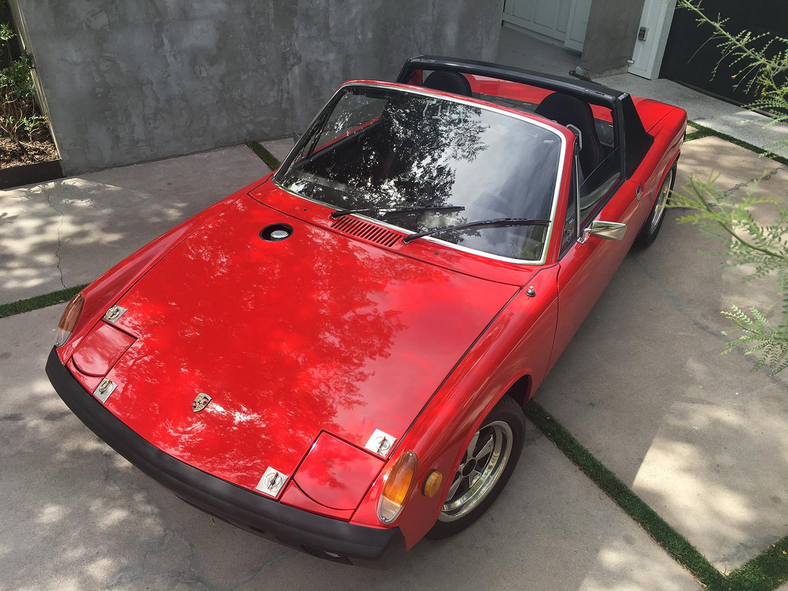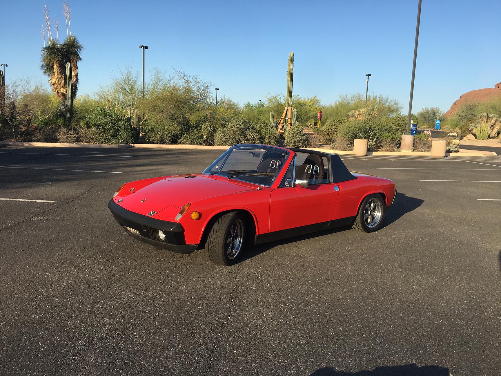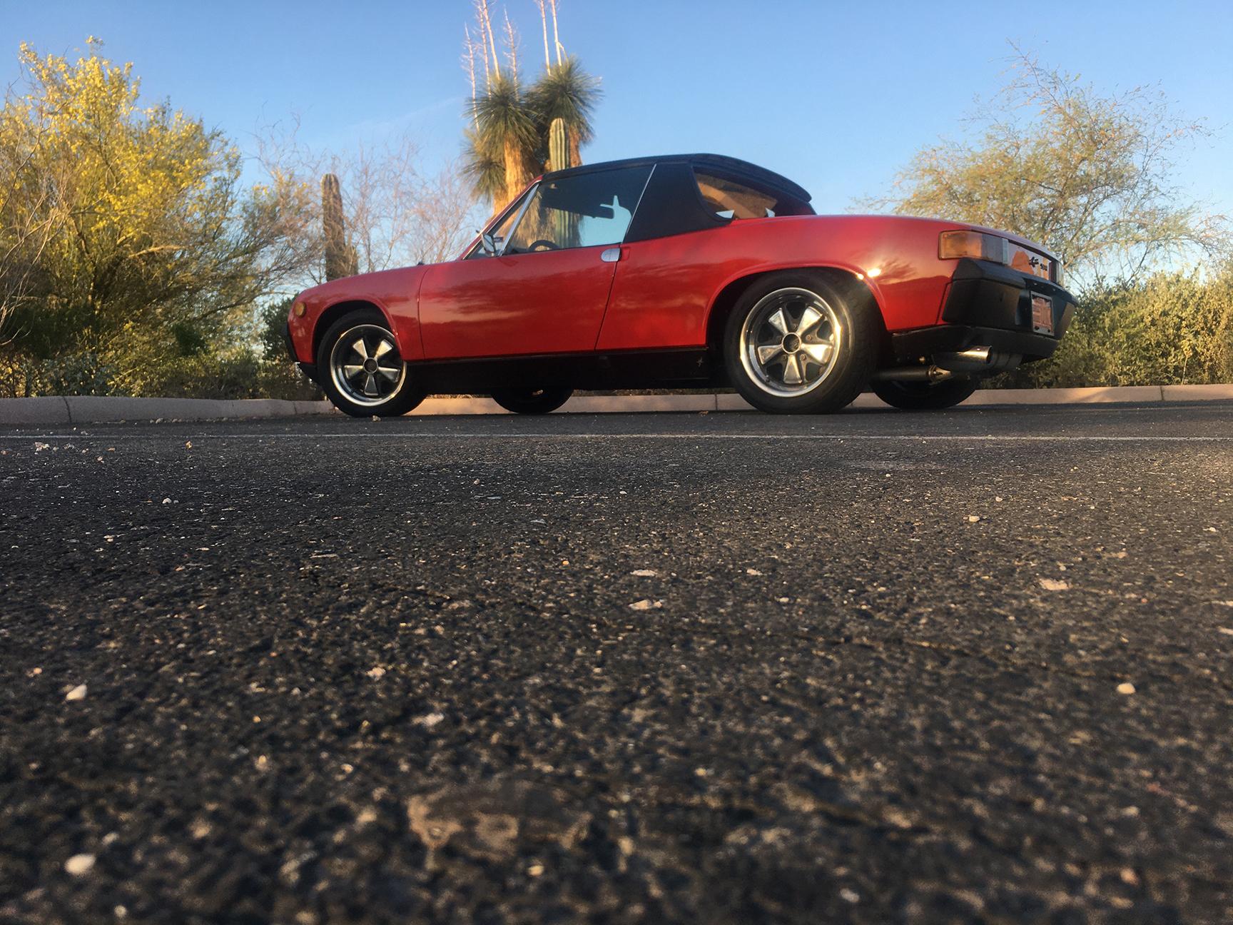 The polished 15×7” Fuchs five-lug alloy wheels are wrapped in 205/50 Nitto Neo Gen tires showing 2018 date codes. Braking is through four-wheel discs with cross-drilled rotors and 911SC calipers up front. A space-saver alloy spare is mounted in the front storage area, and scratches on the wheel lips can be seen in the gallery. Suspension modifications include the following: