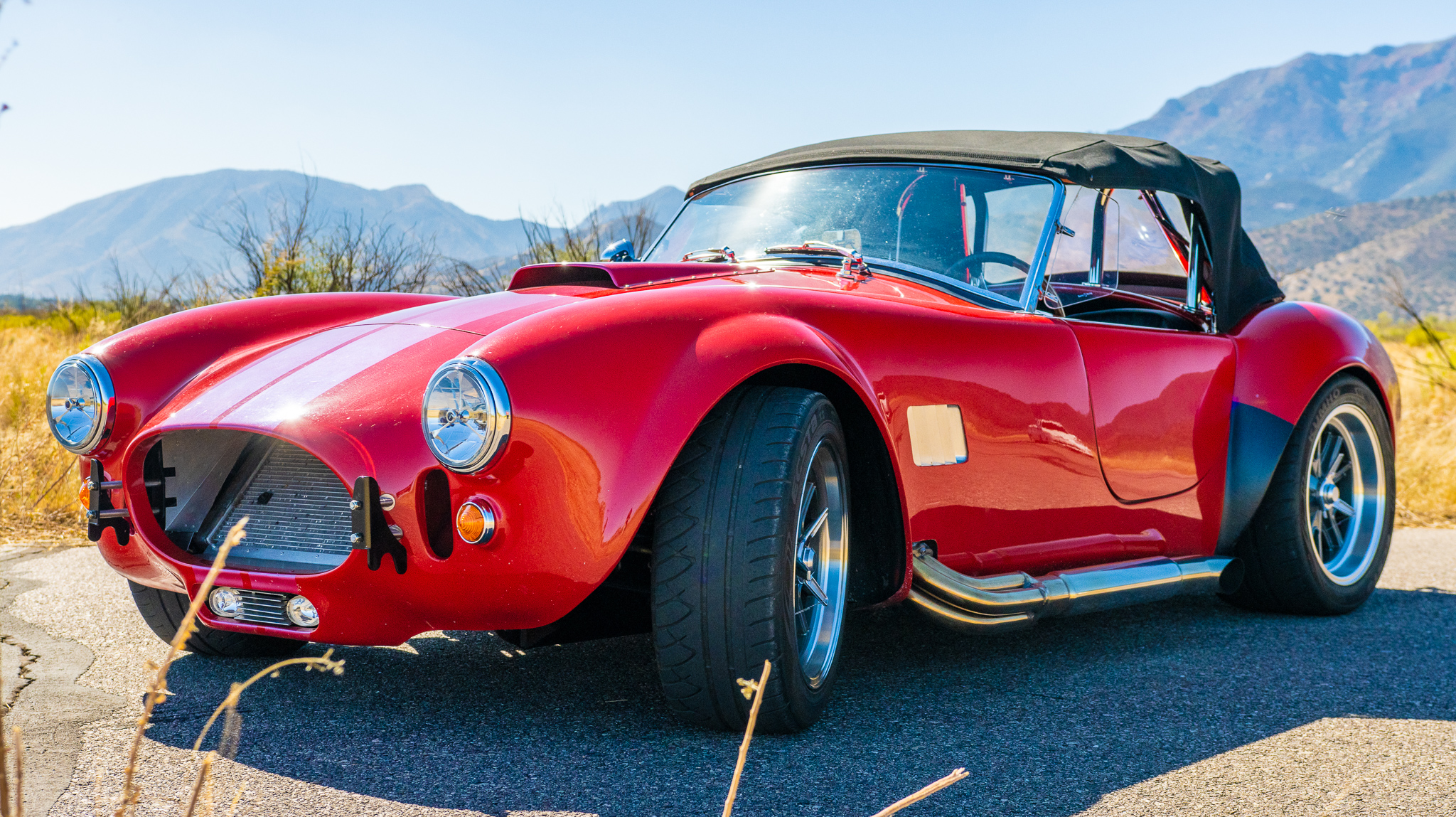 17″ Halibrand-style wheels with simulated knock-offs wear Kumho Ecsta tires measuring 245/45 up front and 315/35 out back and showing a mix of date codes. Disc brakes with heavy-duty pads are fitted at all four corners.