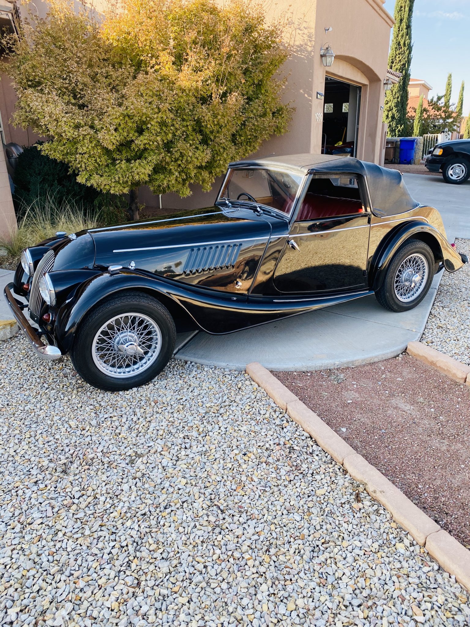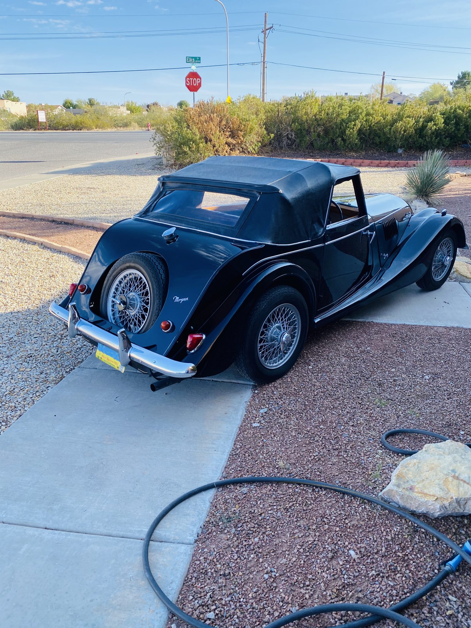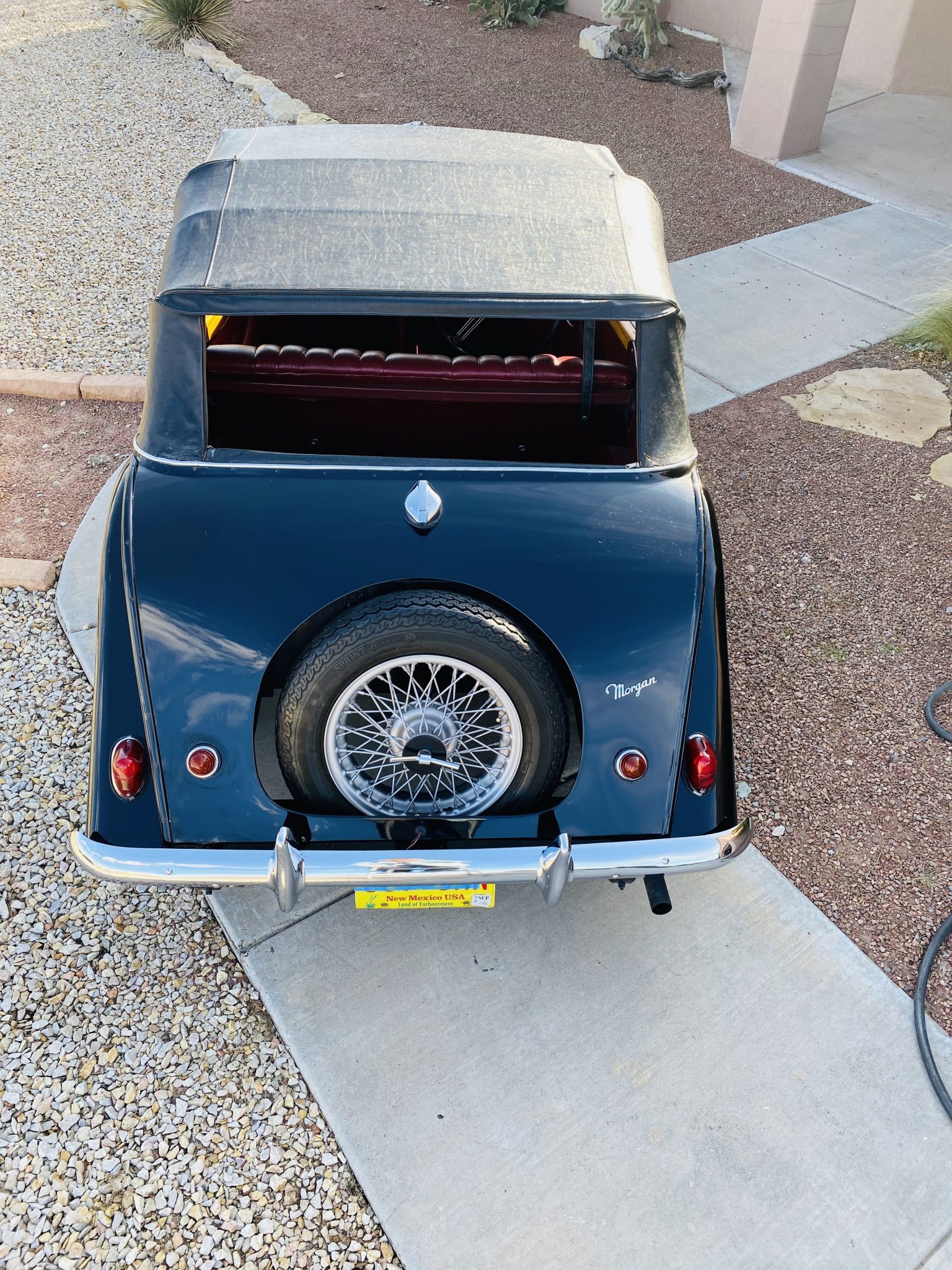 The 15″ knock-off wire wheels are wrapped in Sprint Classic tires, and a matching spare is mounted to the rear. Braking is provided by discs up front and drums out back.
