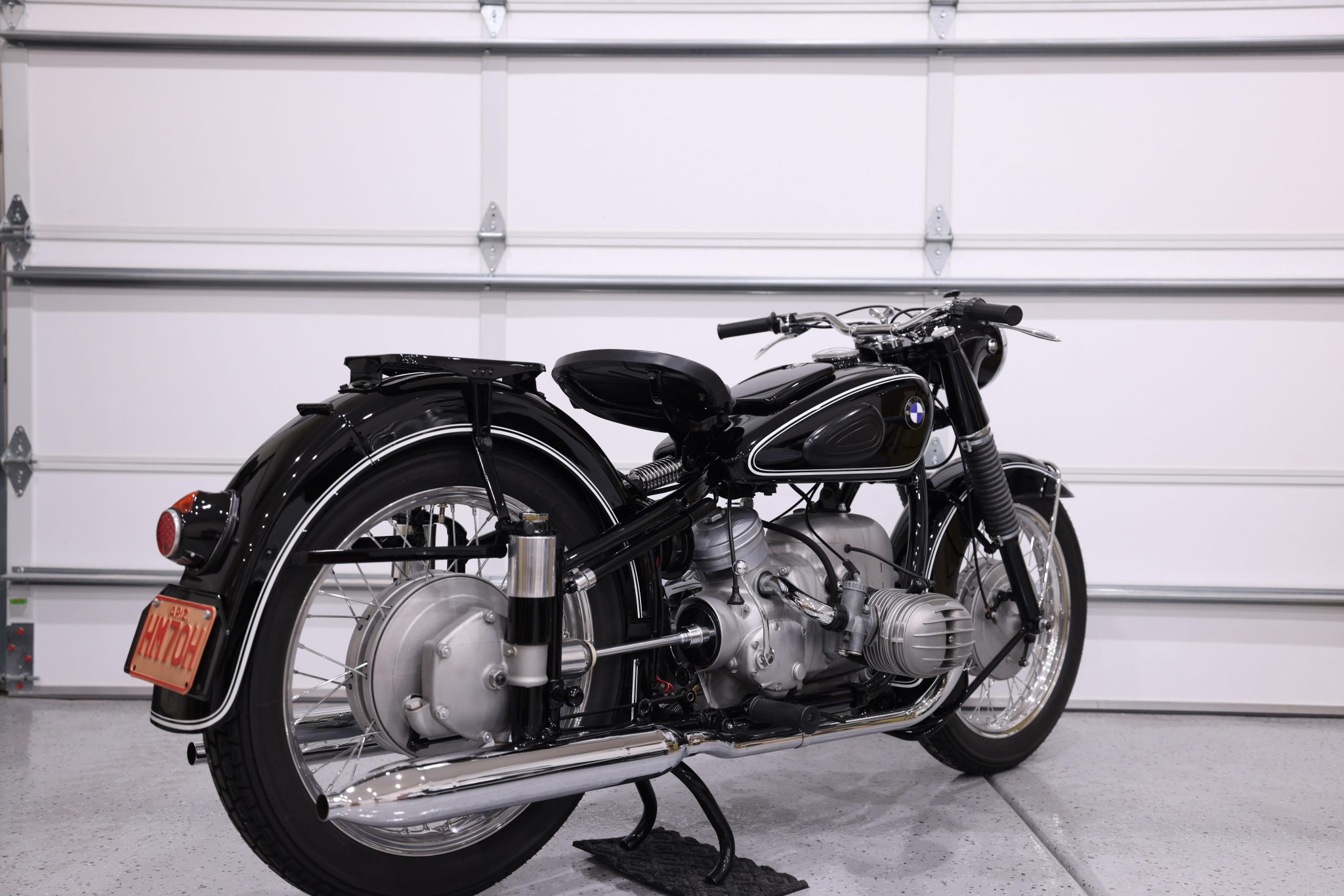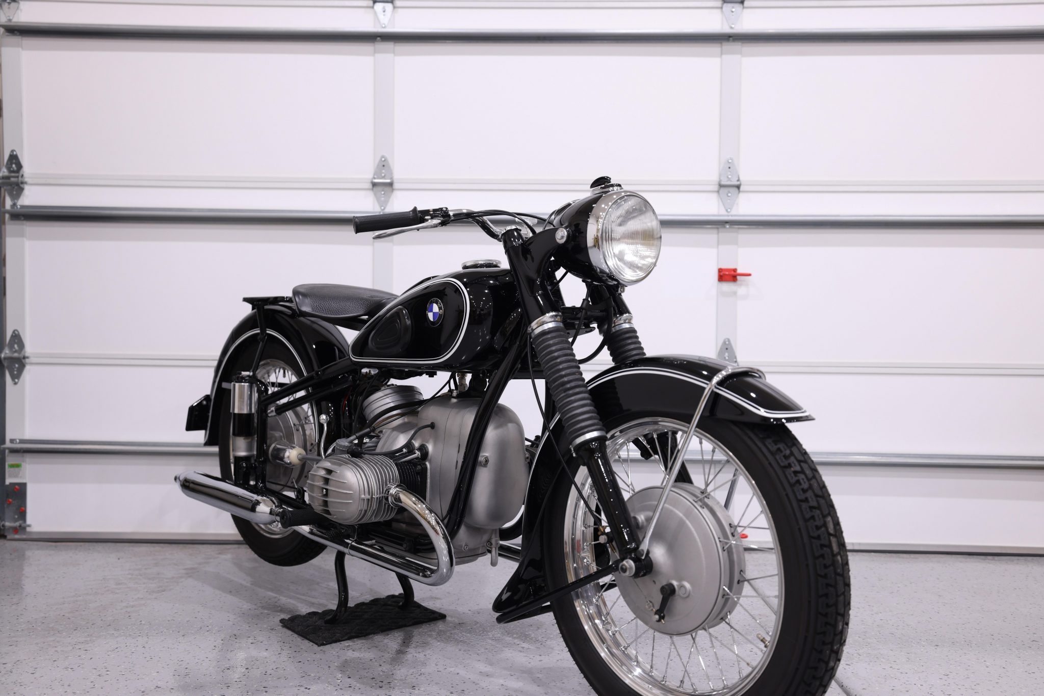 The wheels were fitted with rebuilt hubs and chrome spokes during the 2009 work, while new period-style tires are said to have been mounted in 2019 under previous ownership. Suspension consists of a rebuilt conventional fork with black rubber gaiters as well as dual plunger shocks in the rear. Braking is from drums with relined shoes at both ends.