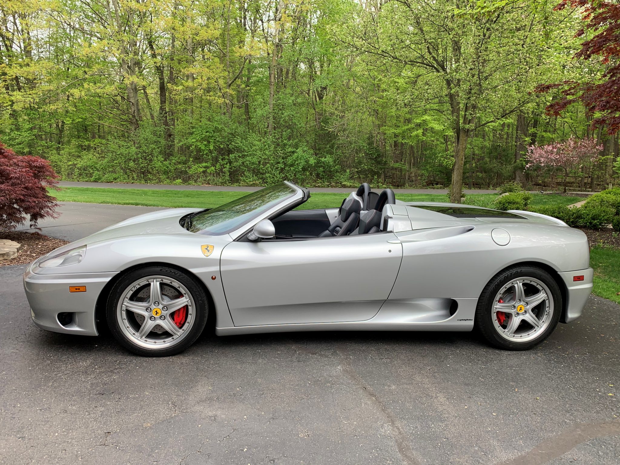 Optional 18″ modular wheels are mounted with Continental ExtremeContact tires. Braking is handled by cross-drilled rotors with red calipers. Originally dark blue, the convertible top was replaced with a black version under previous ownership.