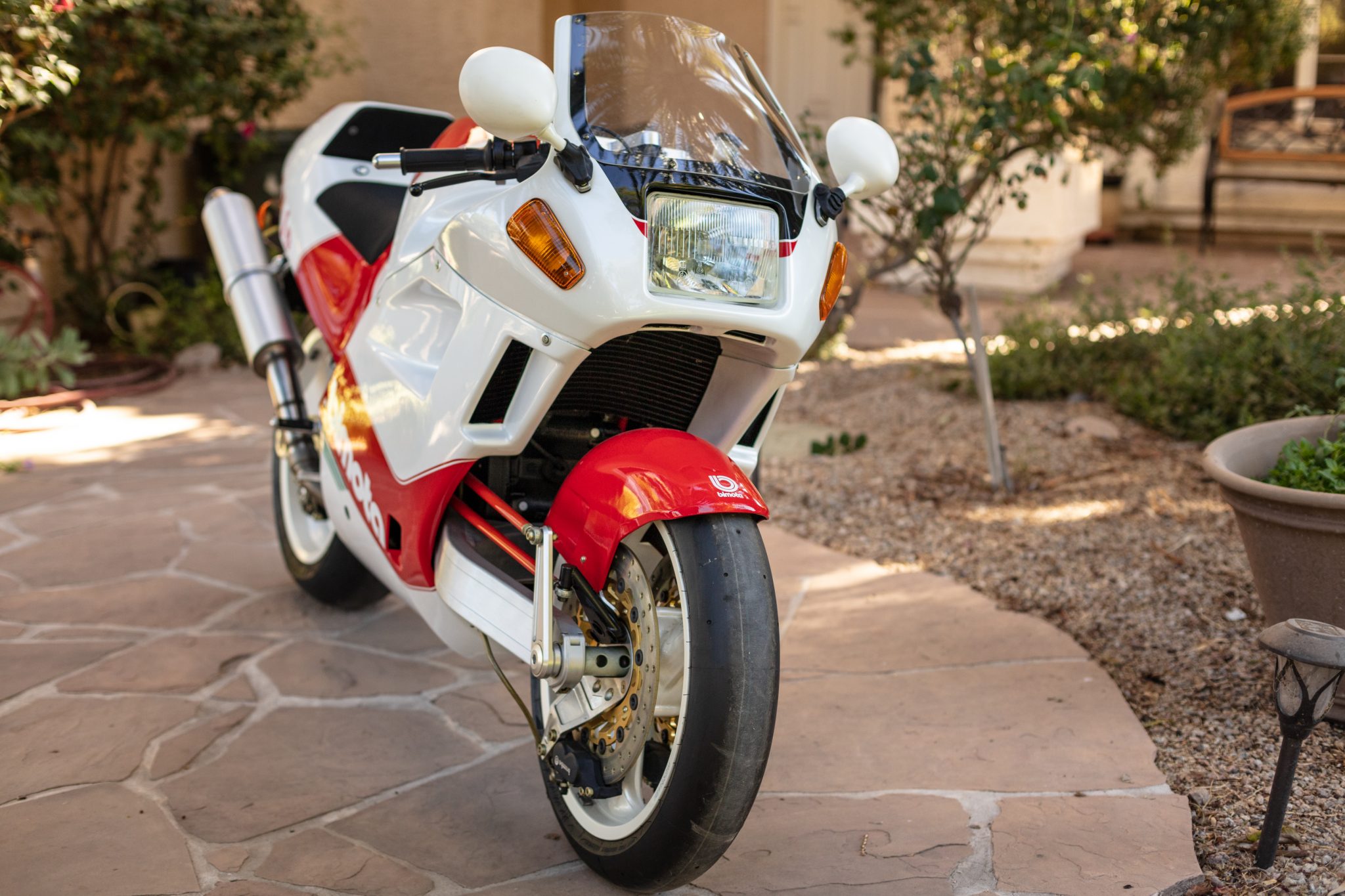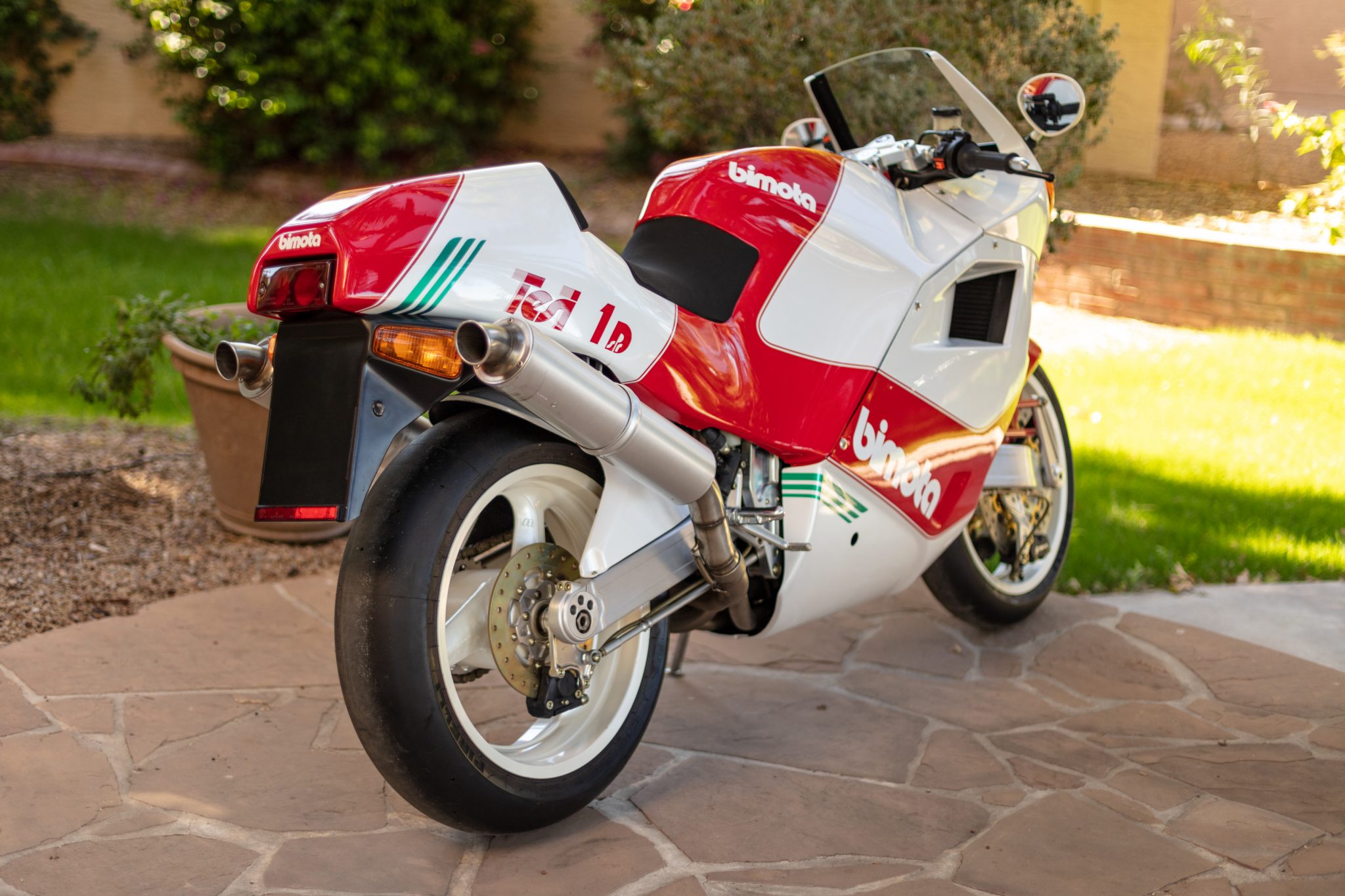 White three-spoke Marchesini wheels wear Pirelli racing slicks. Suspension consists of Marzocchi monoshocks mounted to double-sided swingarms at either end, with the front also featuring hubcentric steering linkages. Triple Brembo disc brakes retain a yellow zinc coating, and feature Tesi-specifc front rotors as well as unfilled fluid reservoirs.