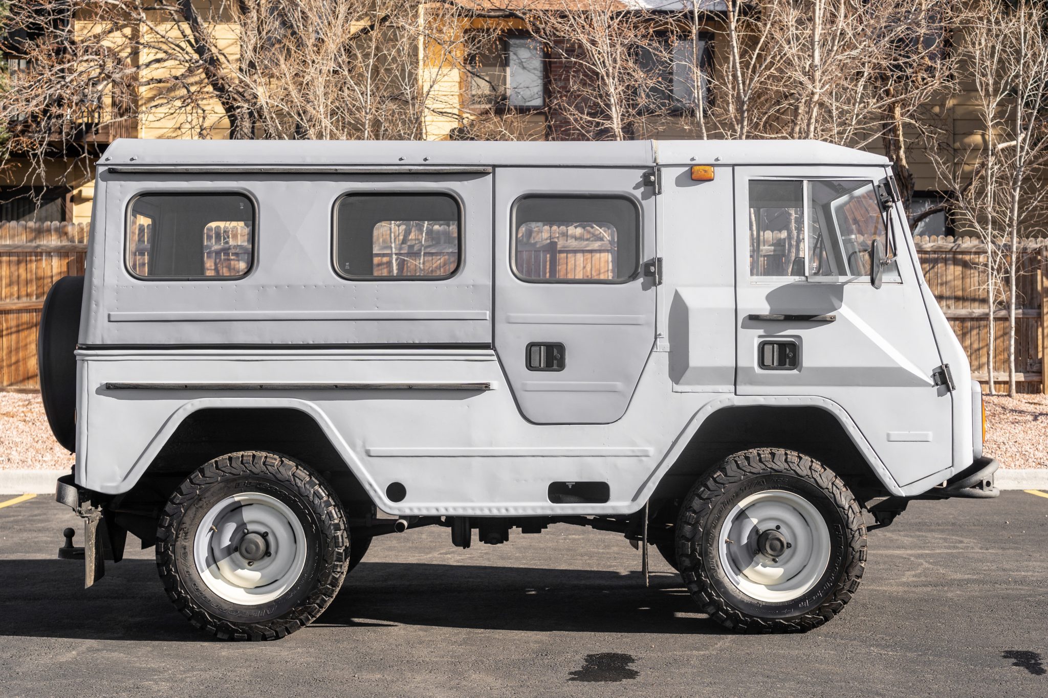 White-painted 16” steel wheels feature gray accents and are wrapped in 245/75 BFGoodrich All-Terrain KO2 tires that show date codes from 2011. A matching full-size spare is mounted to the rear door and is protected by a hard plastic and vinyl cover with Volvo lettering.