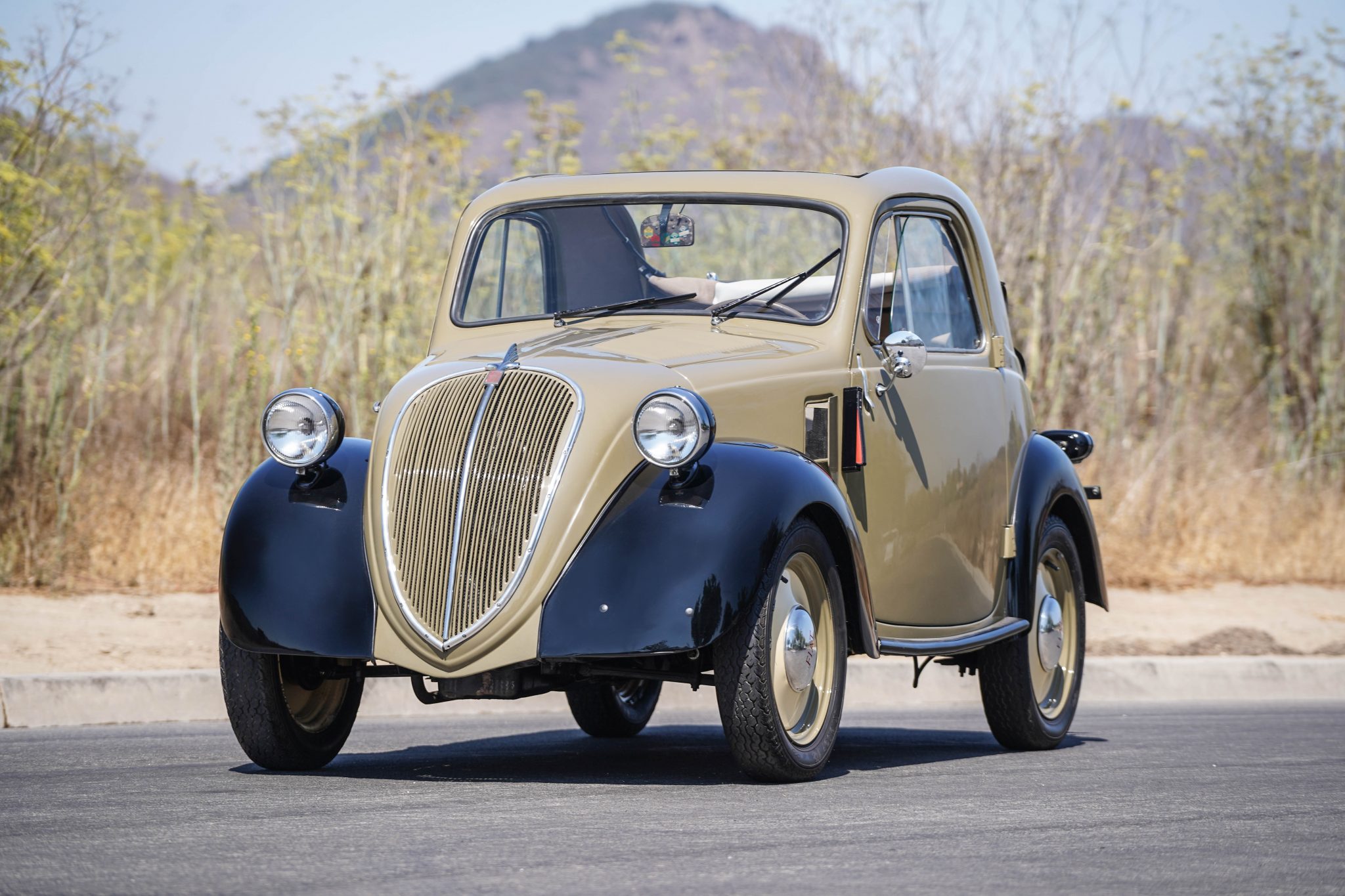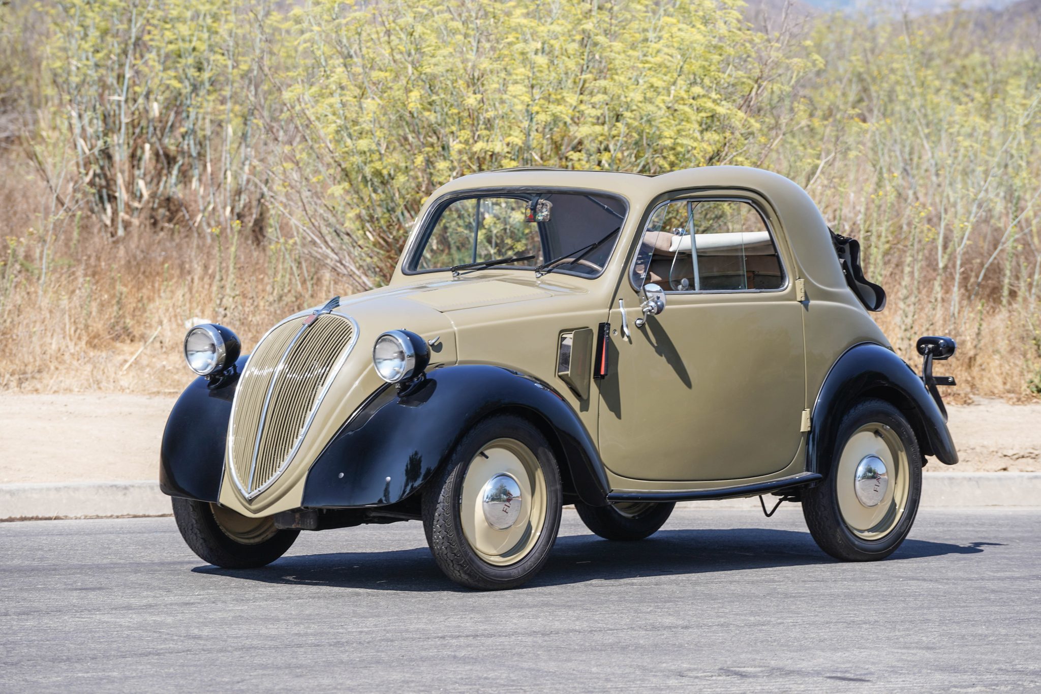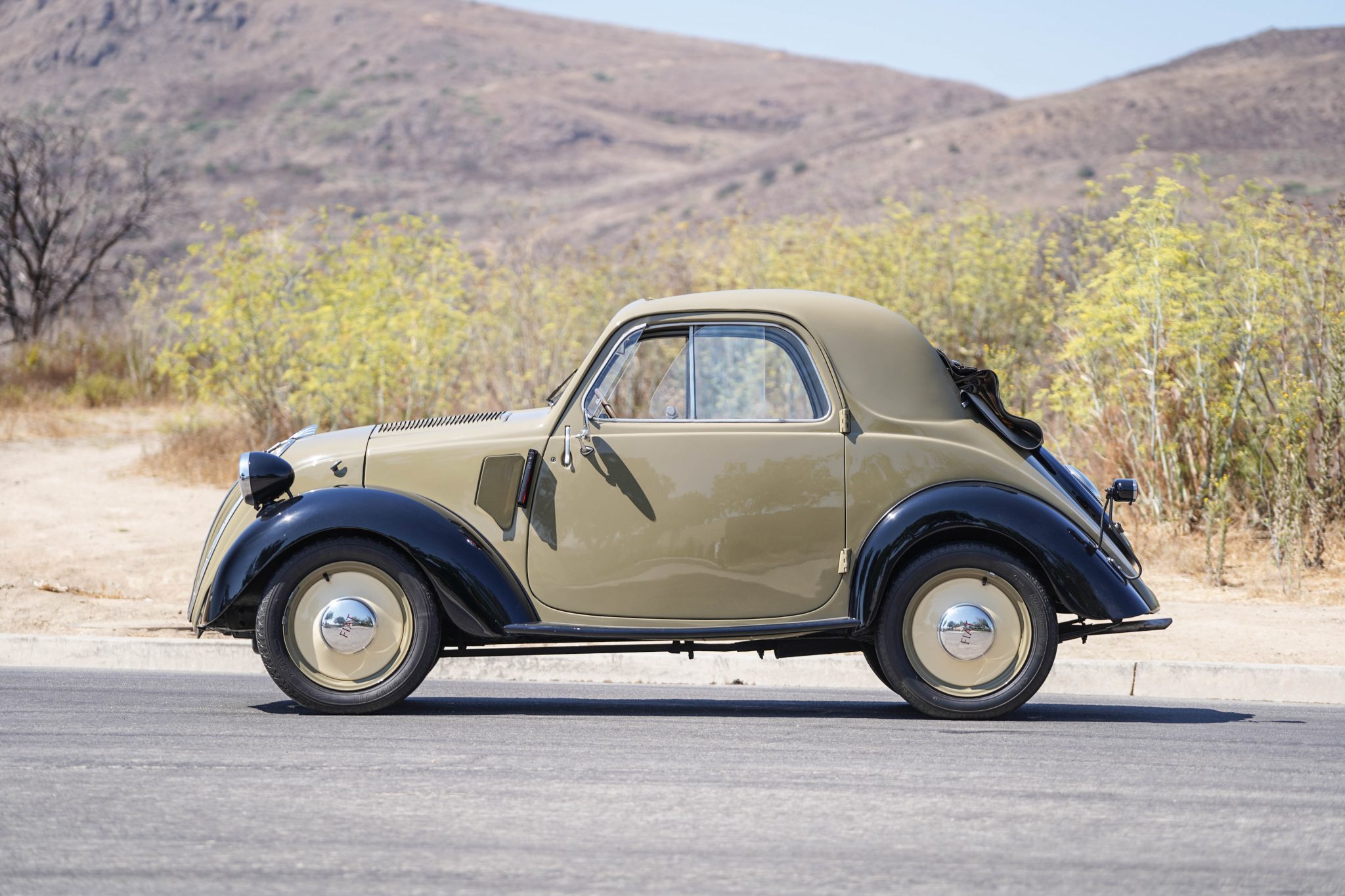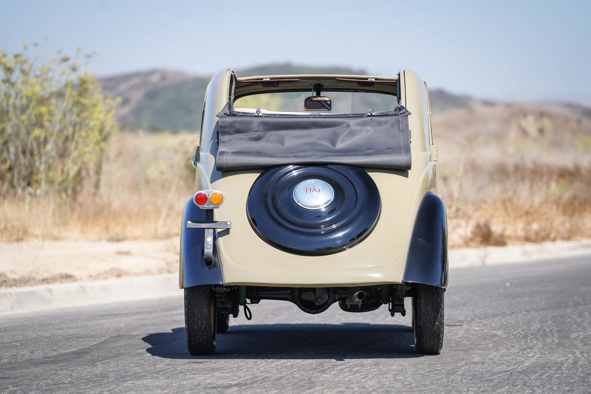 15″ steel wheels feature lighter tan centers with body-color lips and are fitted with Fiat-branded hubcaps and Kleber V12 tires. Braking is handled by four-wheel drums that were serviced in preparation for sale.