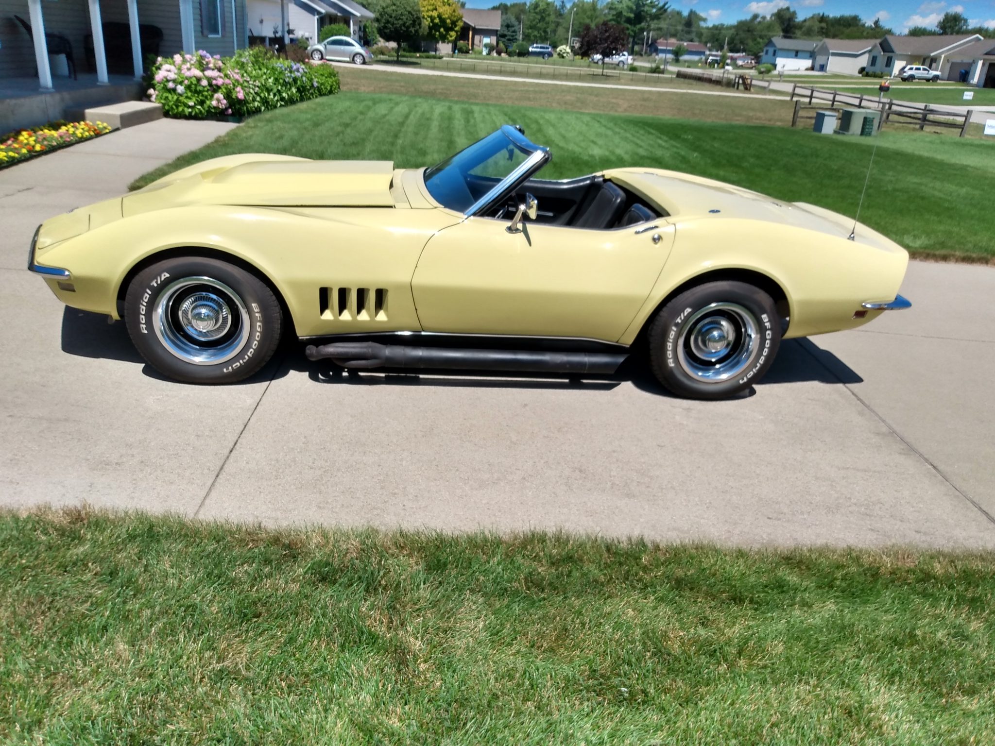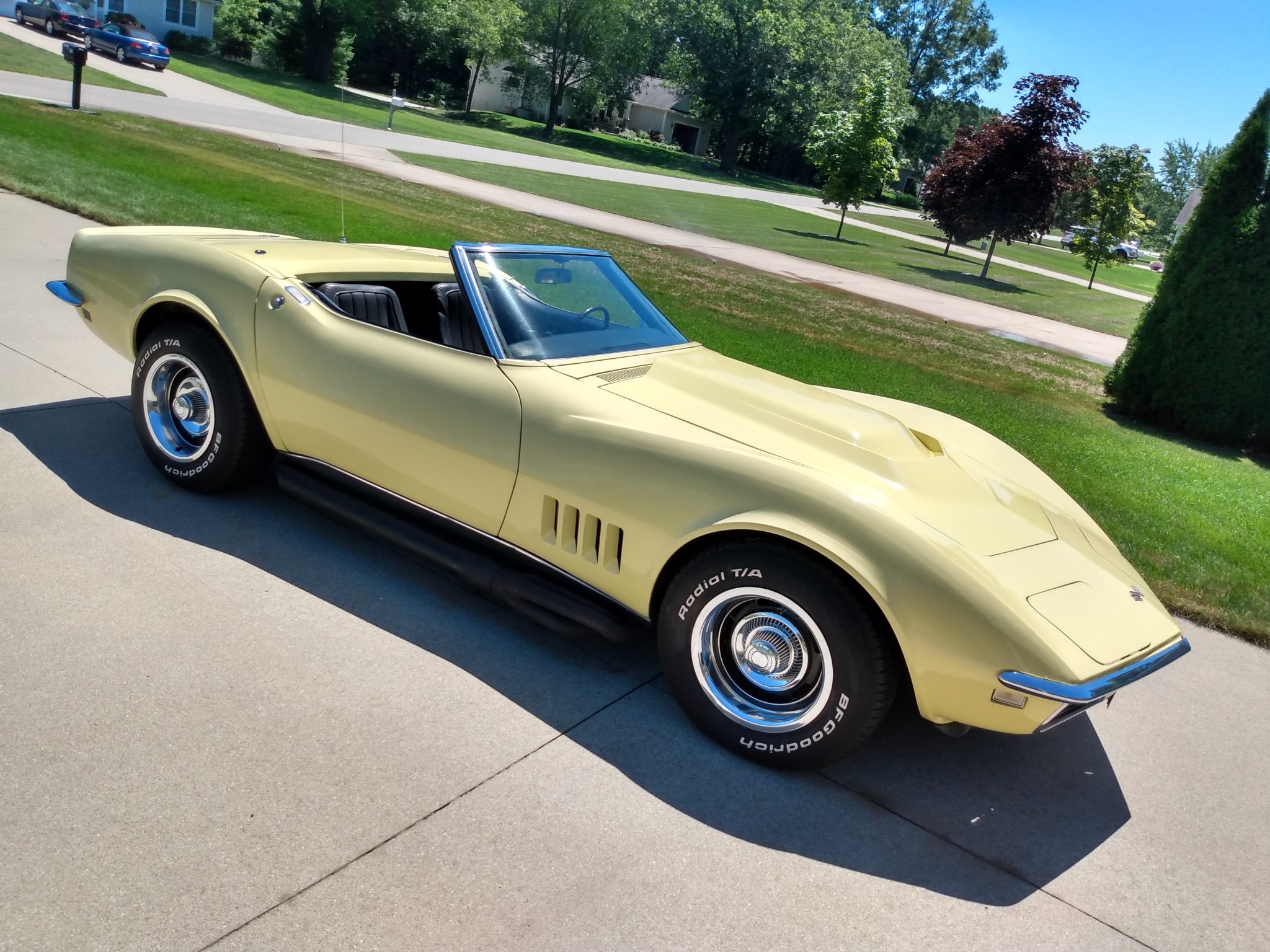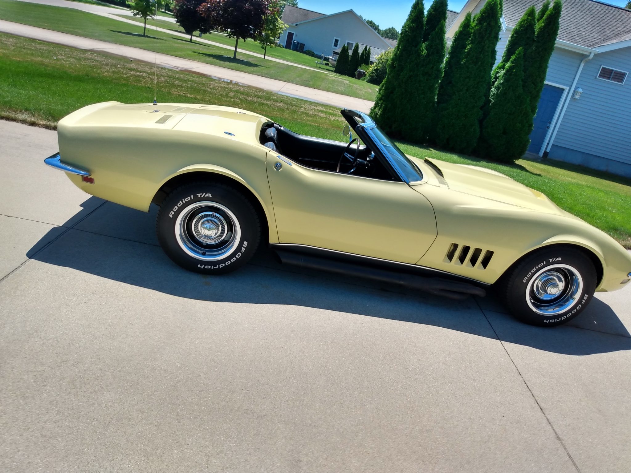 15″ Rally wheels with chrome trim rings and center caps wear BFGoodrich Radial T/A tires mounted in 2005. The seller notes leaking rear brakes and that the emergency brake does not work. An aftermarket hardtop is included in the sale.