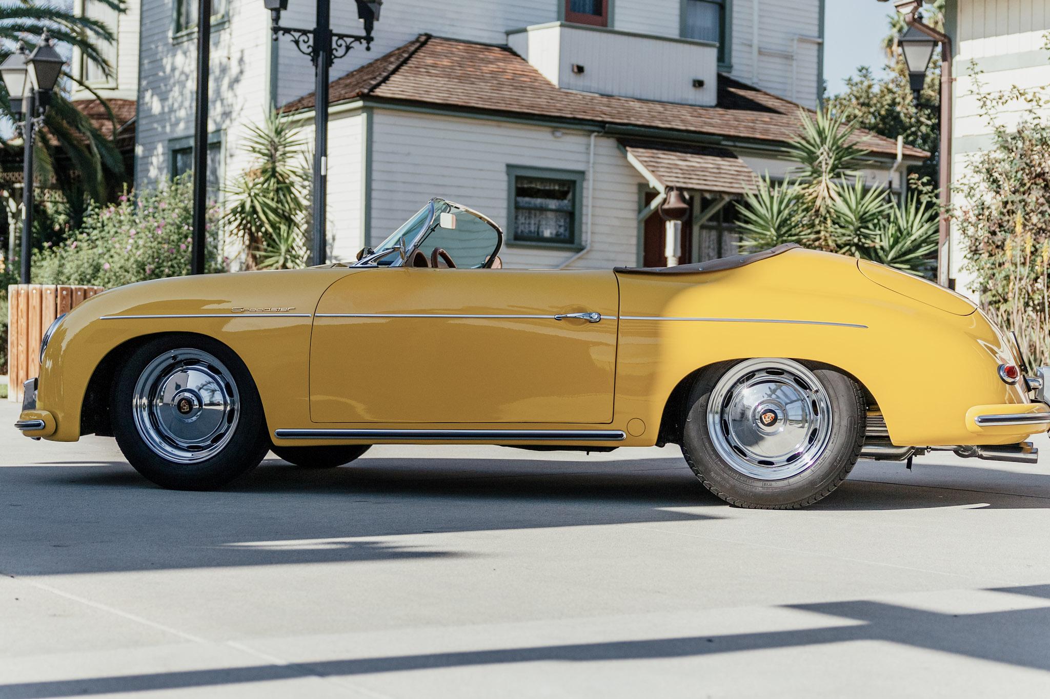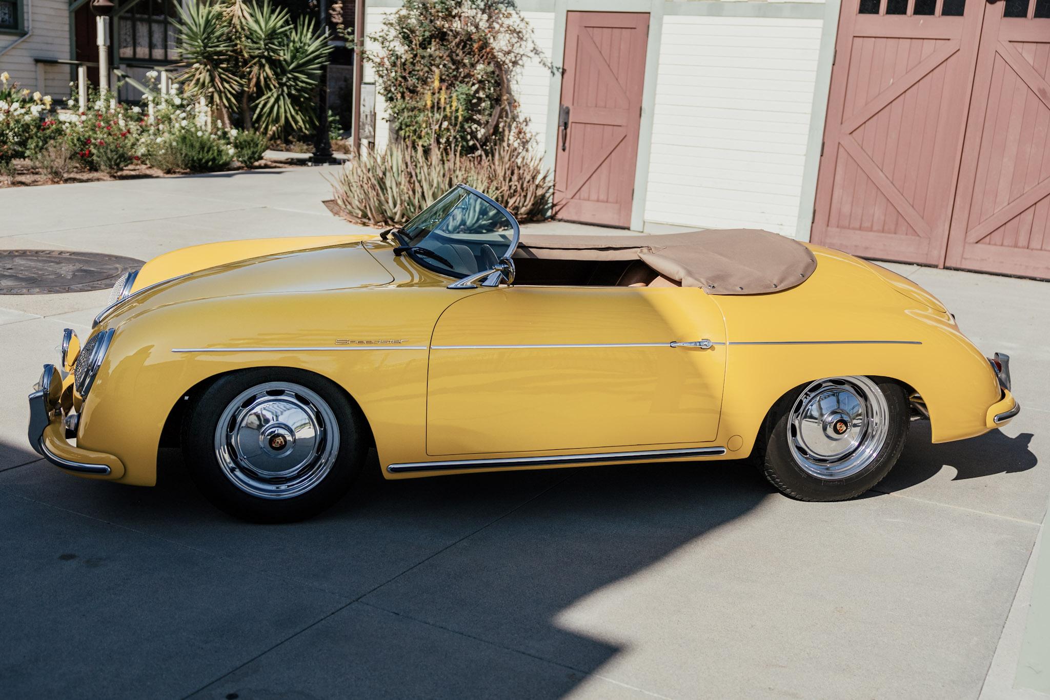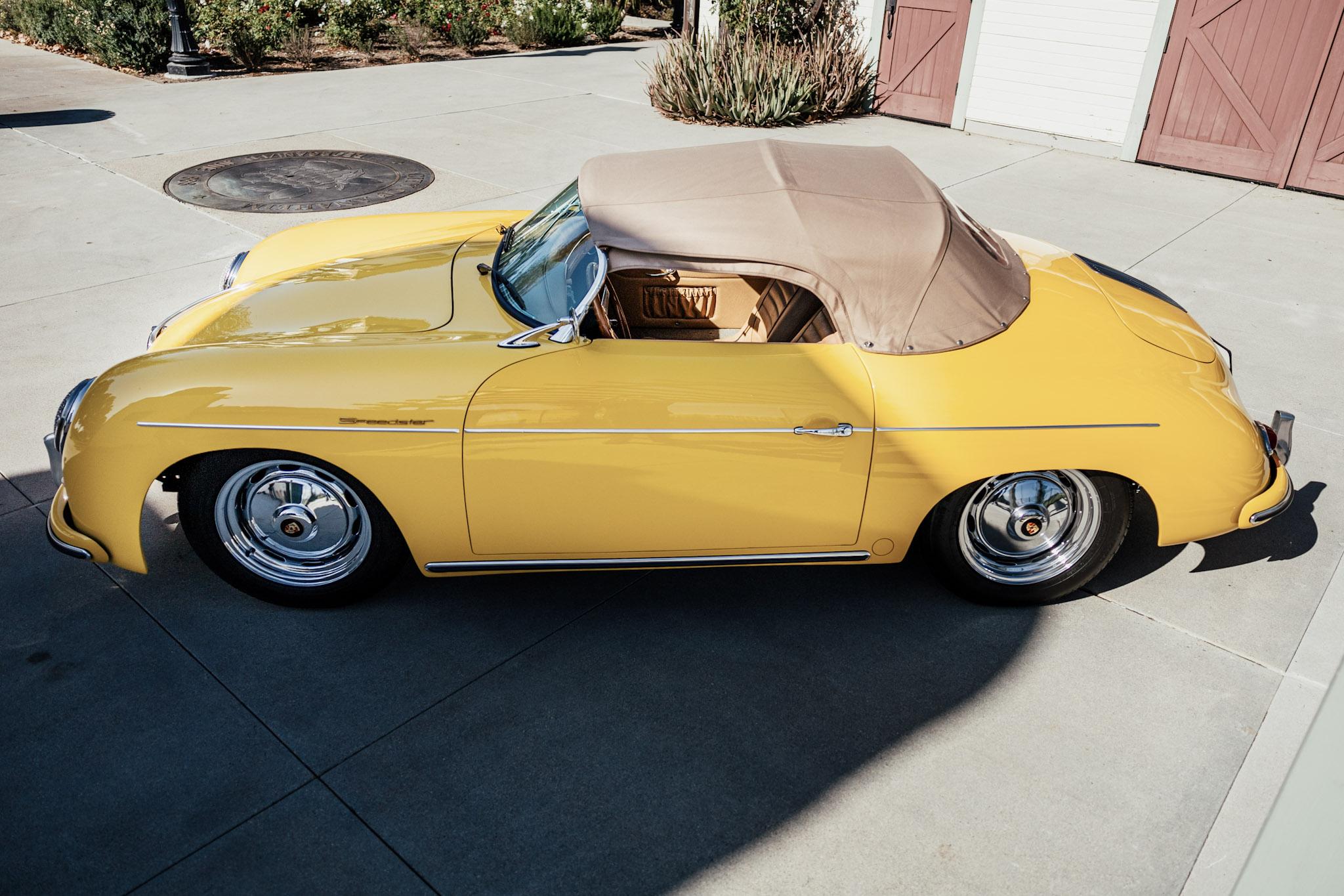 The removable tan soft top is shown mounted above, and side curtains as well as a full tonneau cover will also accompany the car. Chrome 15″ steel wheels are fitted with matching hubcaps.