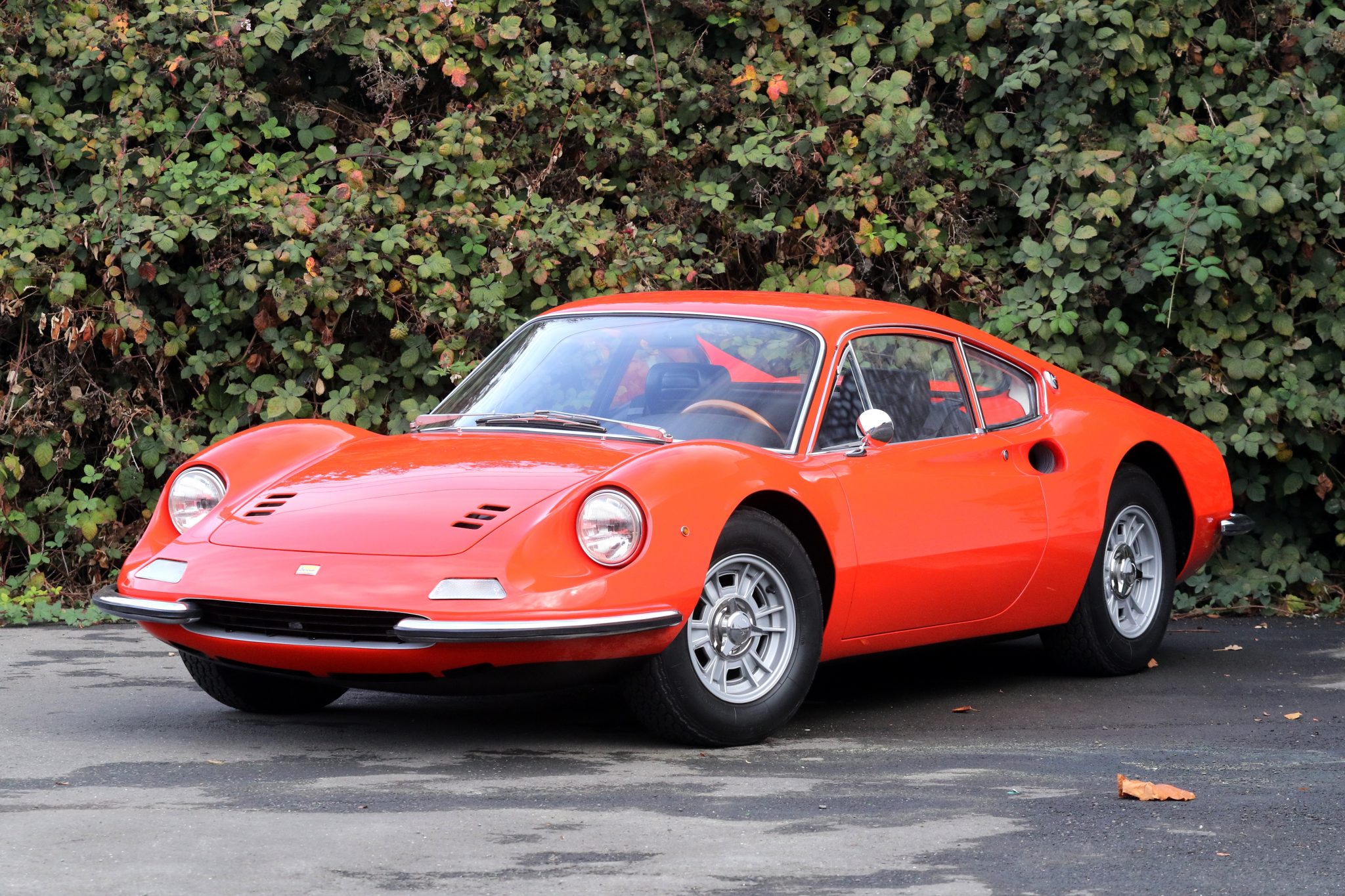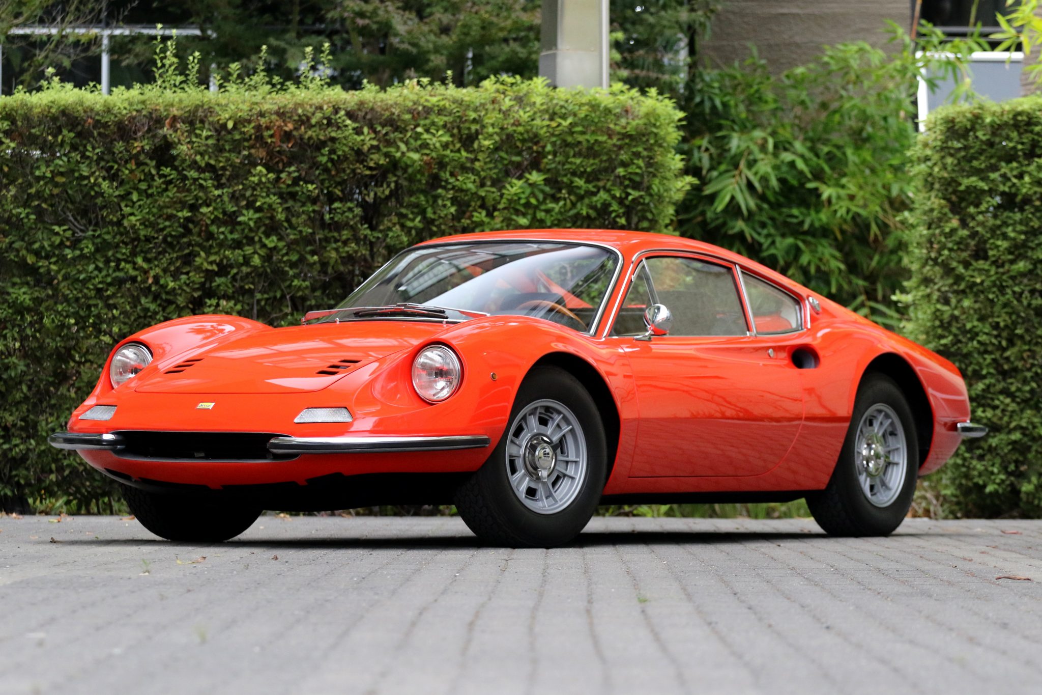 During its restoration, this car was disassembled and prepped by Boston Sportscar Company before being sent to Rex Nguyen Restorations in California for further detail work. The body was placed on rotisserie and stripped to bare metal so that repairs could be carried out on the aluminum panels and steel underpinnings. It was then primed and refinished in its original shade of Rosso Dino using single stage PPG paint along with DU5 hardener and PPG reducer. The seller notes that the driver’s side of the engine lid sits proud of the adjacent body panel, and that wiper marks can be seen on the windshield.
