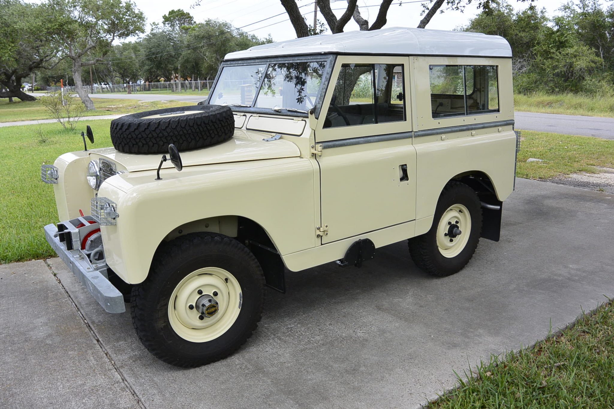 Tan-finished 16″ steel wheels are fitted with 235/65 Dunlop R/T Radial Rover tires at each corner. The truck is equipped with manually locking Warn front hubs, and a spare wheel is mounted on the hood. The seller notes that the brake cylinders were rebuilt and that the master cylinder, brake drums, brake shoes, and brake lines were replaced.