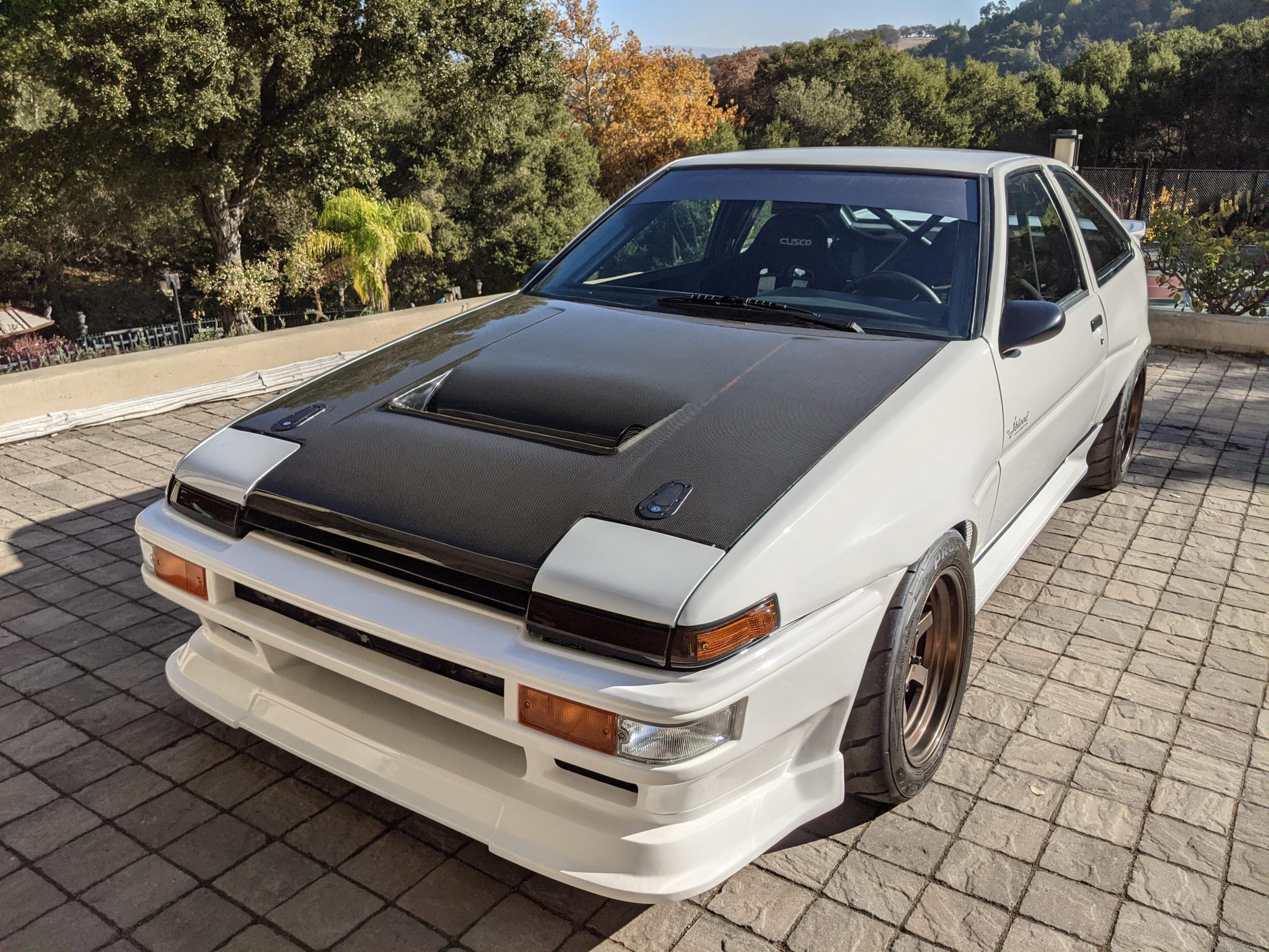 The bronze-finished 15” Volk TE37V wheels are said to have been installed last year and are wrapped in Toyo Proxes R888R tires sized 205/50 up front and 225/50 out back. Stopping power is provided by ventilated discs paired with Wilwood monobloc calipers up front. A hydraulic handbrake has been installed, and suspension and steering modifications are said to include the following: