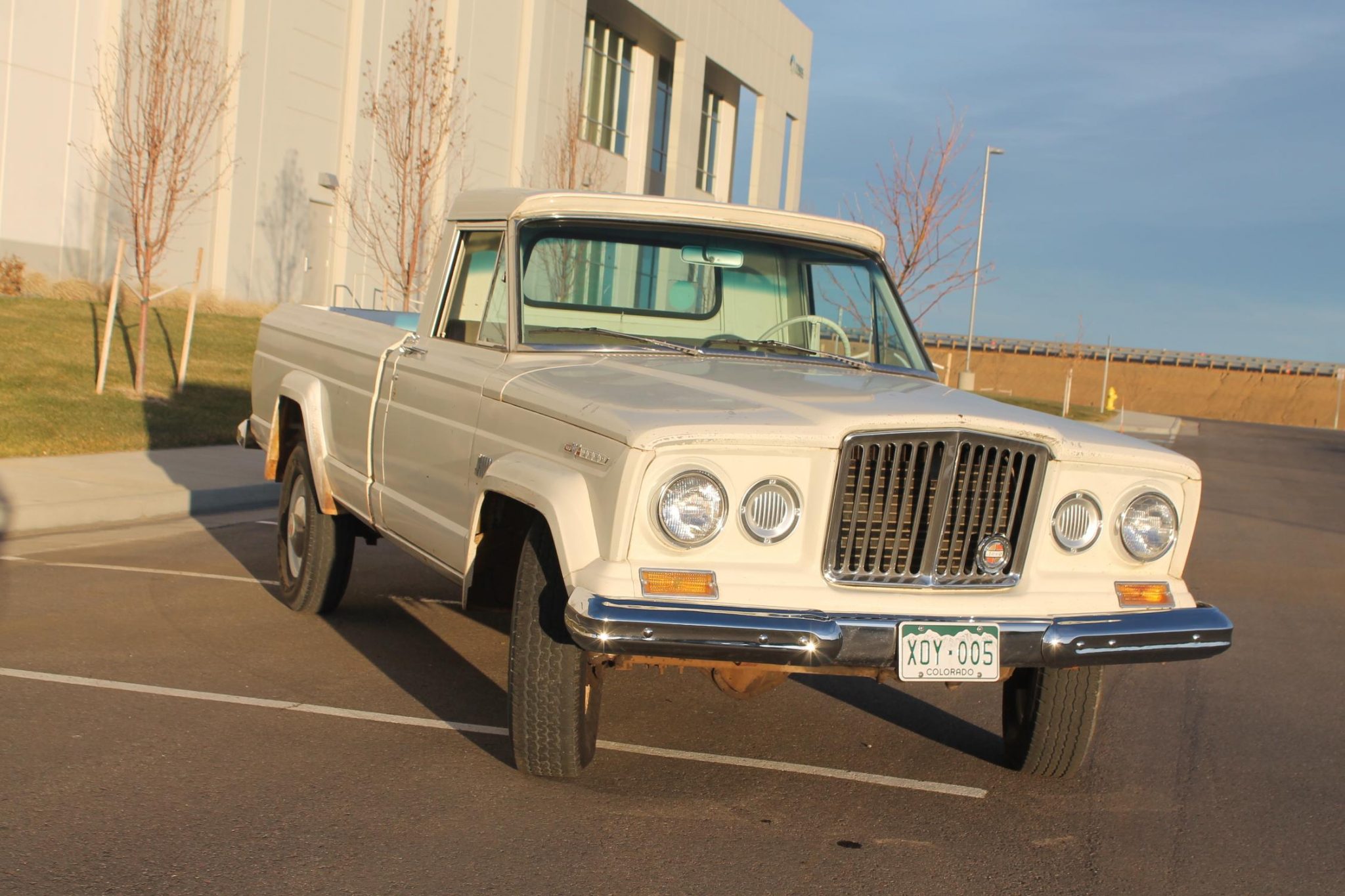 Color-coordinated 16″ steel wheels wear 215/85 Michelin LTX A/S tires that have visible sidewall cracks. Factory power steeing and Warn locking front hubs are fitted, and braking power is supplied by unassisted four-wheel drums.