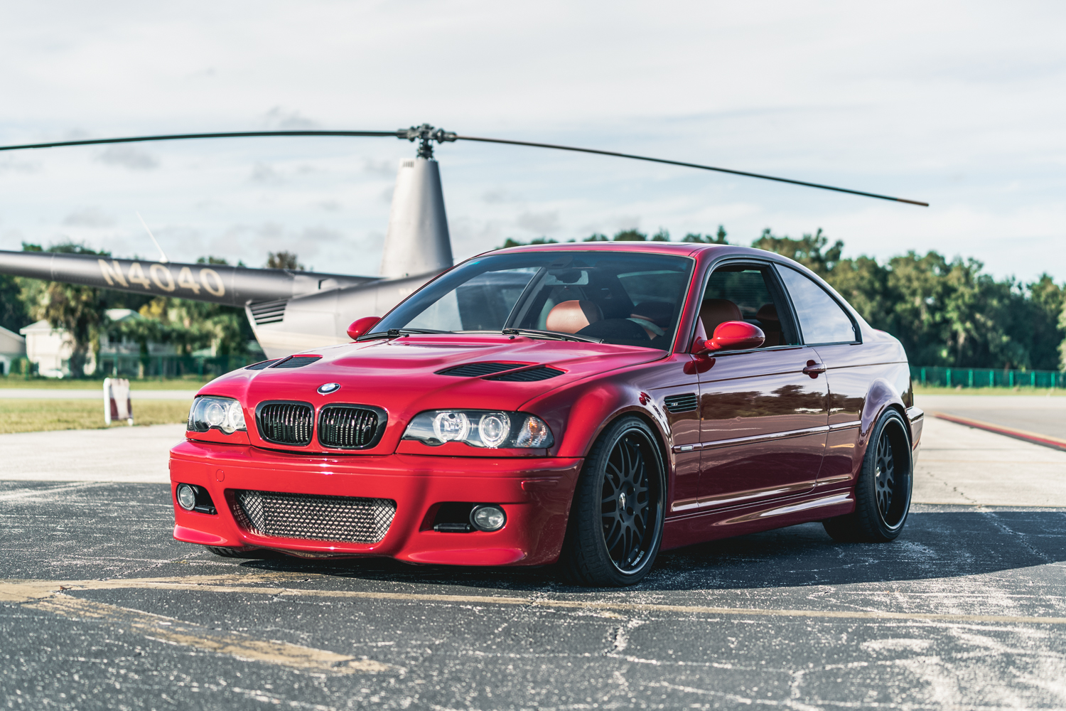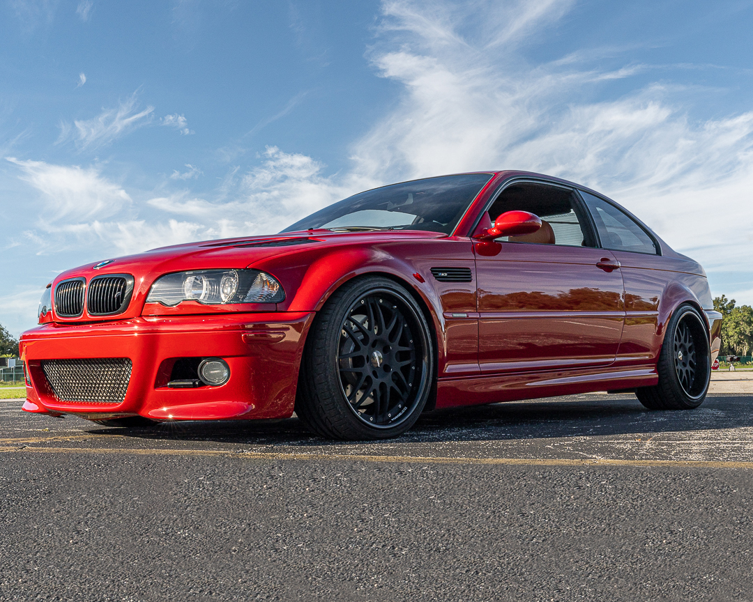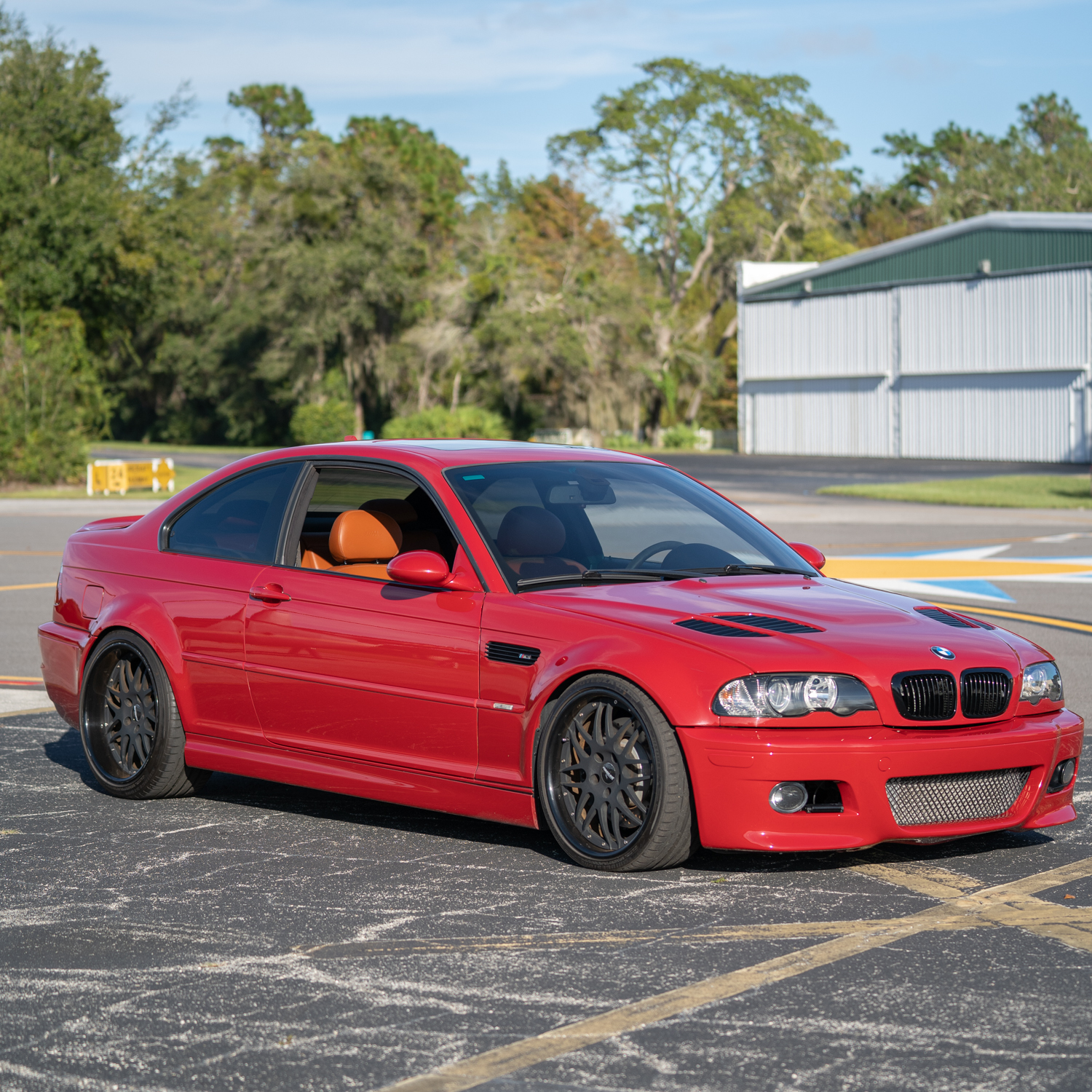 Black 19″ Forgeline wheels wear Bridgestone Potenza tires. The ZCP Competition Package added larger cross-drilled brake rotors and a quicker steering ratio than the standard M3. A subframe reinforcement kit has reportedly been installed, and an aftermarket rear strut tower brace, adjustable rear control arms, Eibach sway bars, and KW shocks and springs are also fitted.