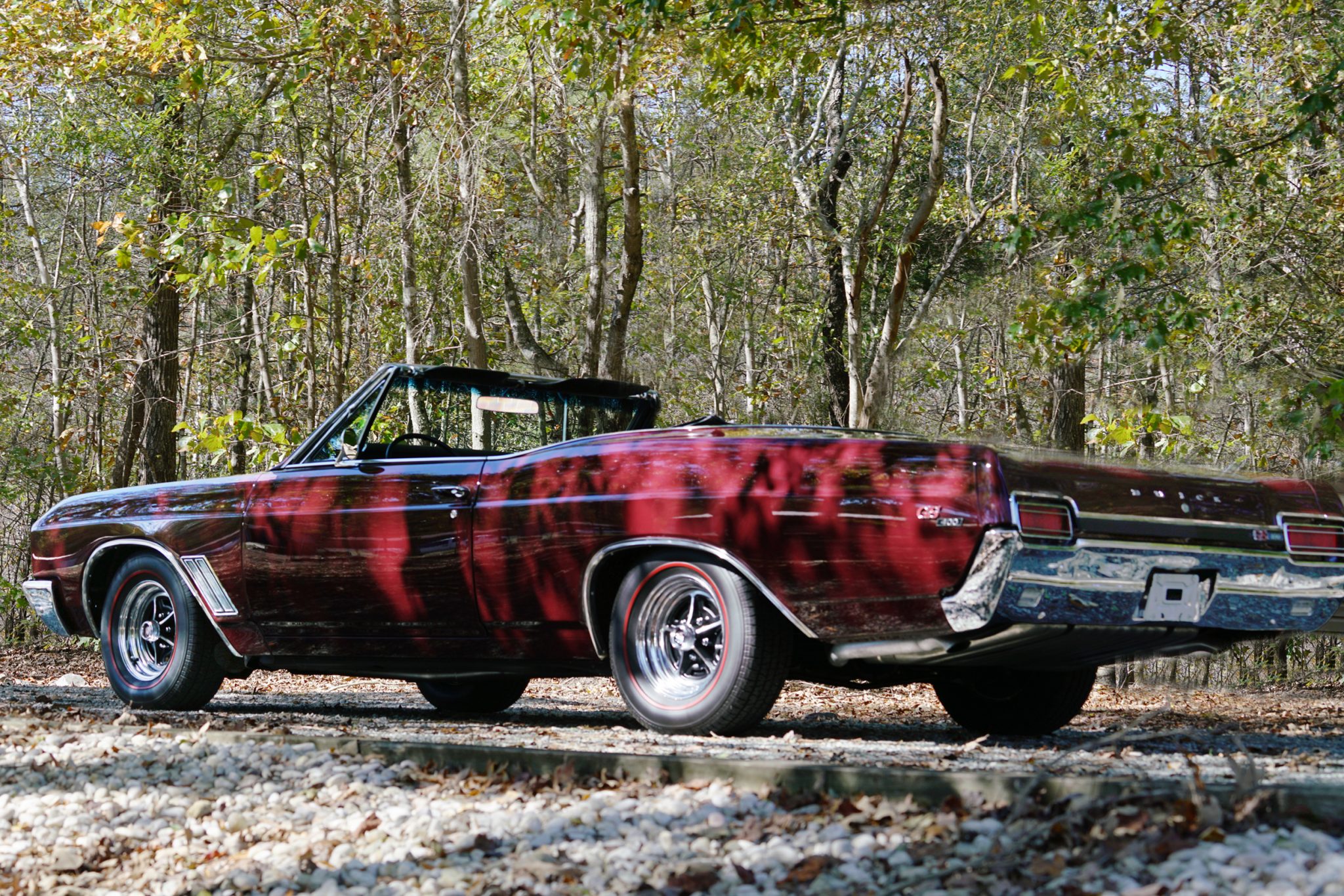 Chrome-finished 14″ Rallye wheels feature black-painted pockets and wear 225/70 BFGoodrich Radial T/A red-stripe tires that the seller states were installed in 2014, and a matching spare wheel and tire are stored in the trunk. The car is equipped with power steering and power-assisted front vented disc and rear drum brakes.
