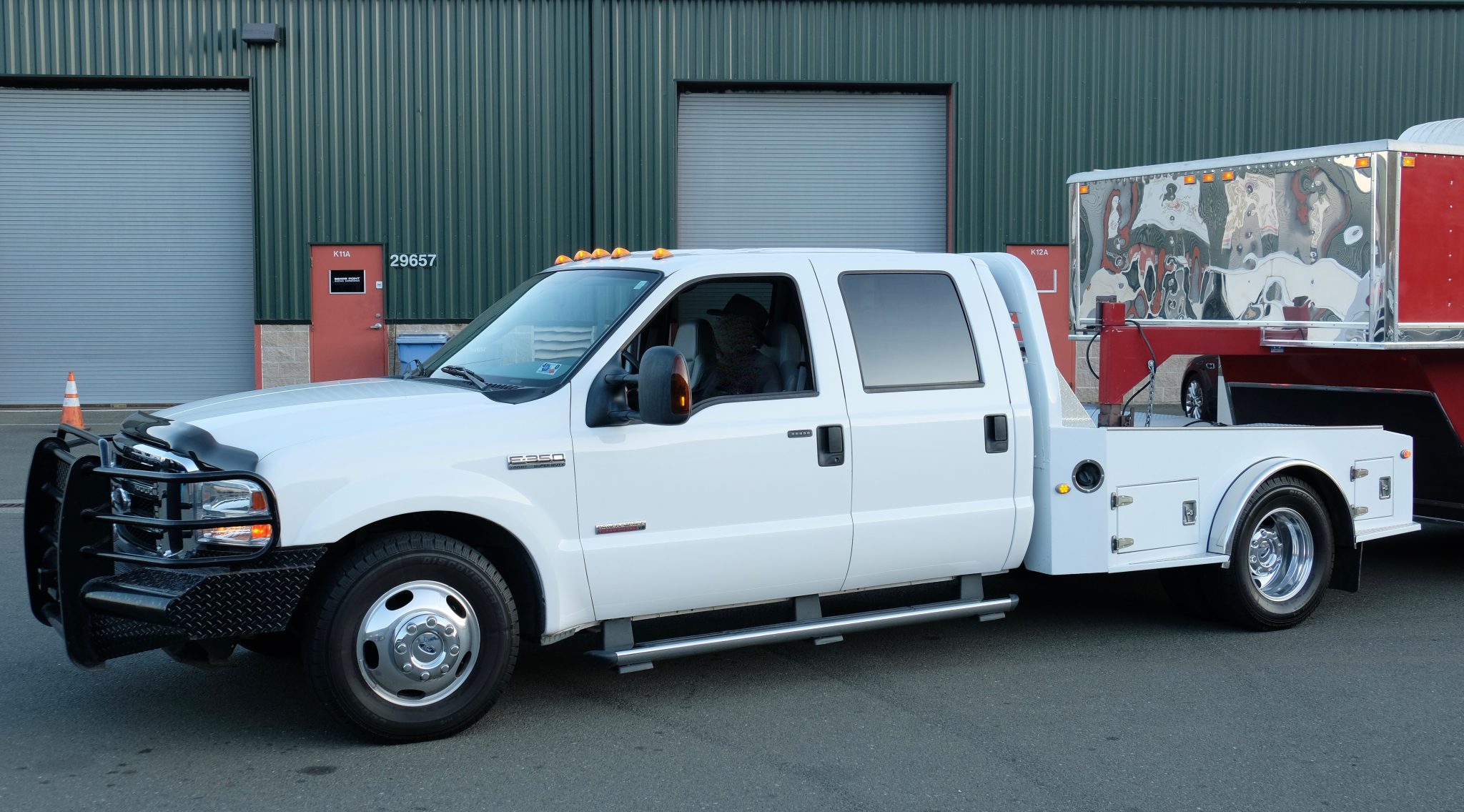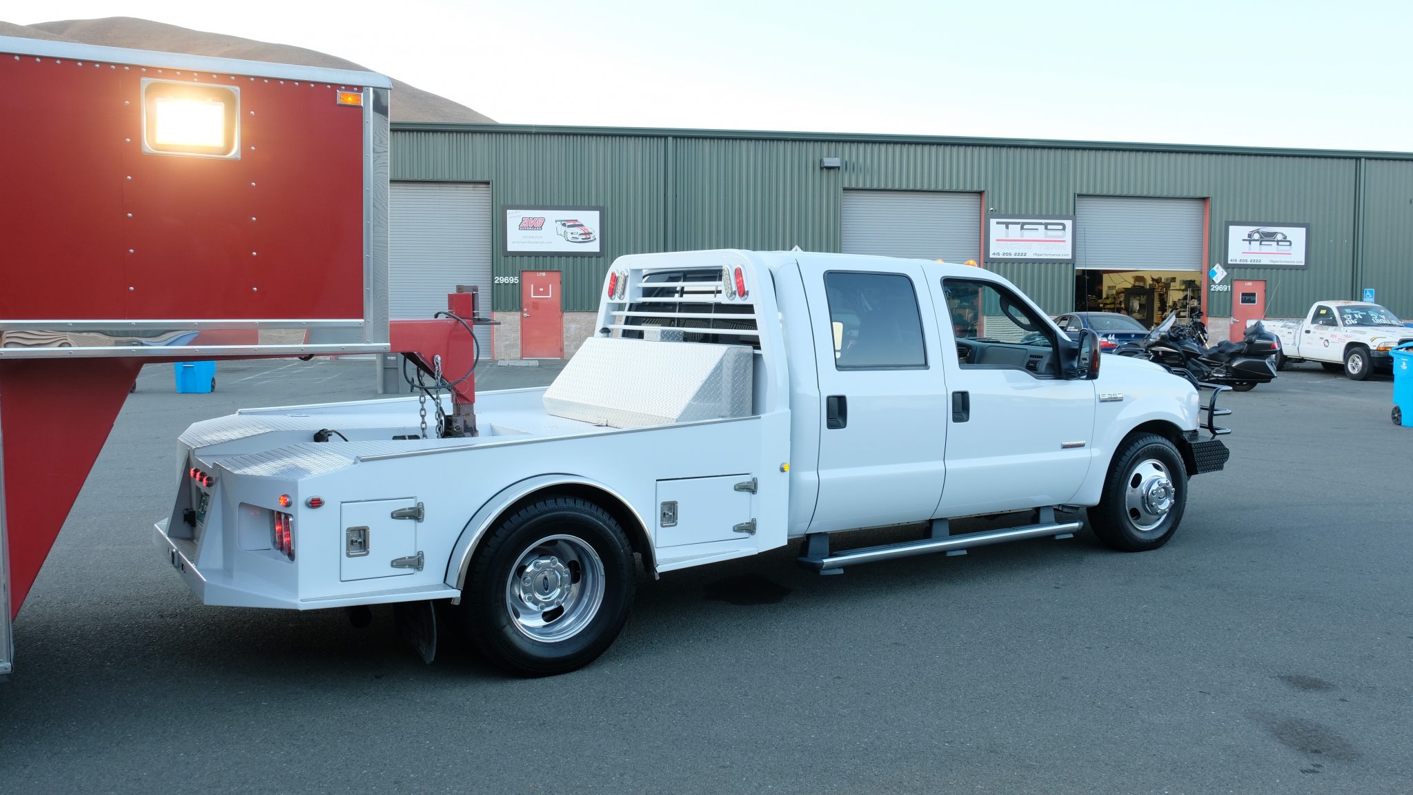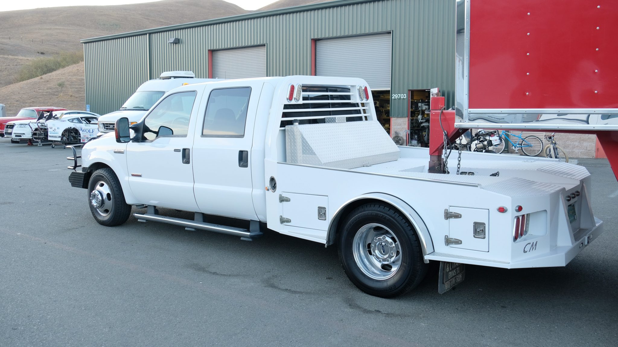 The truck features 17″ wheels with a high-polish finish and dual wheels out back, all of which are mounted with 245/75 Cooper Discoverer H/T tires. Braking is handled by four-wheel discs with an anti-lock braking system, and the truck is equipped with the factory Tow Command system with trailer brake controller and telescoping mirror housings.
