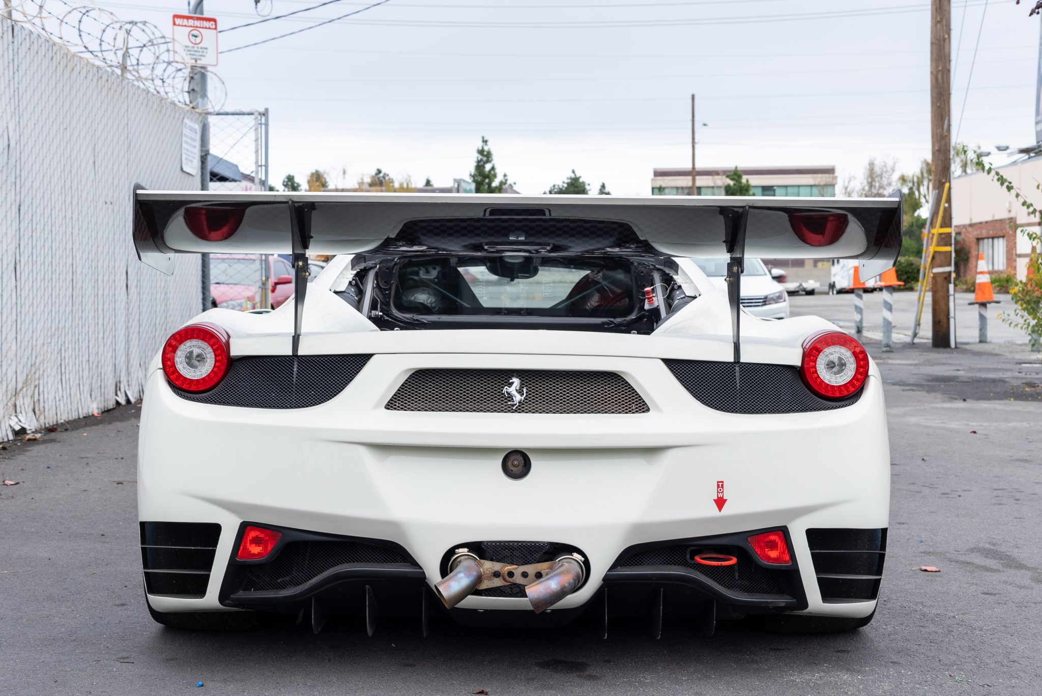 19″ BBS center-lock wheels are finished in black and are wrapped in Pirelli P Zero racing tires. Braking is handled by Brembo calipers paired with replacement slotted steel Girodisc rotors. The removed carbon-ceramic rotors are included in the sale. 458 Challenge suspension modifications include solid aluminum bushings, stiffer springs, single-rate dampers, and a 30mm-lower ride height.