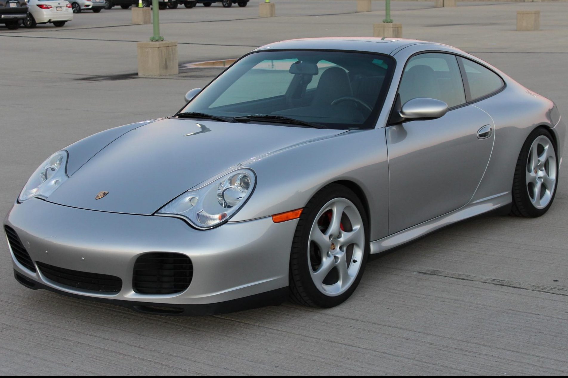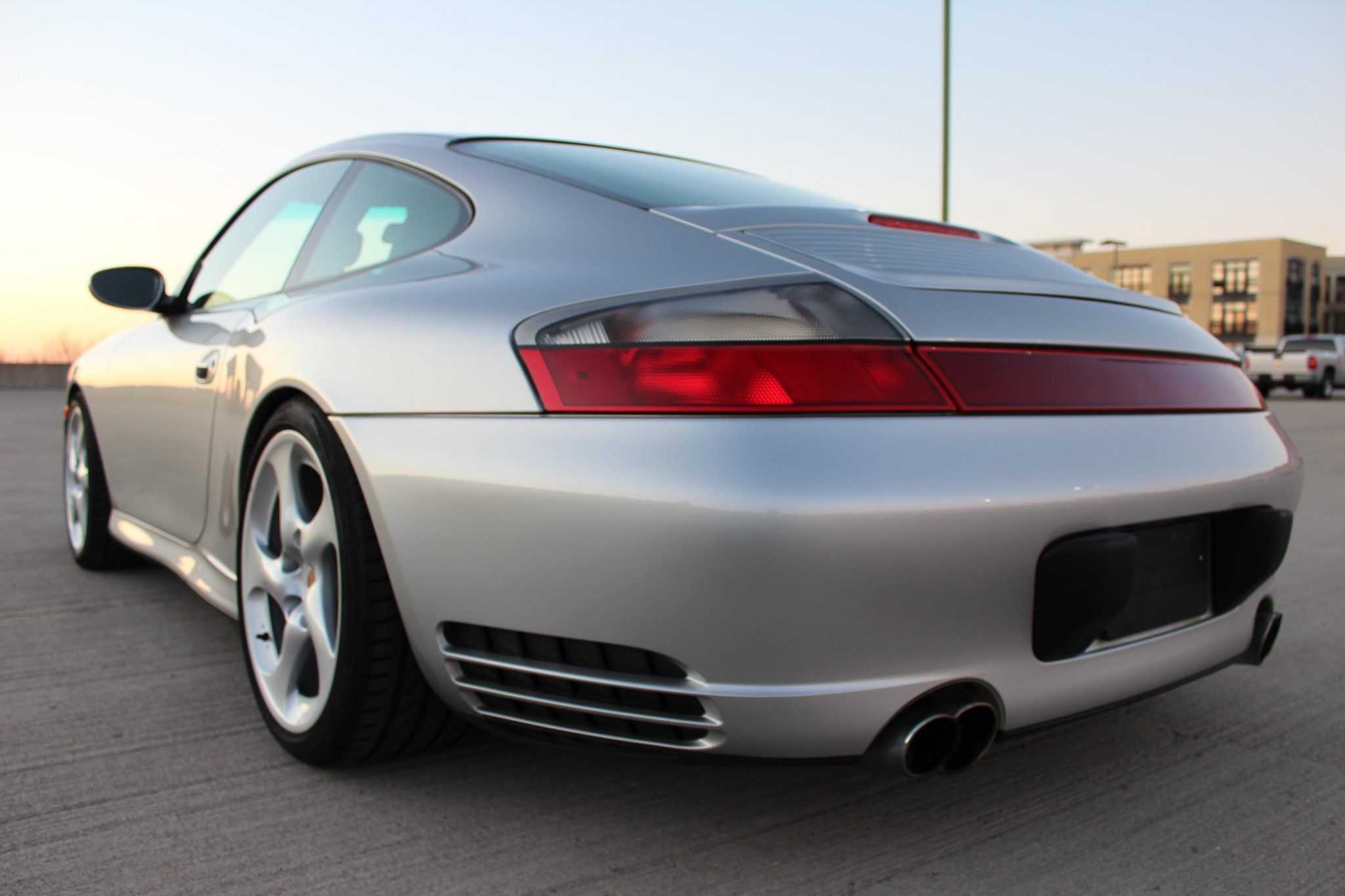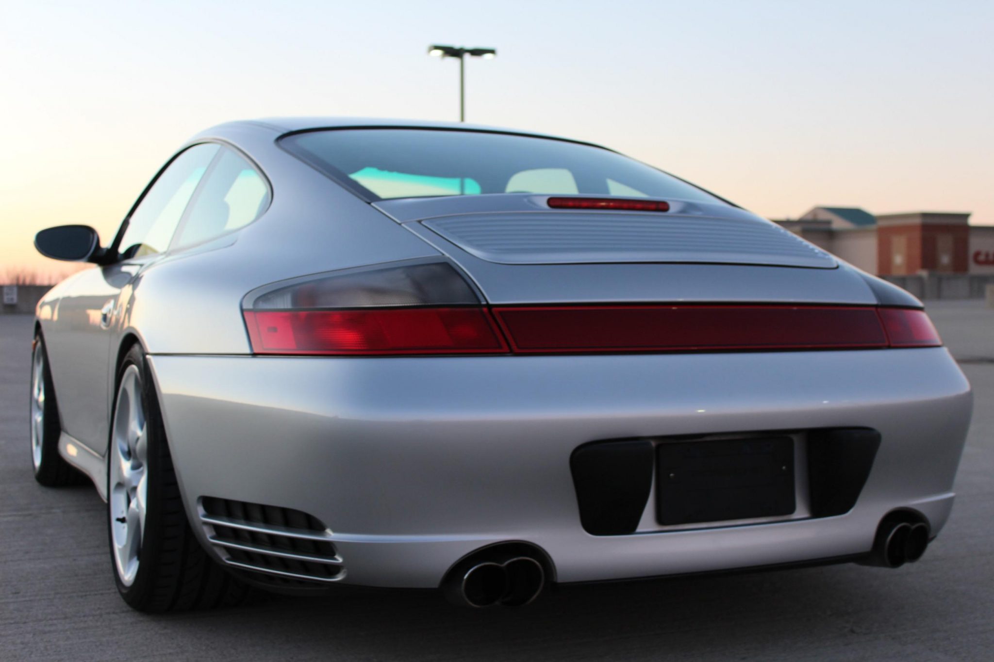 Turbo-look 18″ wheels feature colored Porsche-crest center caps and wear General G-Max tires. The car rides on lowering springs with wheel spacers and a lug stud conversion. Chips are visible on the wheels, and the front brake rotors require replacement. The vehicle inspection report notes that the parking brake needs adjustment.
