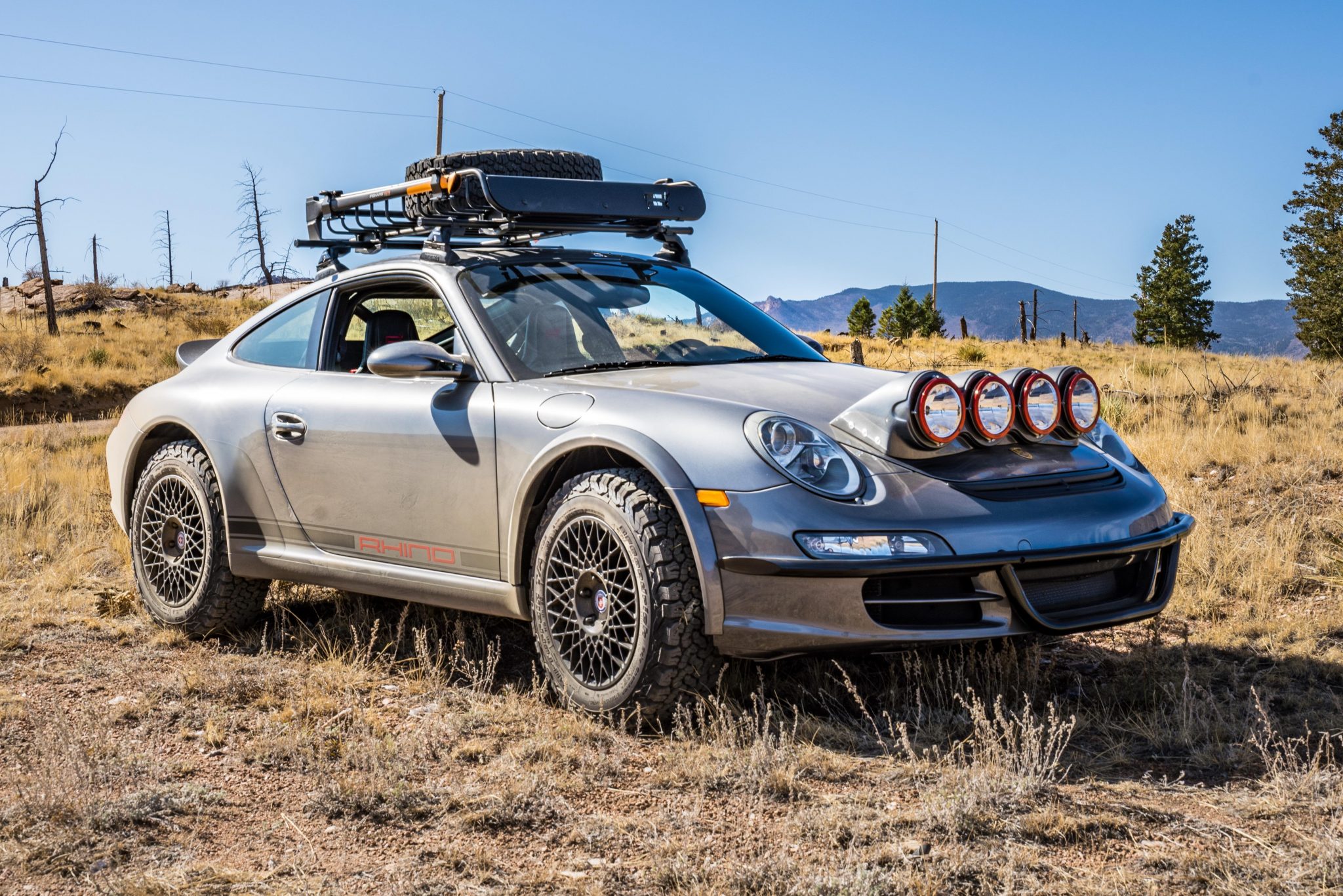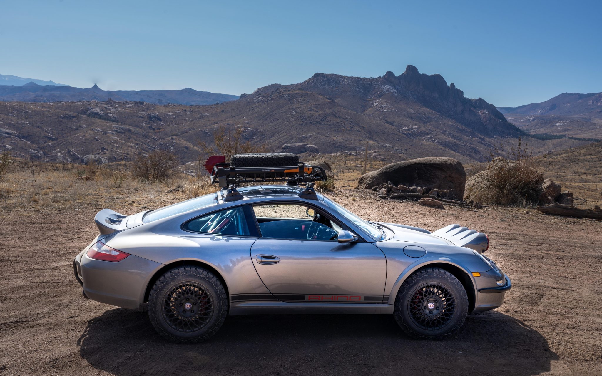 Black-finished 17” HRE 501M wheels are wrapped in 225/65 BF Goodrich All-Terrain T/A KO2 tires. Suspension modifications include a JRZ Motorsport double adjustable suspension kit which includes a front shaft inverted by 50 millimeters and rear shaft inverted by 25 millimeters. Additionally, the front springs have been upgraded to 12 inches and the rear springs to 15 inches.