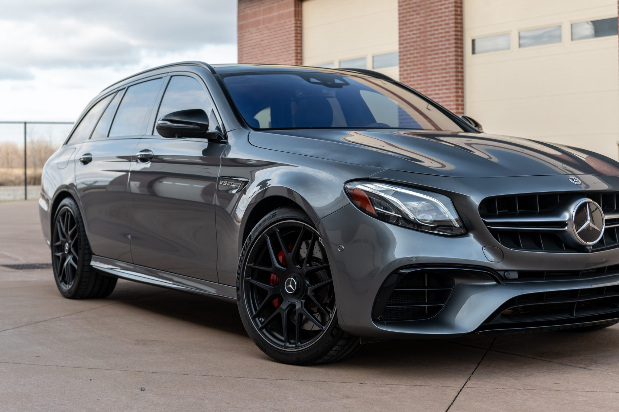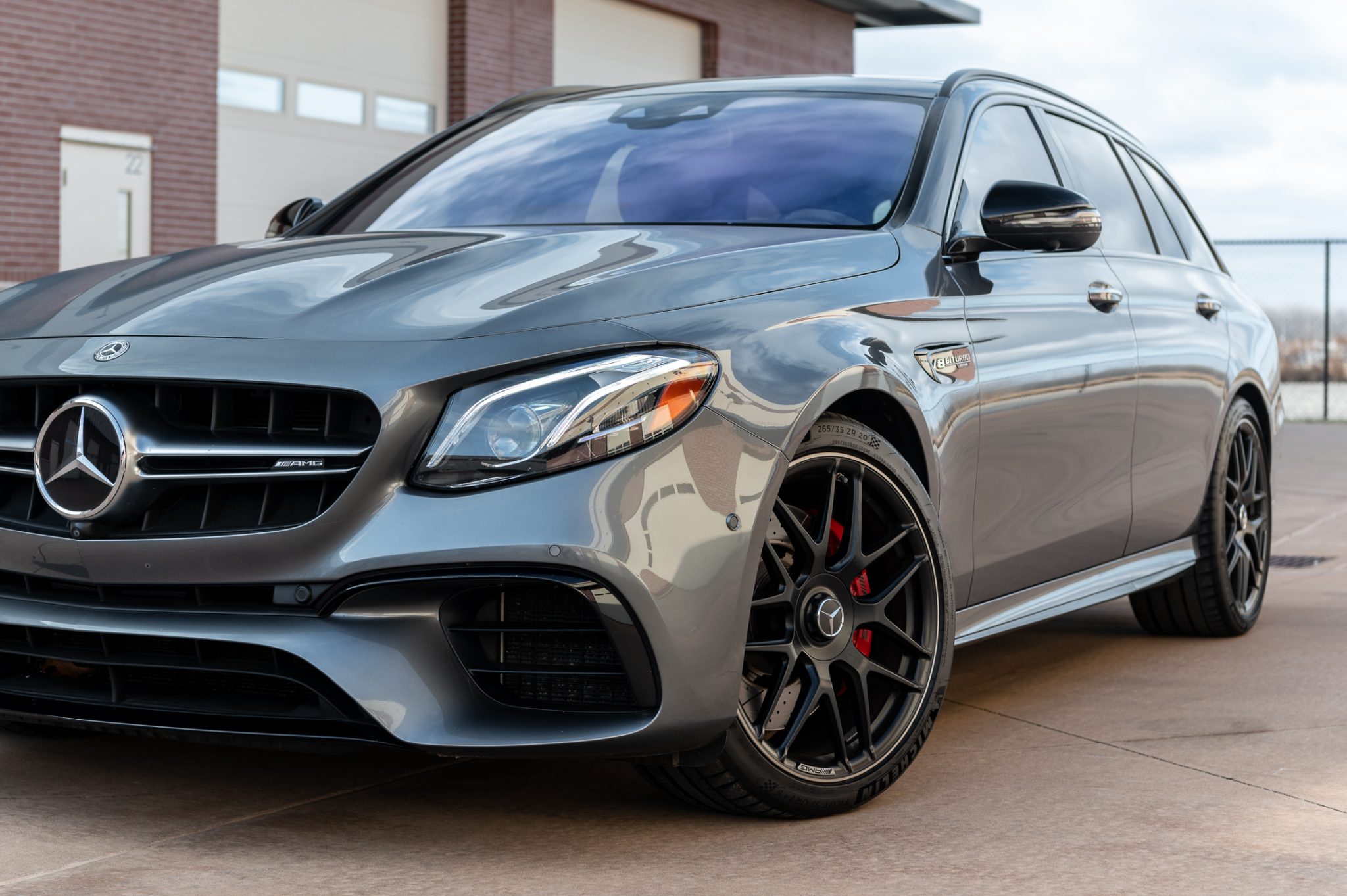 Black 20″ AMG cross-spoke wheels are mounted with staggered-width Michelin Pilot Sport 4S tires showing 2019 date codes. The car is equipped with an AIRMATIC semi-active suspension and features red brake calipers and drilled and slotted rotors all around.