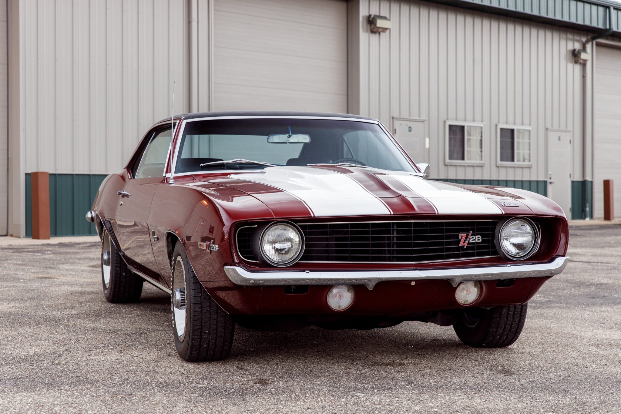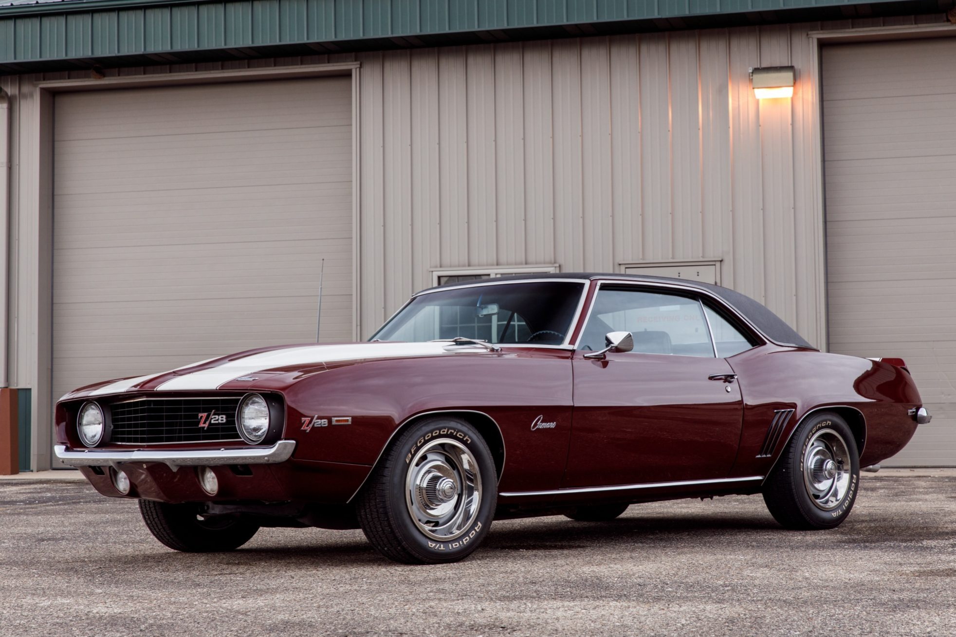 Details include white racing stripes, a rear spoiler, a cowl hood, and Z/28 badging. Steel 15″ Rally wheels wear chrome hubcaps, beauty rings, and 215/65 BFGoodrich Radial T/A tires.