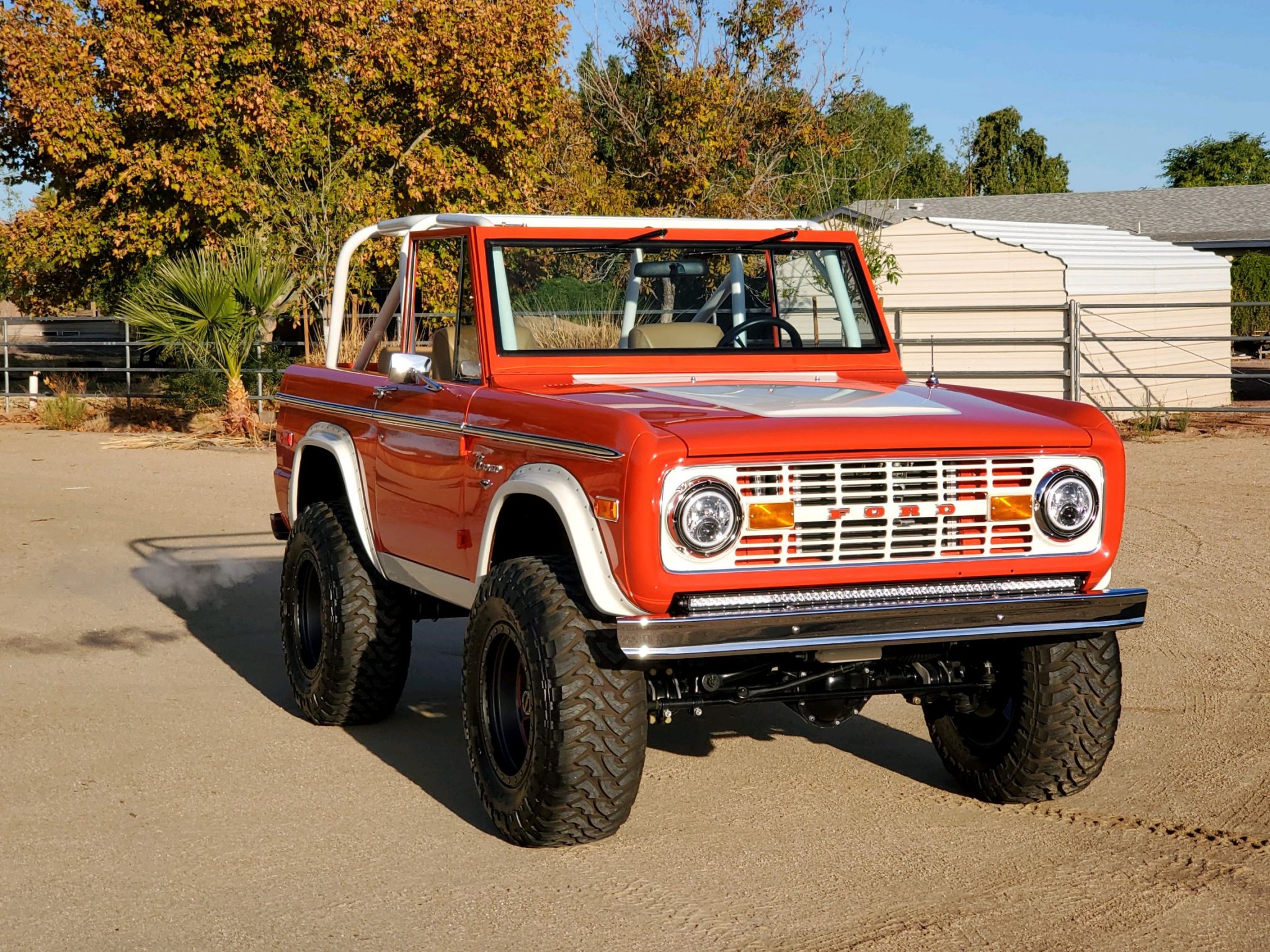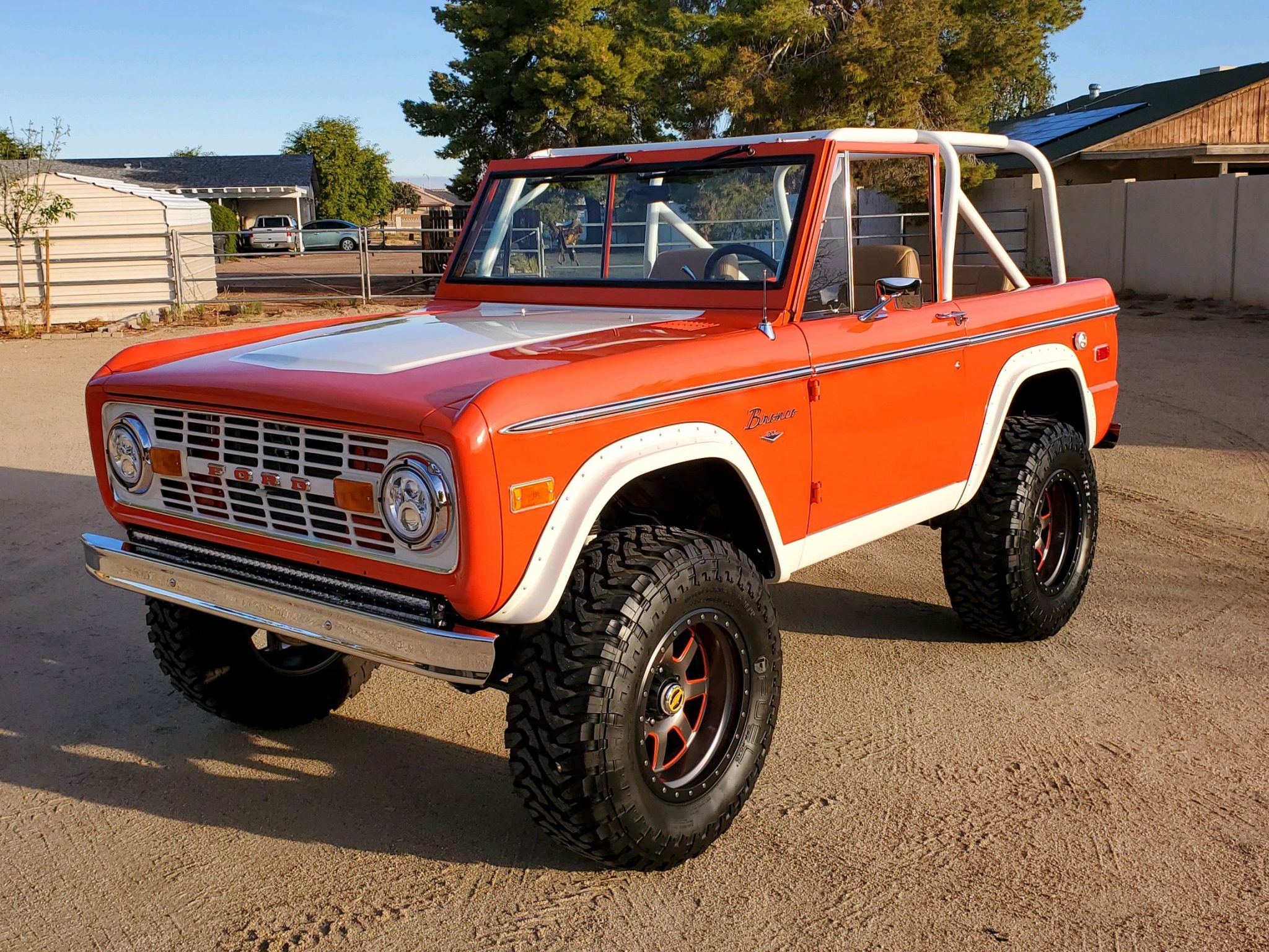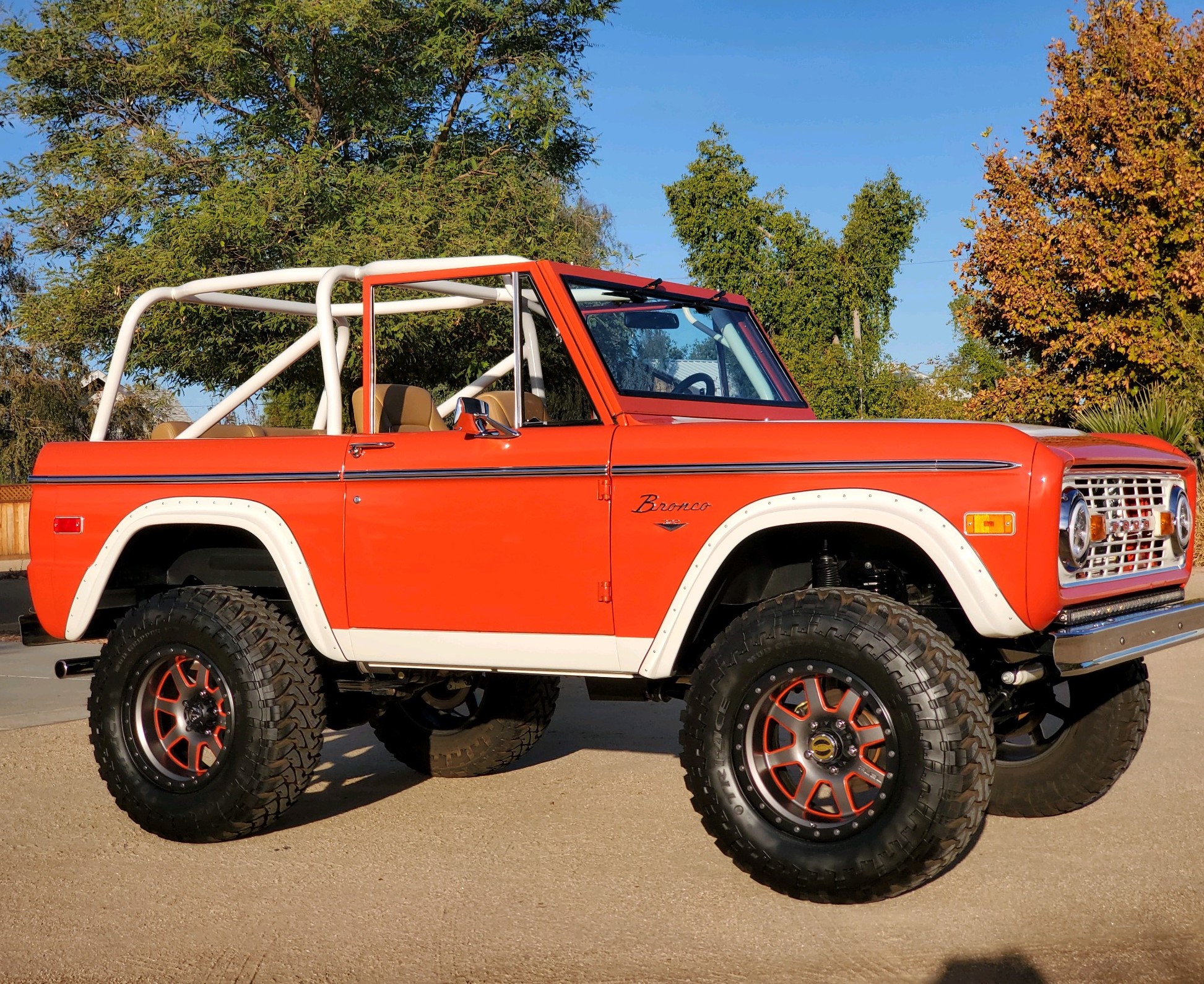 Fuel Off-Road 18″ wheels feature orange detailing with simulated bead-lock rings and are mounted with 35×12.50″ Fuel Tri-Ace Mud Gripper M/T tires. Braking is handled by power-assisted four-wheel discs, and the ride height has been increased with the use of a 3½” suspension lift and a 2″ body lift. Warn locking hubs have been added to the front, and the seller states that a brake-fluid leak was repaired during a November 2020 service.