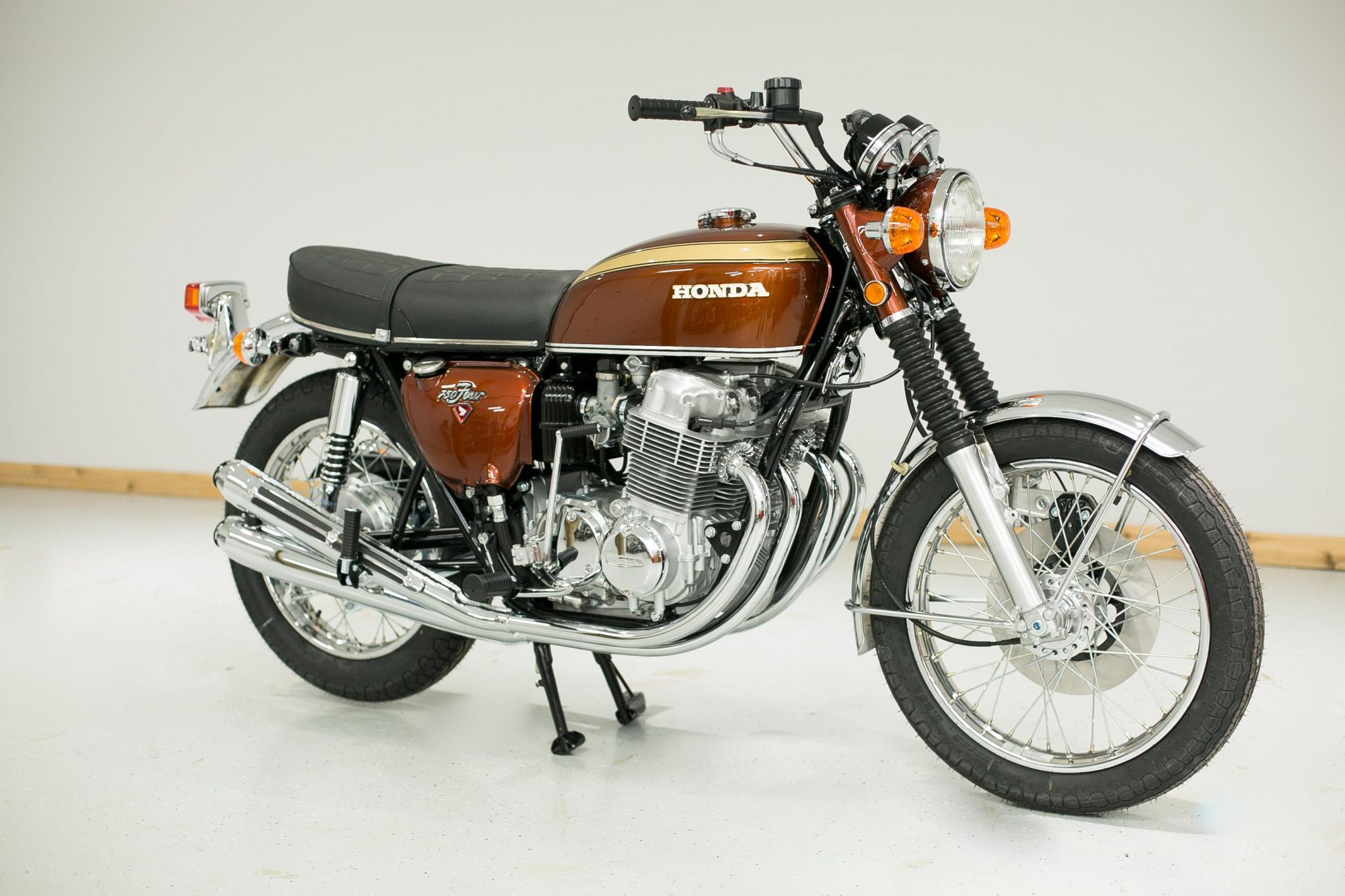 The chrome wire-spoke wheels were rebuilt with new spokes and bearings, and are mounted with period-style IRC tires measuring 19″ front and 18″ rear. Suspension consists of a conventional fork with black rubber gaiters as well as a swingarm mounted with dual Japanese reproduction shocks. The front disc and rear drum brakes are said to have been rebuilt.