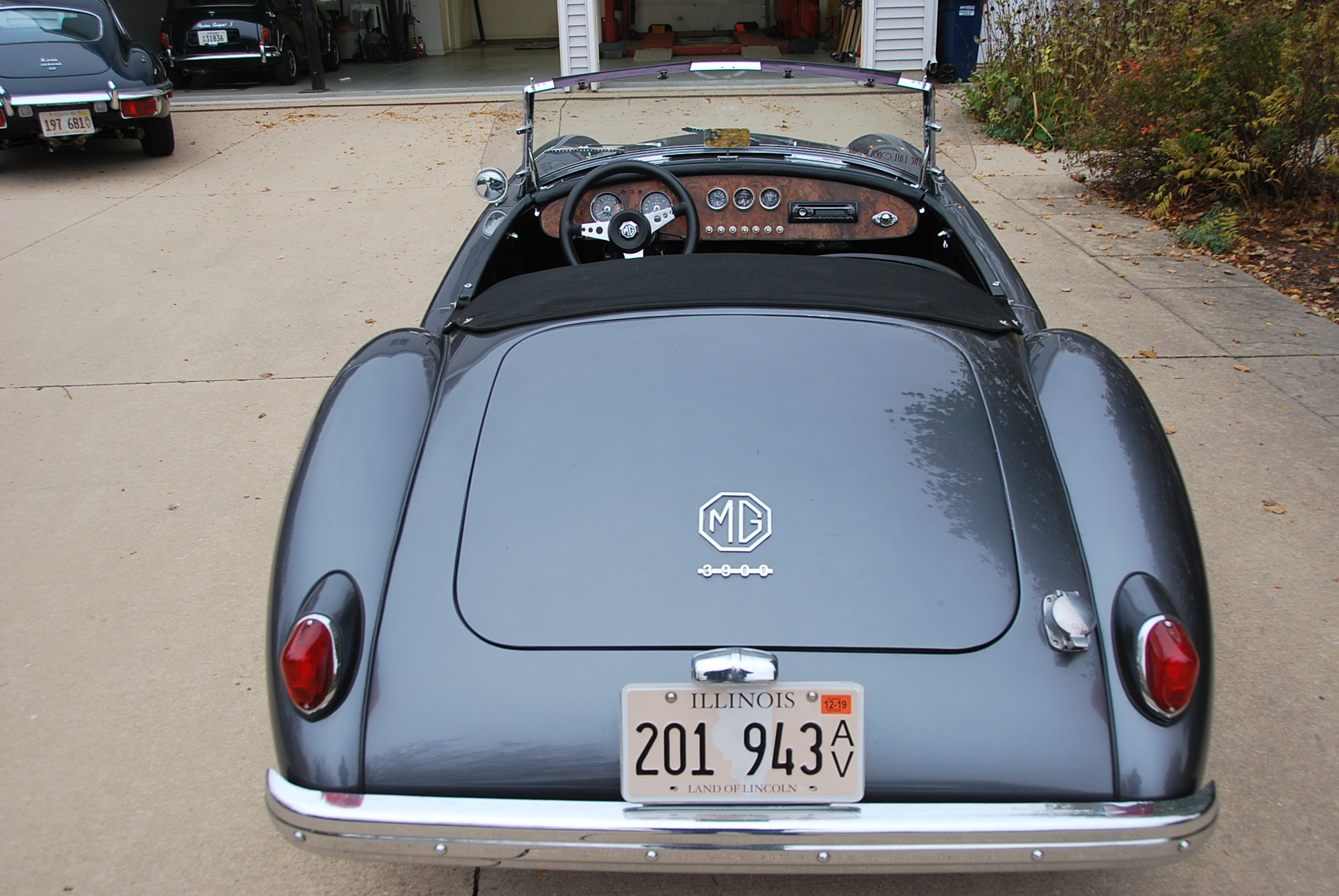 Minilite-style 15″ wheels feature black inserts, polished lips, and MG center caps, and they are mounted with Dunlop Signature tires. Suspension and braking components were sourced from an MGB and installed in 2012.