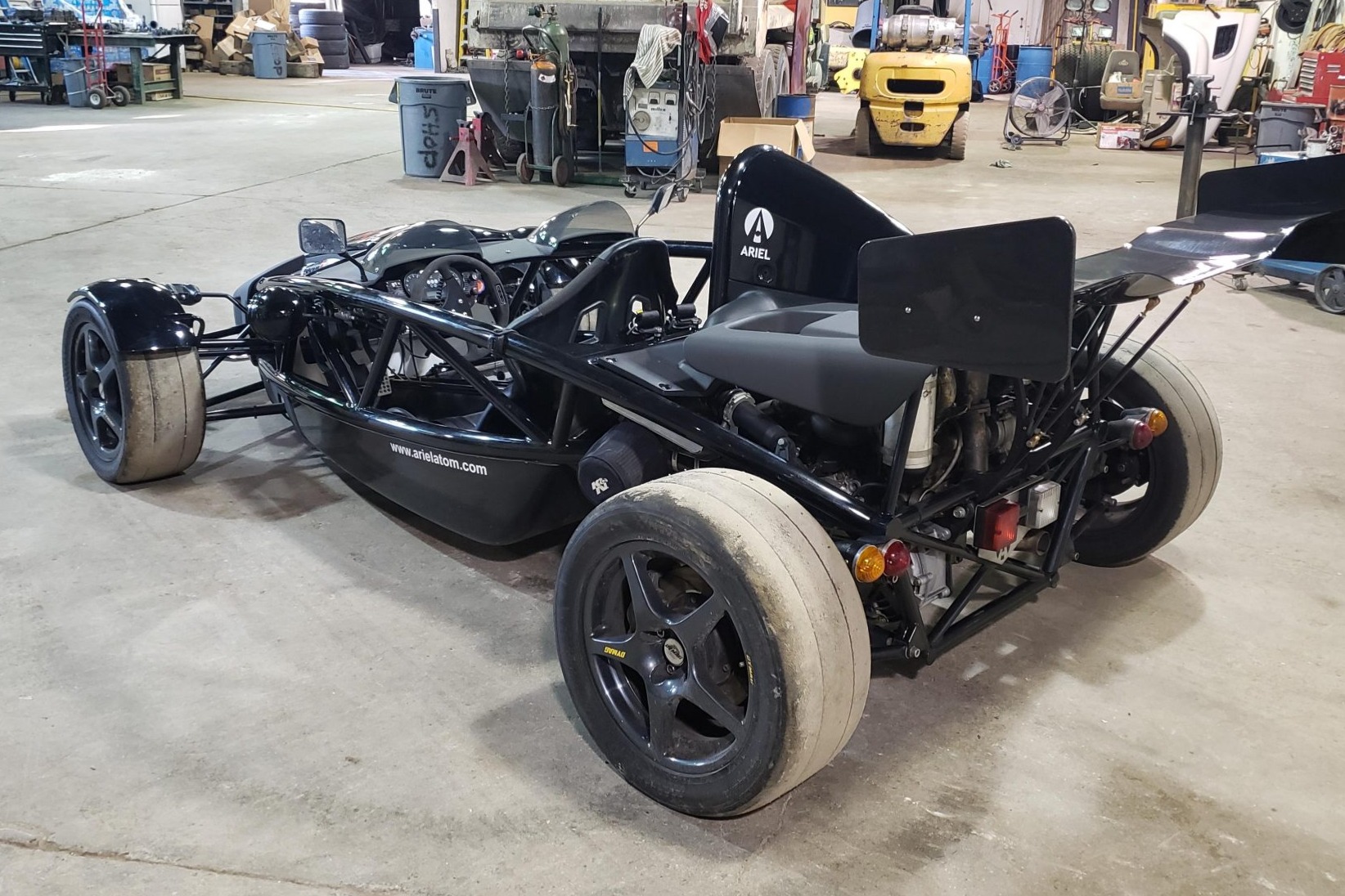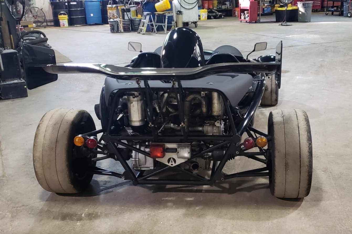 Staggered Dymag wheels wear Hoosier tires measuring 245/45-16 out back and 225/45-15 up front. The double-wishbone suspension uses tubular control arms and Koni adjustable shocks with bellcrank actuators, while braking is handled by four-piston Alcon calipers and slotted rotors at all four corners.