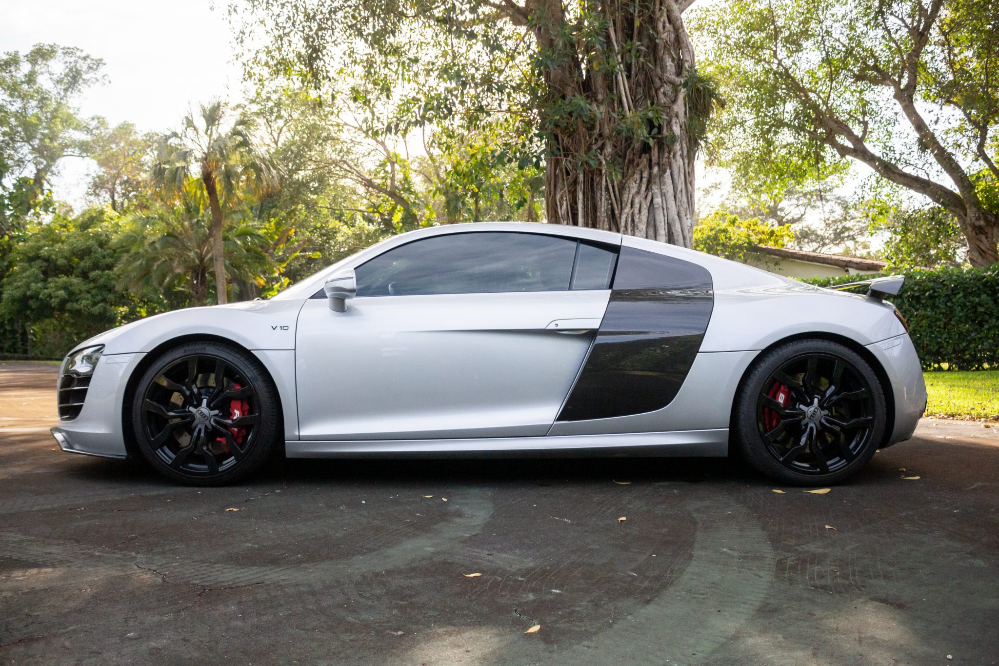 Forged 19” Y-spoke wheels have been powder-coated black and are wrapped in Pirelli P Zero tires sized 235/35 up front and 295/30 out back. Stopping power is provided by anodized red calipers with white R8 script paired with cross-drilled rotors at all four corners.