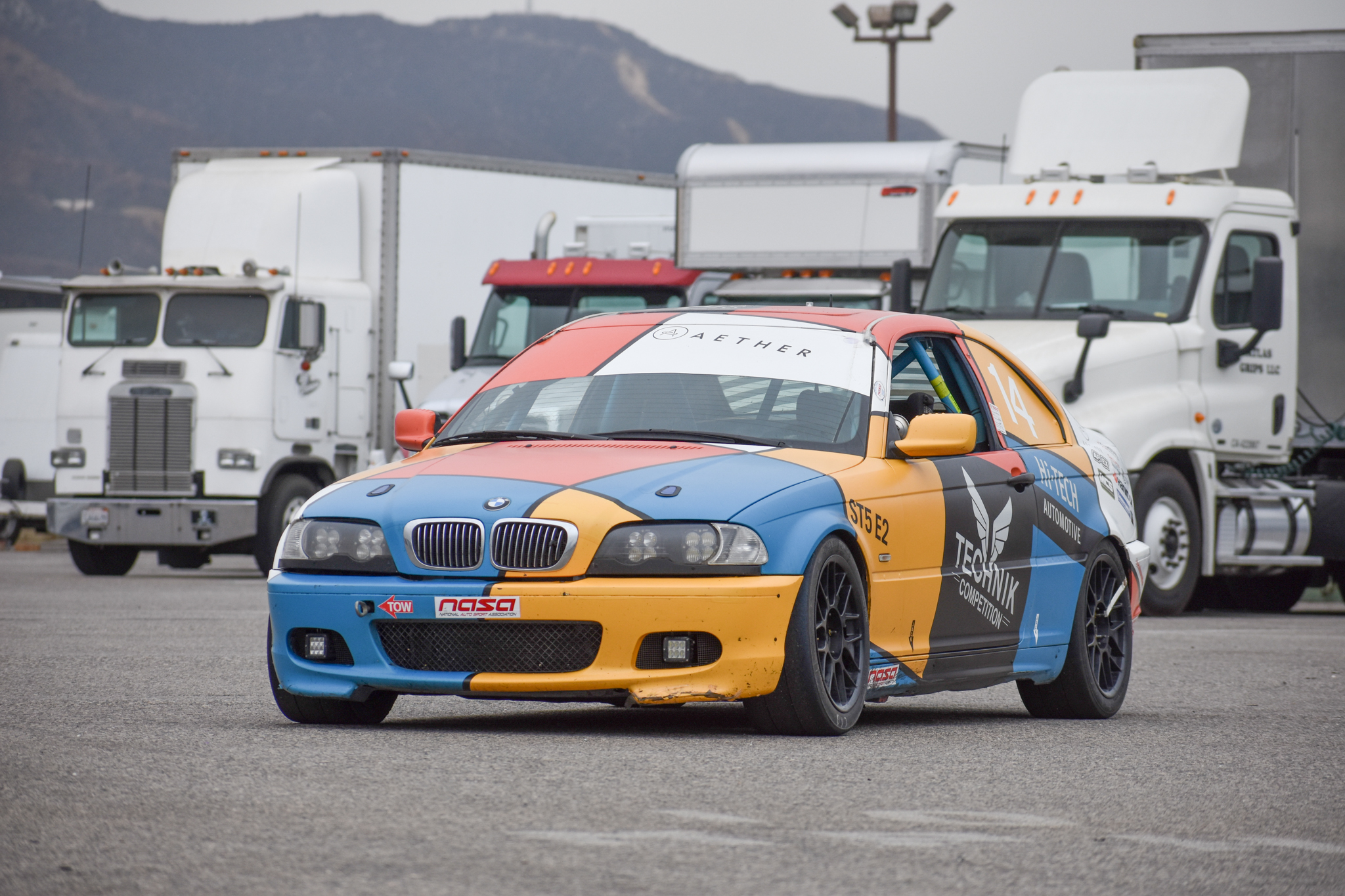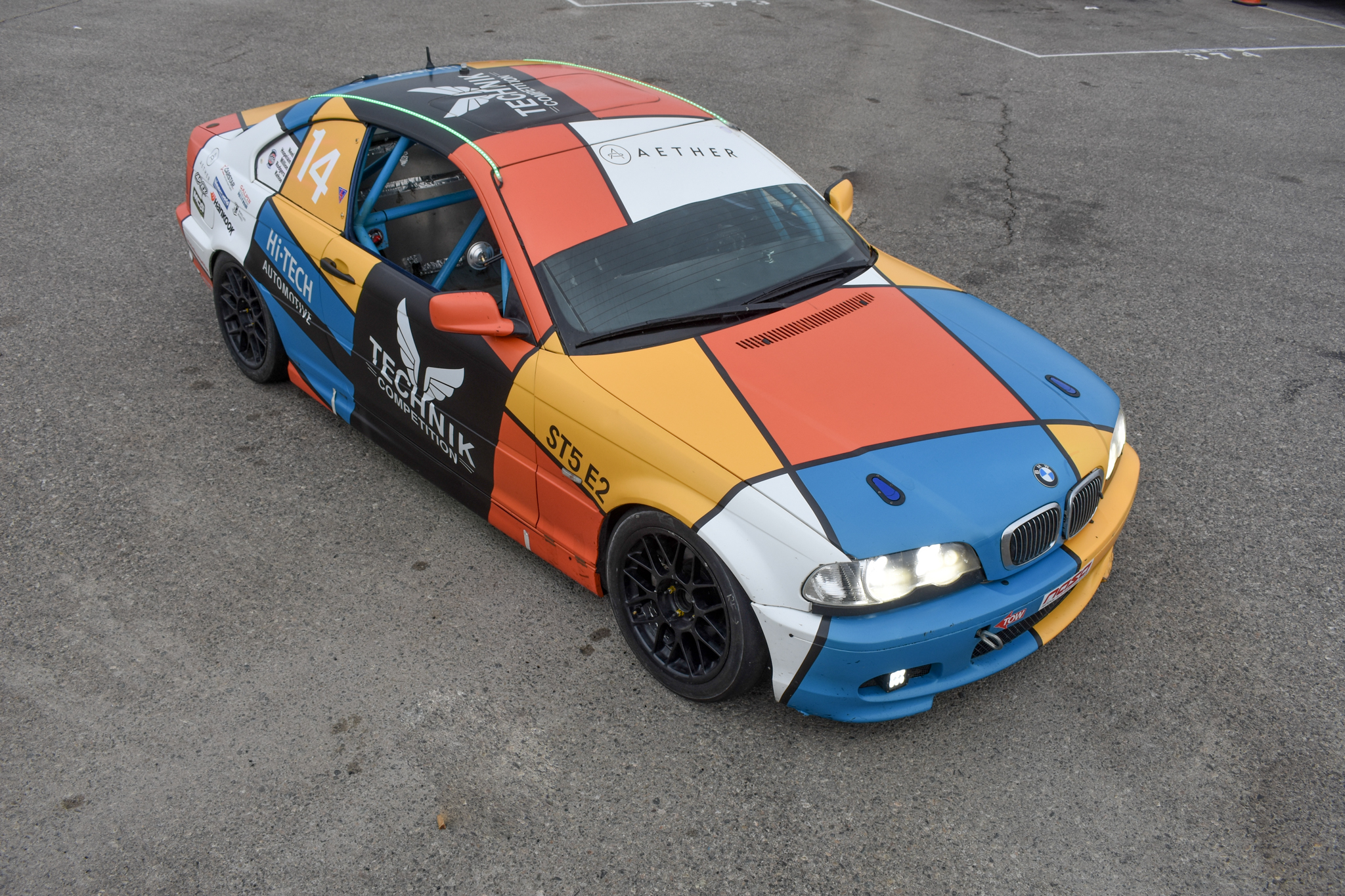 Black-finished 17″ wheels secured on long wheel studs and with spacers up front wear Hankook Ventus racing tires, with three additional sets of tires and wheels included in the sale. Equipment includes adjustable sway bars, rear camber arms, and Motion Control Suspension two-way coilovers, along with reinforced front and rear subframes, modified and reinforced strut towers, Ground Control camber/caster plates, solid front control arm bushings, and polyurethane rear trailing arm bushings. Braking power is provided by hardened rotors with PFC brake pads.