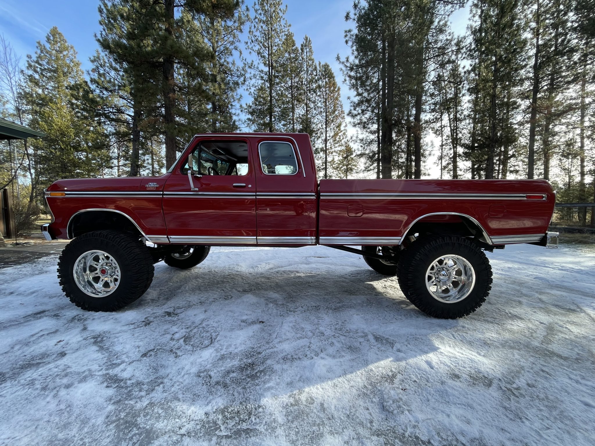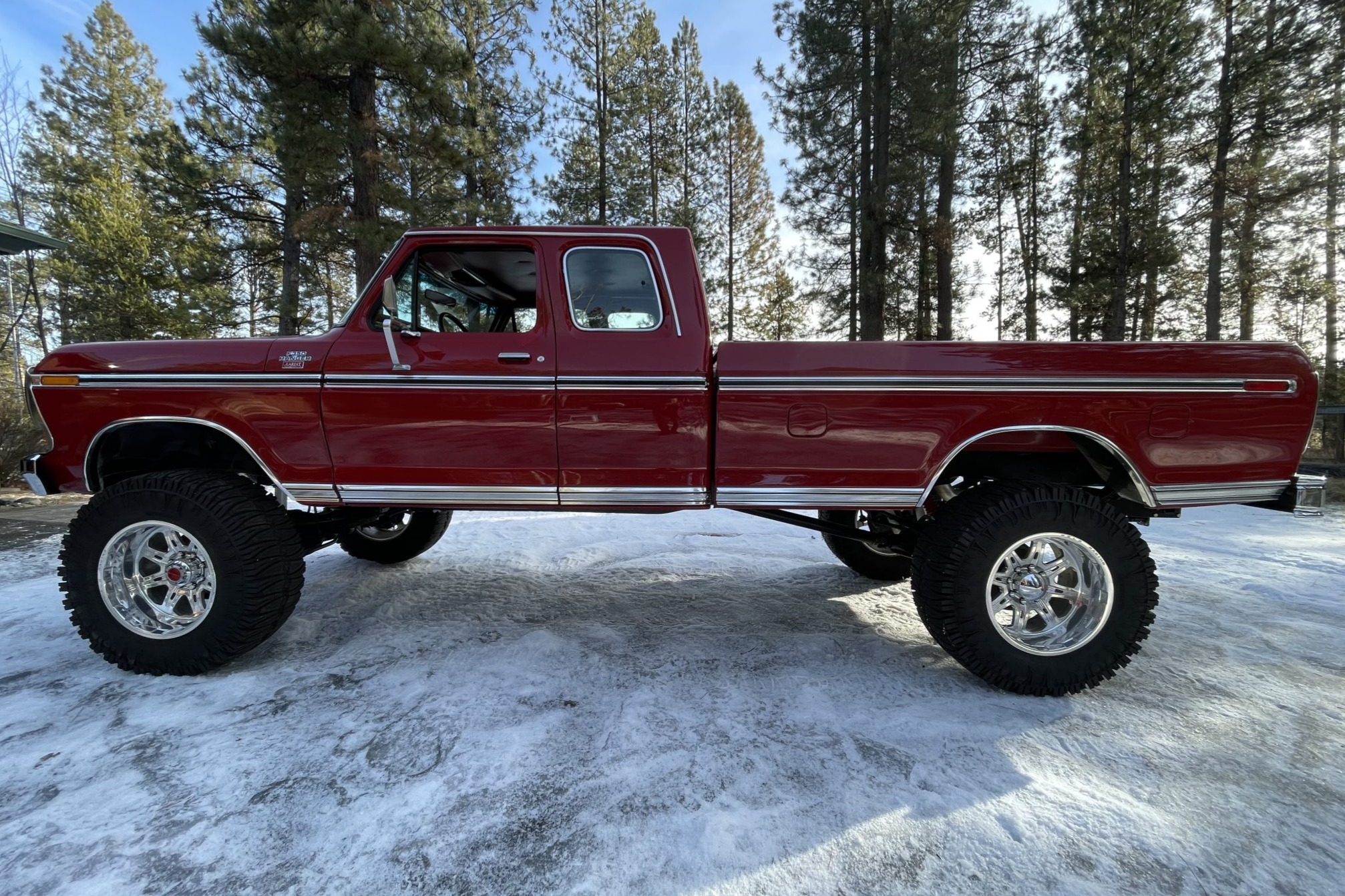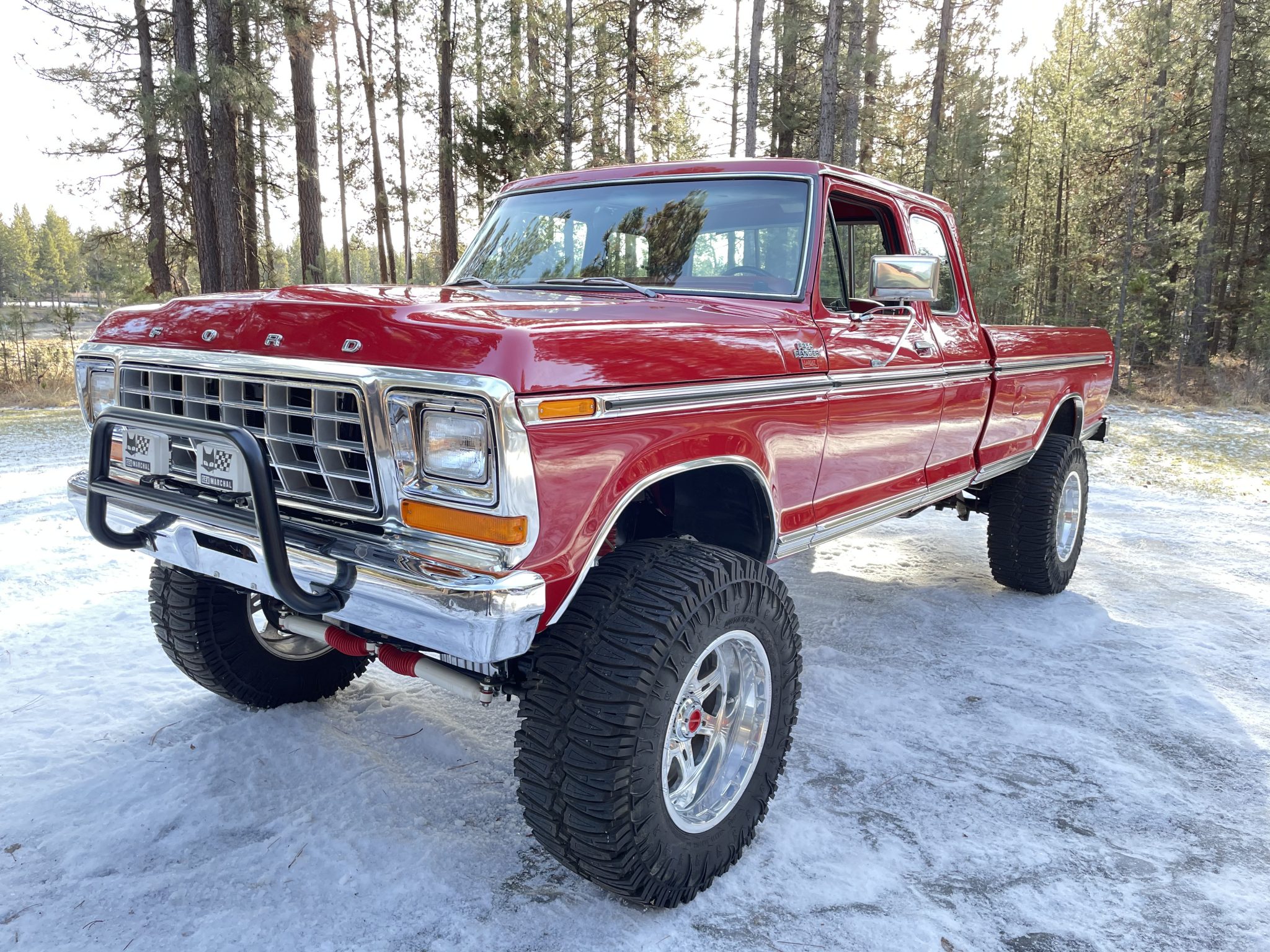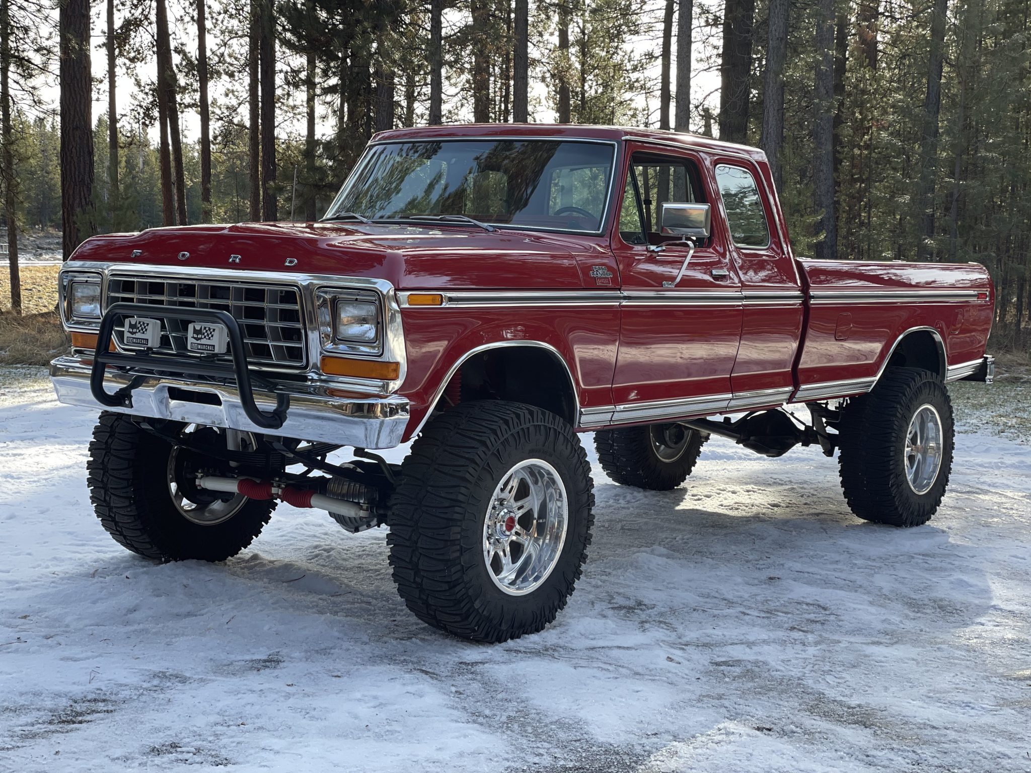 Polished alloy 20″ Weld Racing wheels are mounted with 38″x15″ Interco TrXus tires. The truck has been lifted on aftermarket suspension components, and rear leaf spring clamps were recently added according to the selling dealer. Additional work is said to have included replacement of the brake master cylinder, booster, equalizer, front pads and rotors, and lines.