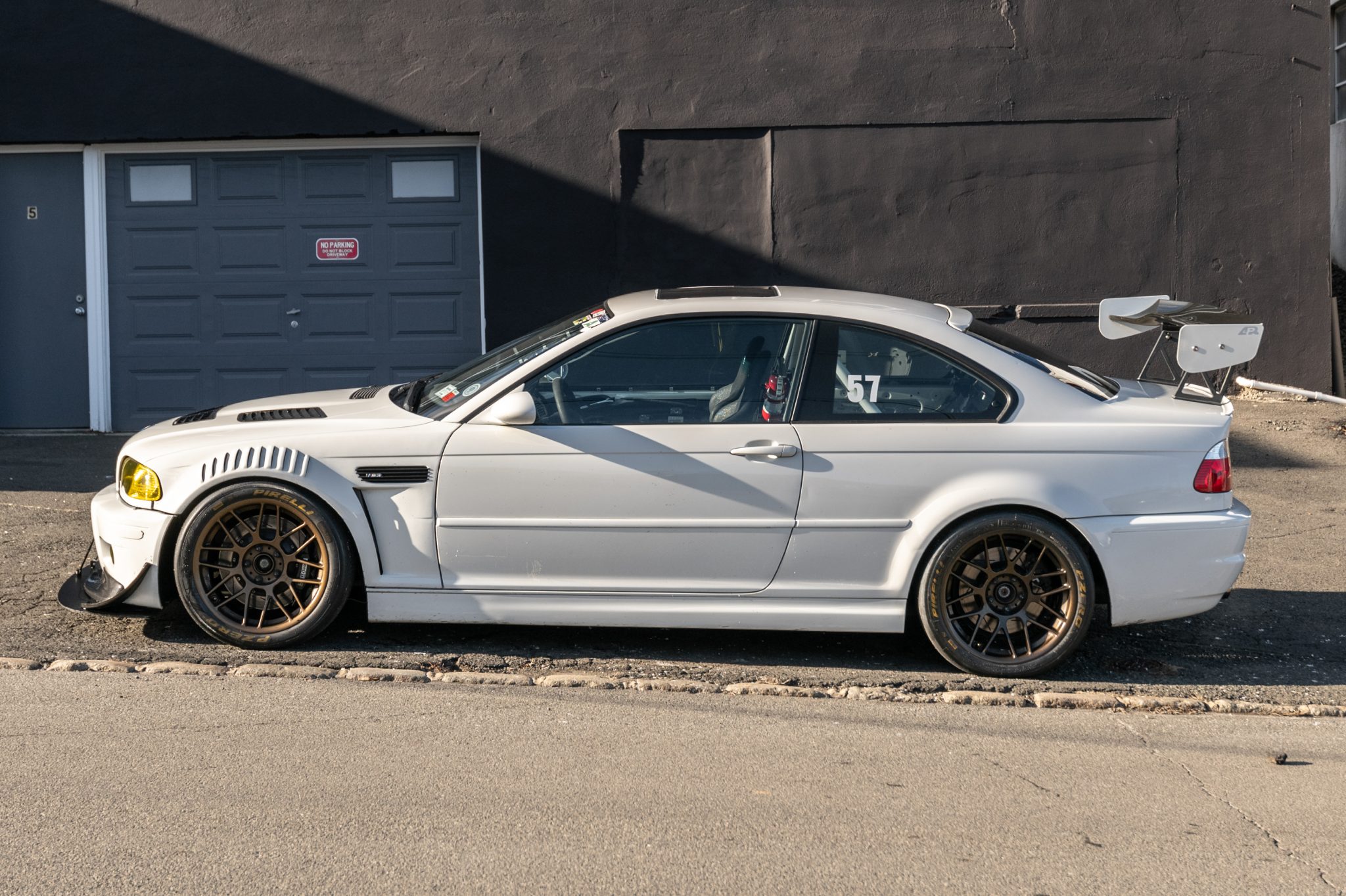 18″ Apex Racing Arc 8 wheels wear Pirelli PZero racing slicks that measure 265/645 up front and 285/645 out back. Braking is handled by stainless steel braided lines and StopTech slotted rotors and front calipers. A set of 18″ M double-spoke wheels is included in the sale.