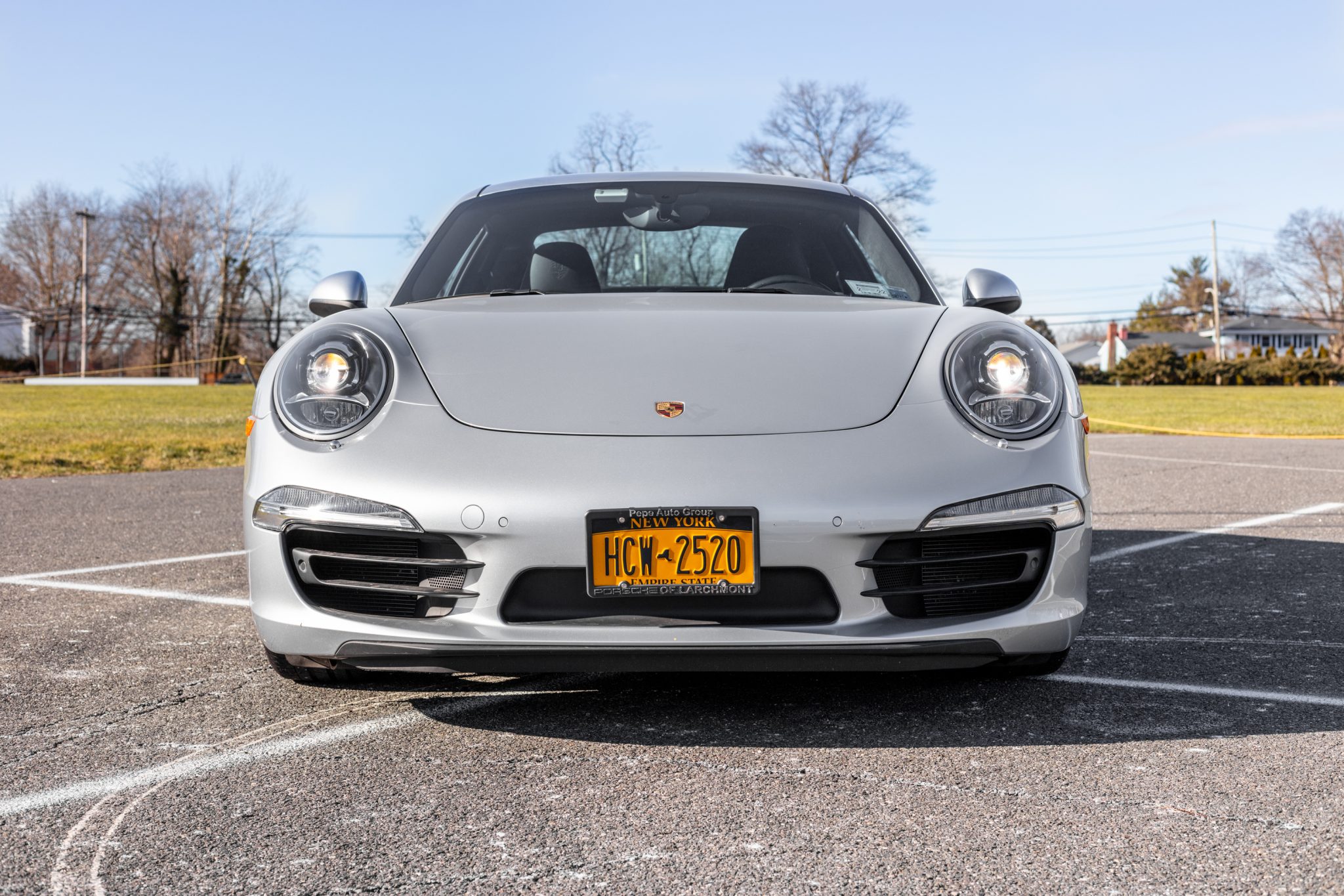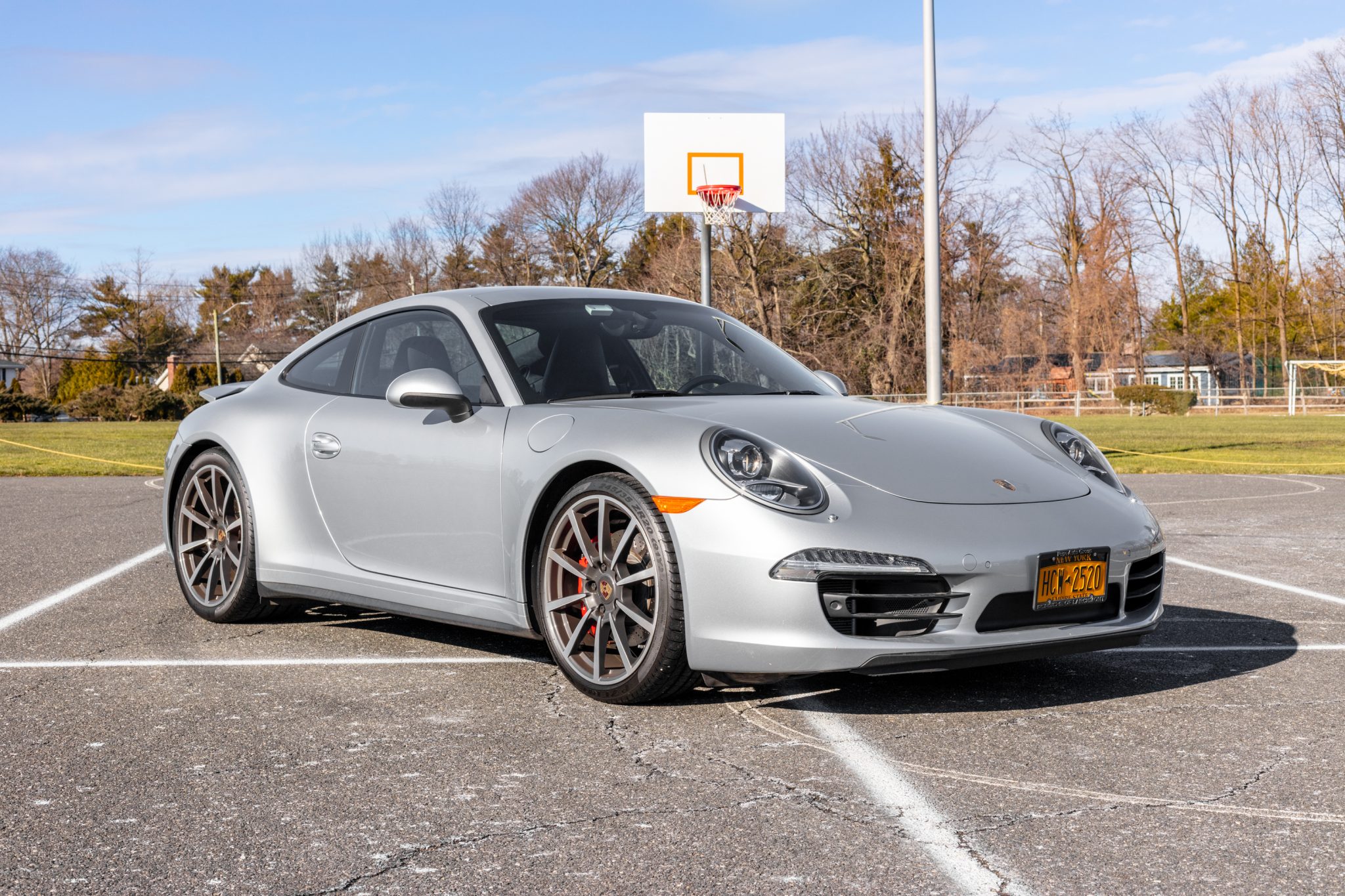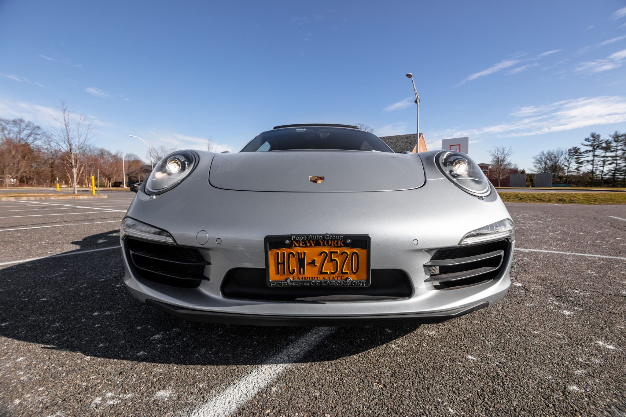 Silver 20″ Carrera Classic wheels with Porsche-crest center caps are mounted with 245/35 front and 305/30 rear Pirelli P Zero tires. Red brake calipers are paired with cross-drilled steel rotors at each corner.