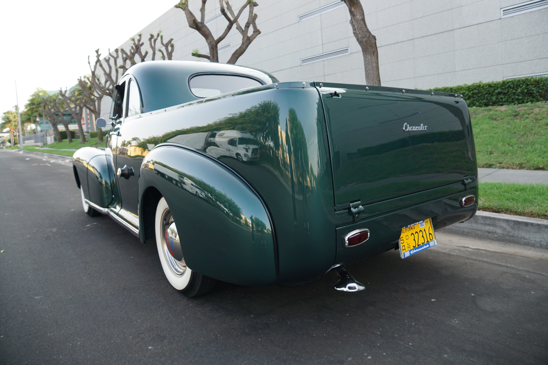 The bed is accessed via a flip-down tailgate and features stained wood slats with black cargo runners. Fastening hardware for a tonneau cover is fitted around the perimeter of the bed. This example is mounted with painted steel wheels wearing chrome Chevrolet hubcaps with red and blue graphics.