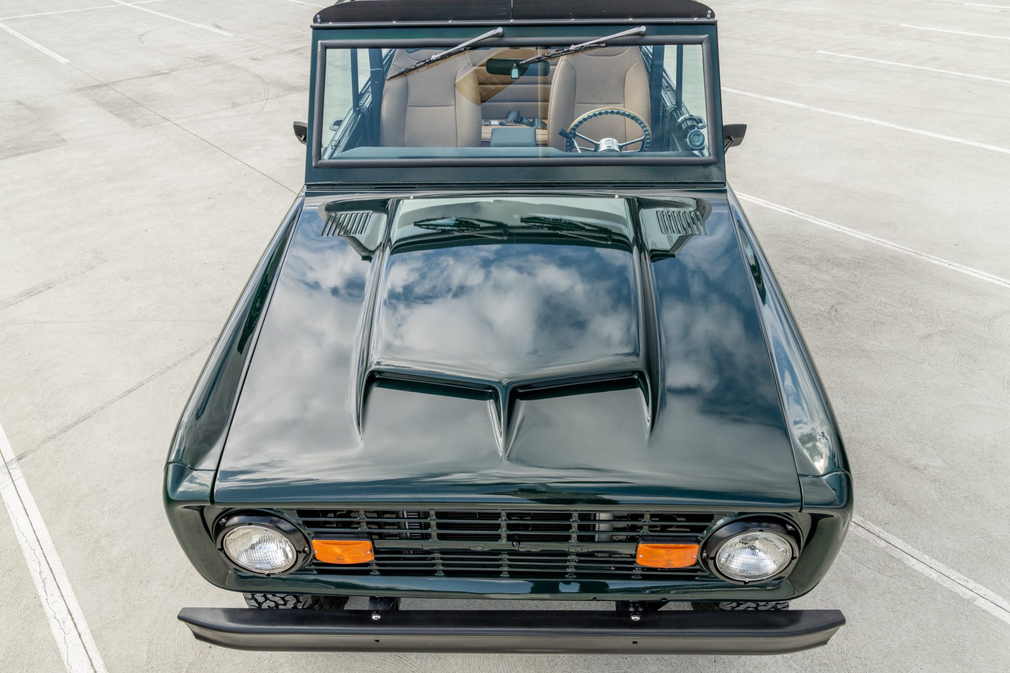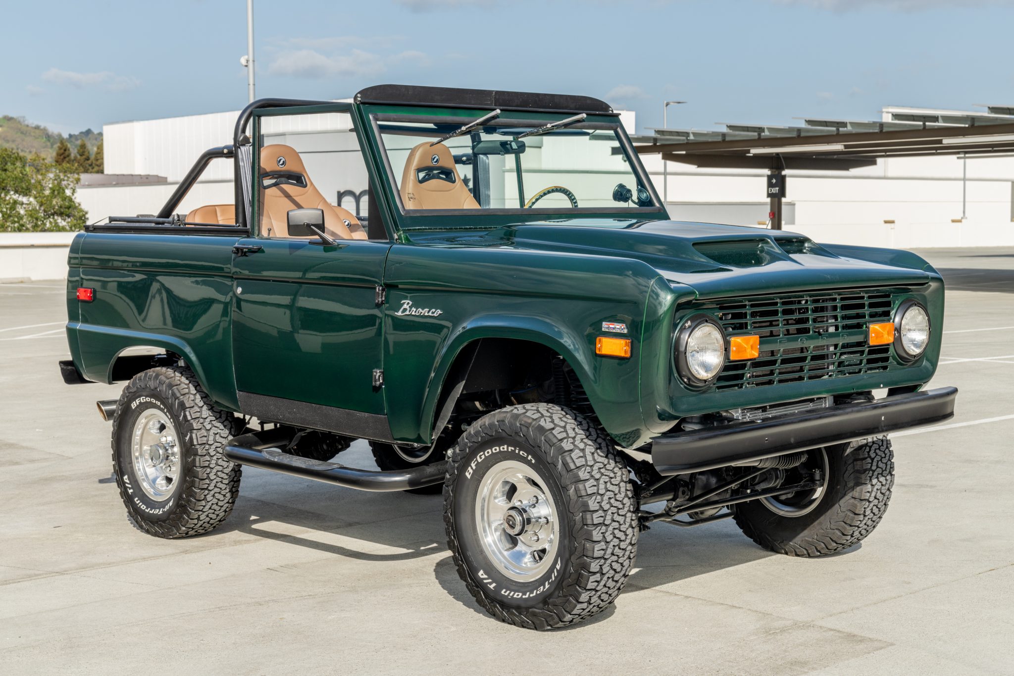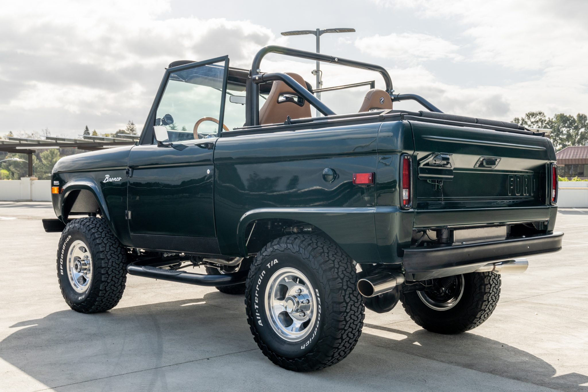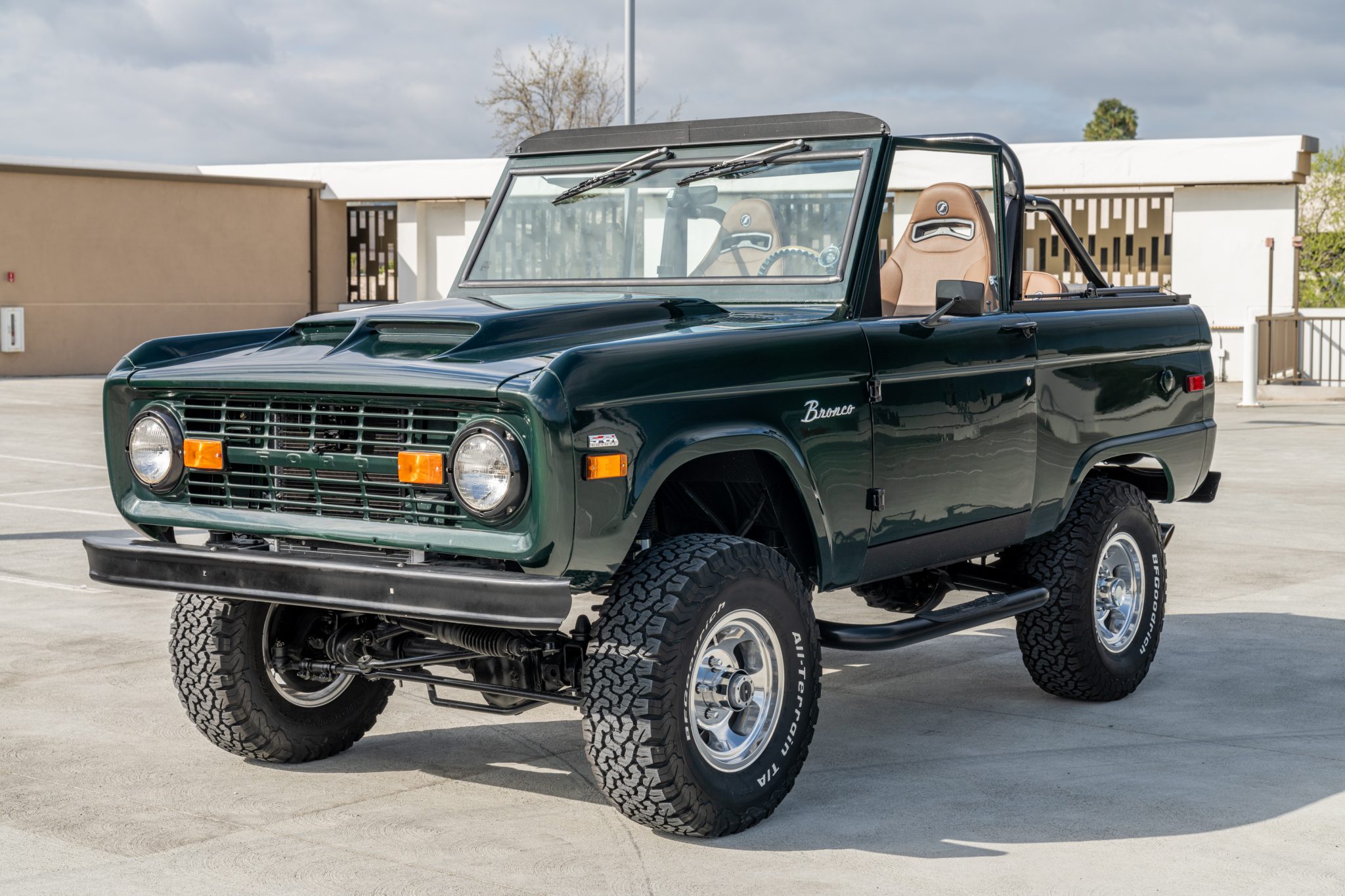 A 2″ body lift and 2.5″ Tom’s Bronco suspension lift clear 31″ BFGoodrich All-Terrain T/A KO2 tires mounted on 15″ US Mag Indy wheels. Manually-locking front hubs, a front sway bar, and a Sweets power steering pump with a Borgeson steering box are fitted, and braking is handled by front discs and rear drums linked with a Wilwood Hydroboost hydraulic booster. The truck retains front coil and rear leaf springs, and Bilstein shocks have been installed. The seller reportedly replaced the U-joints and ball joints.
