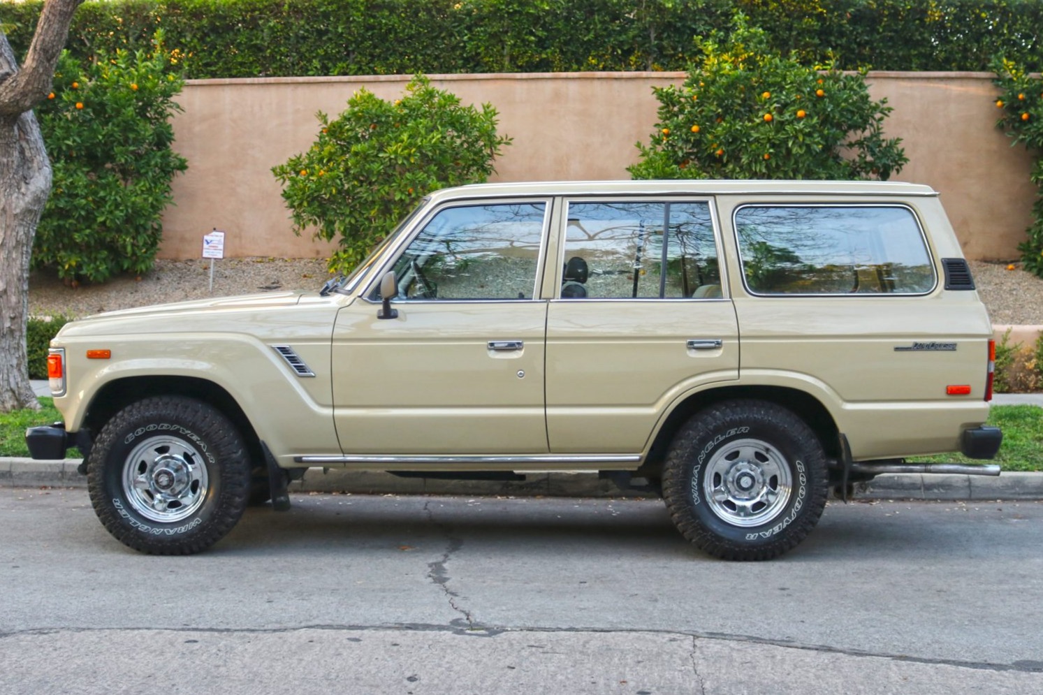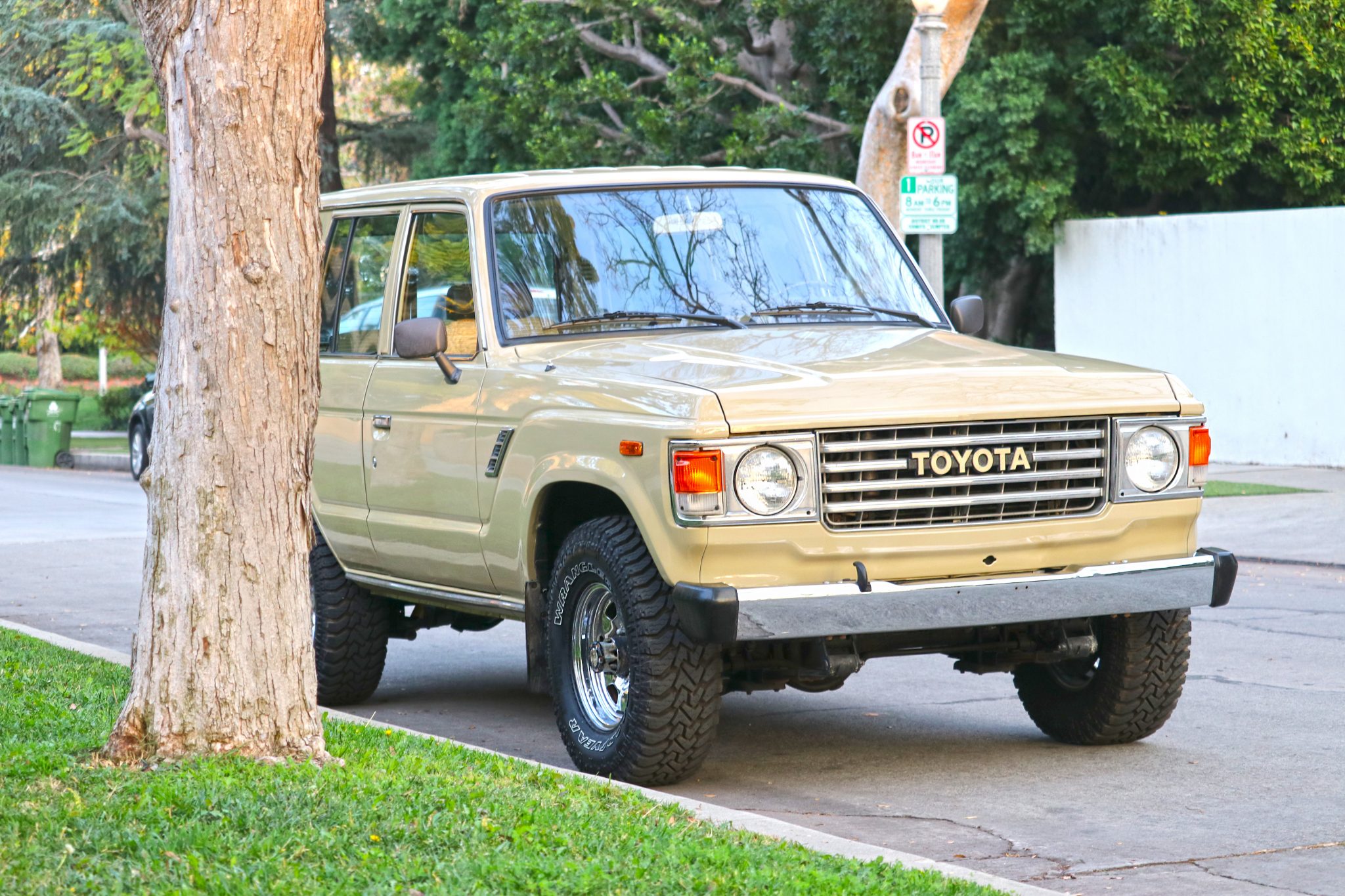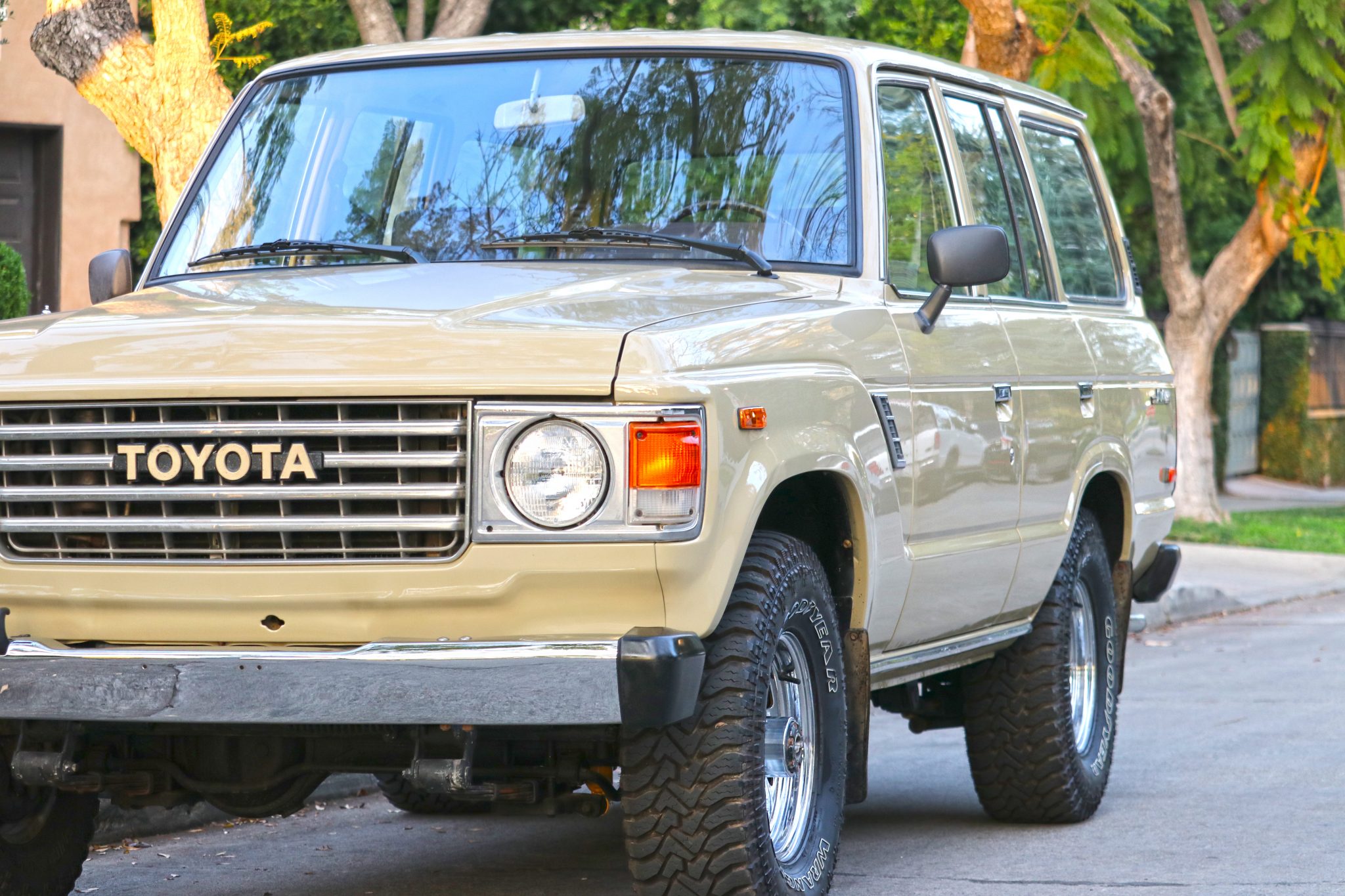 Stock 15″ polished steel wheels are mounted with Goodyear Wrangler tires. The truck is equipped with manually-locking hubs up front.