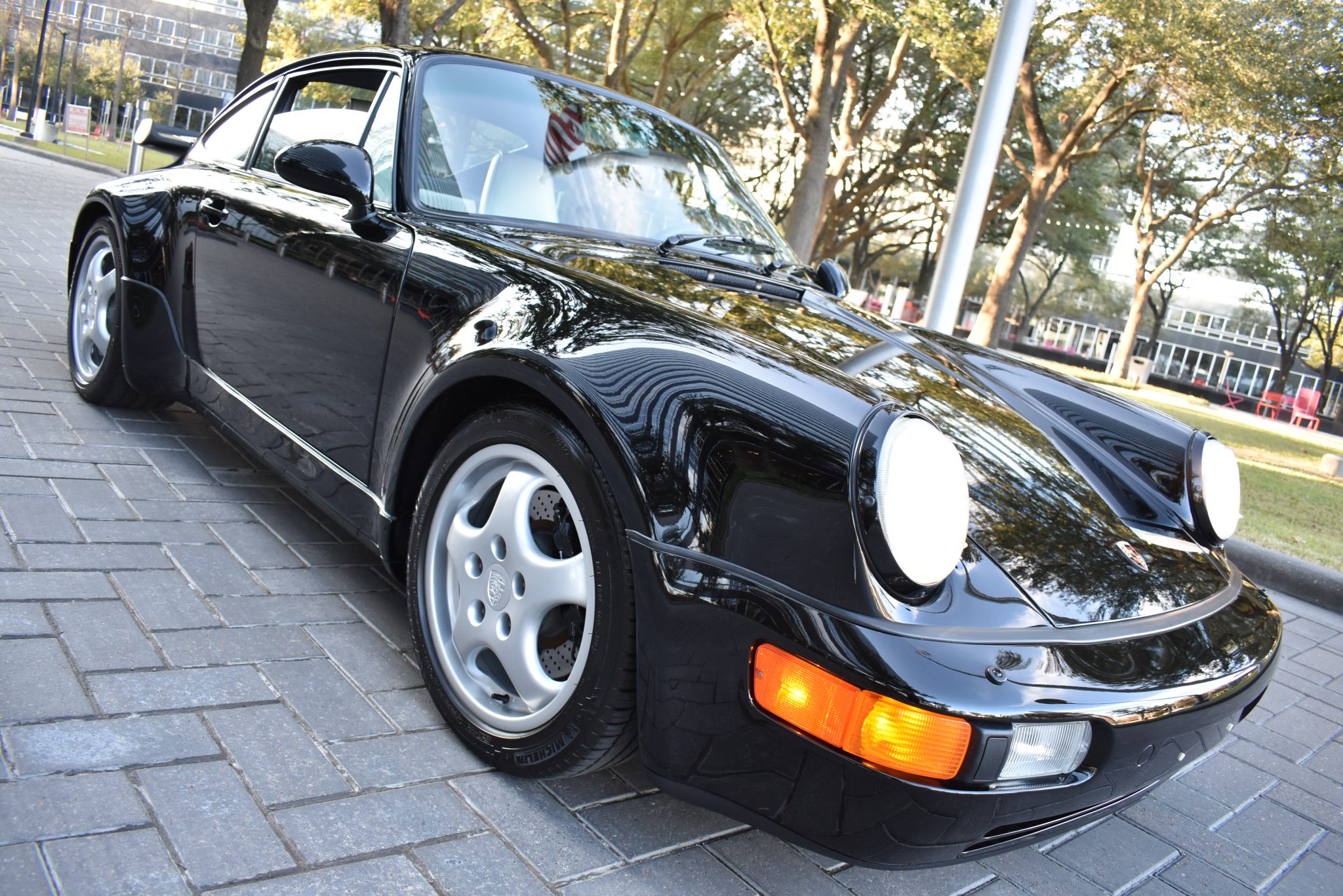 The silver-finished 17″ Cup wheels wear monochromatic Porsche center caps and are wrapped with 205/50 front and 255/40 rear Michelin Pilot Sport tires. The 964 Turbo featured force-sensitive power steering and power vented anti-lock disc brakes with four-piston calipers. A Koni/H&R coilover suspension has been added.