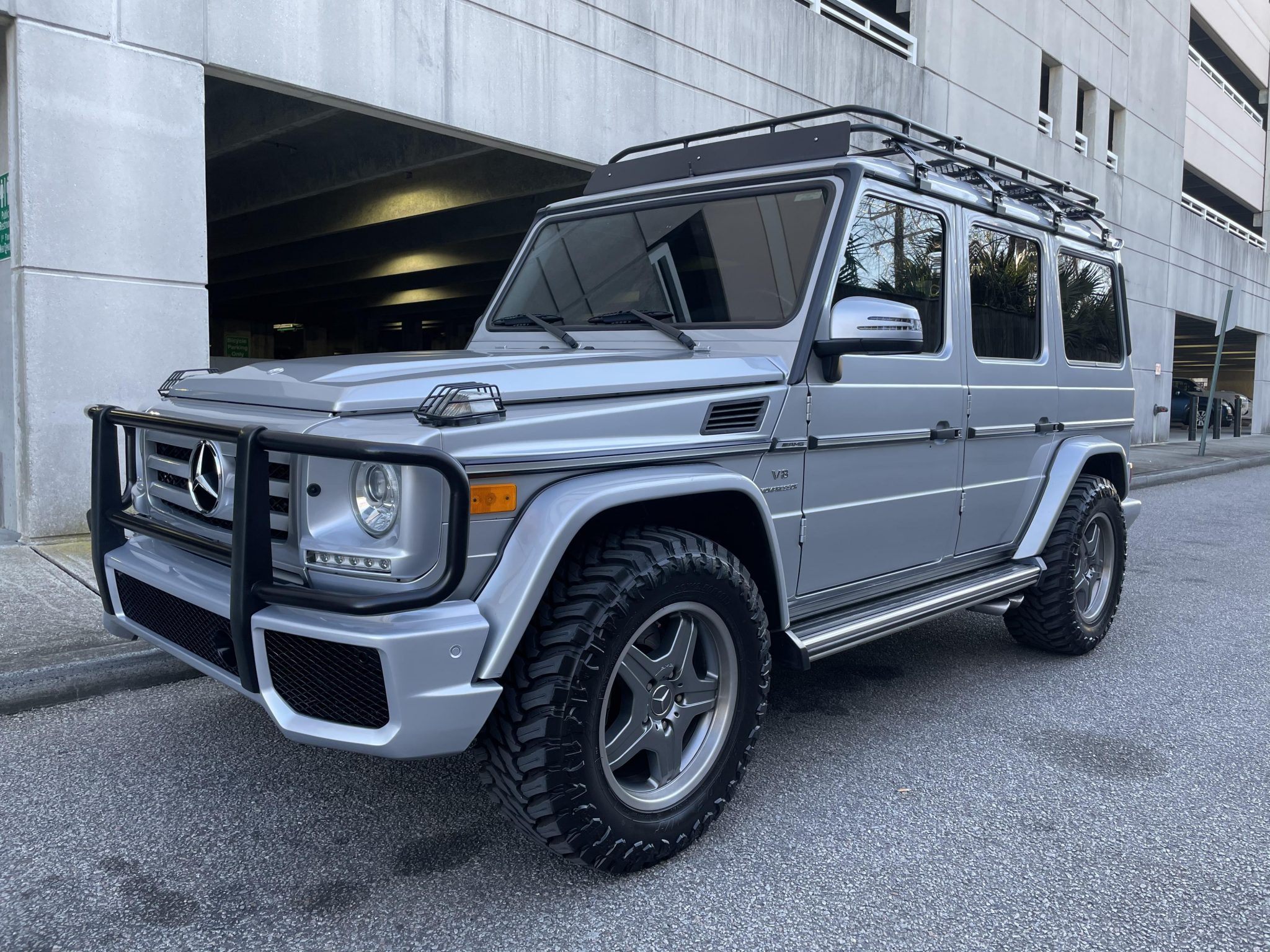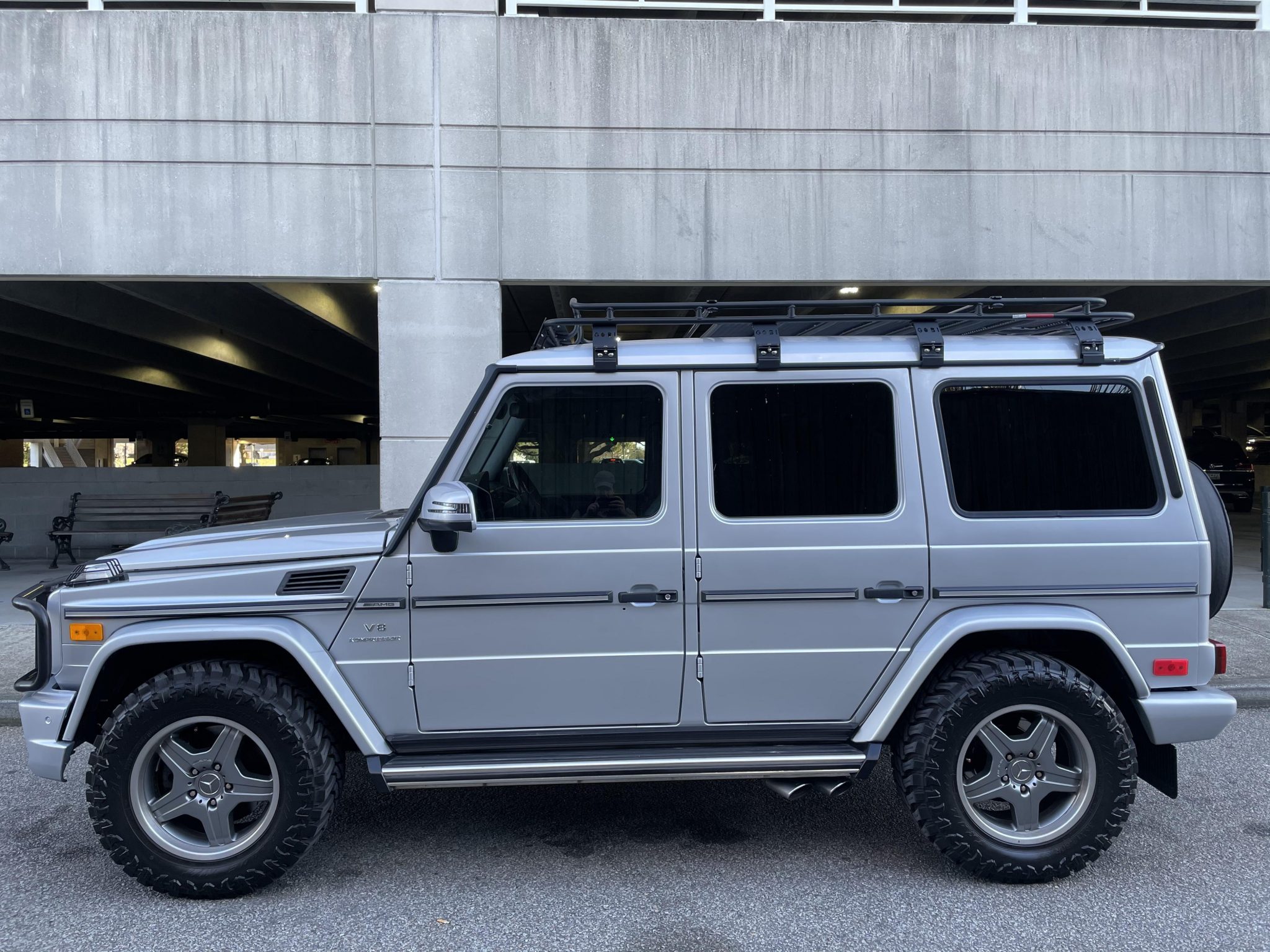 Gray-finished 18″ AMG wheels with silver lips wear 33″x 12.5″ Atturo Trail Blade M/T tires with 2020 date codes. A covered spare is mounted on the tailgate. It is said in the last seven months H&R wheel spacers have been added and the suspension has been converted to factory G550 specifications with a replacement steering damper, track bars, shocks, springs, and control arm bushings. Brake work reportedly included replacement rotors and pads, and the selling dealer states there is a noise coming from the front passenger spring.