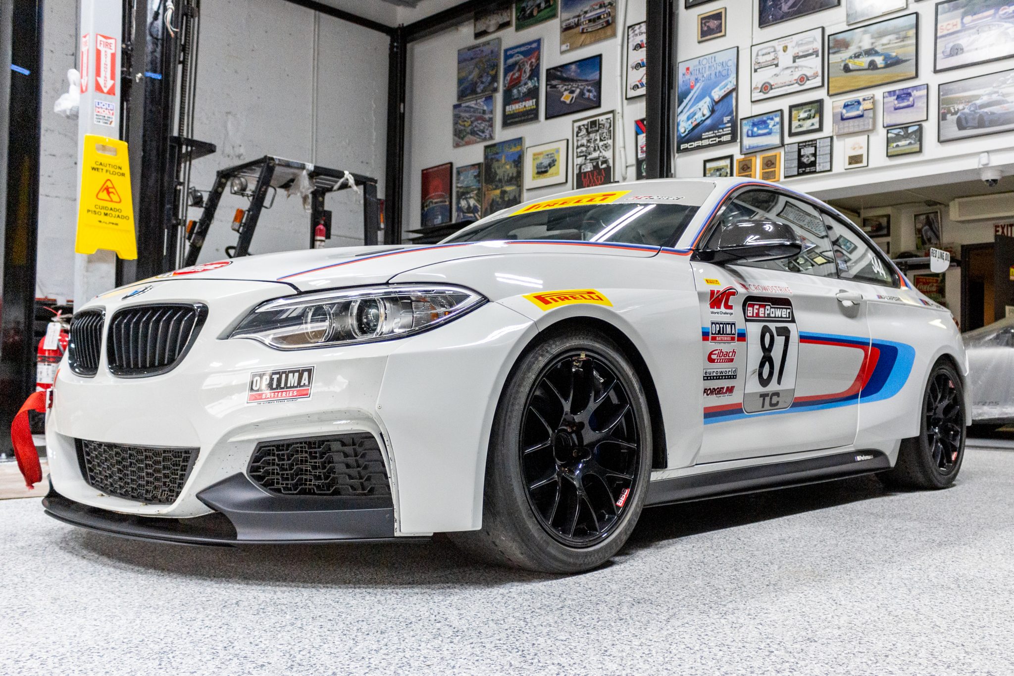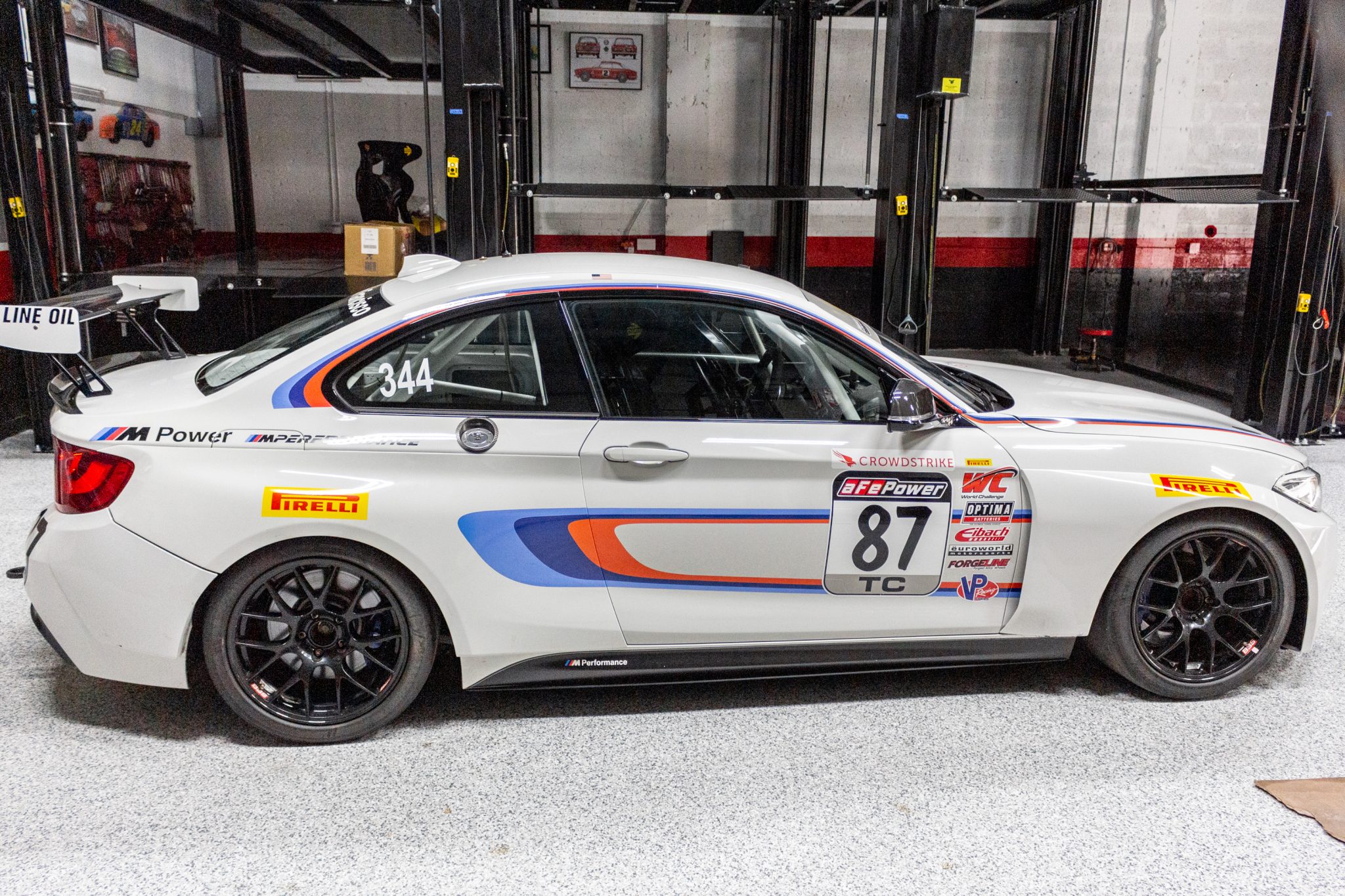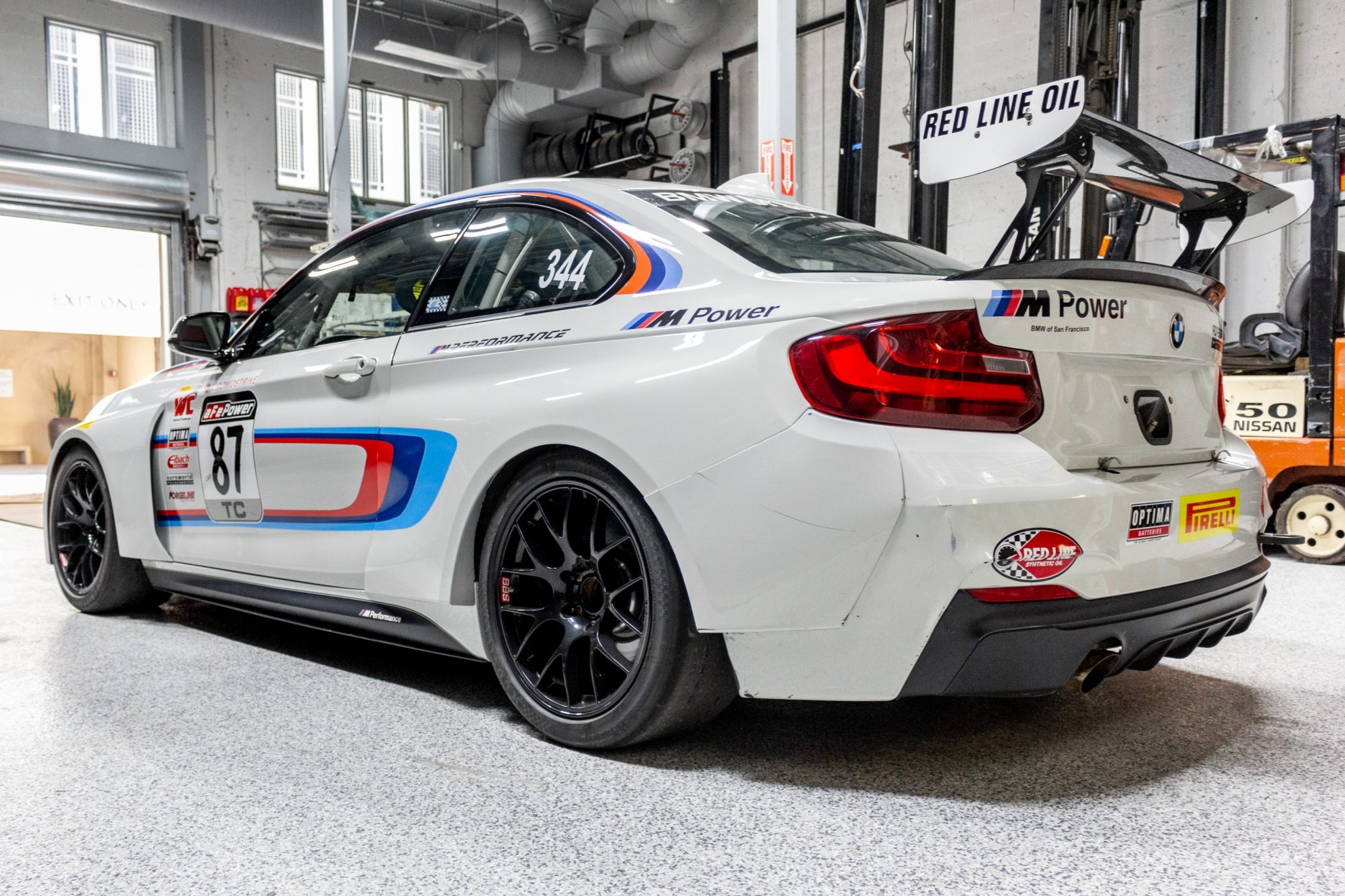 Black 18″ BBS motorsport wheels wear Hoosier racing slicks sized 275/35. The car is equipped with an air jack system, a five-link rear end, and a KW coilover suspension with H&R springs. Motorsport-specific versions of ABS, Dynamic Stability Control, and Automatic Stability Control were also standard, and braking is handled by PFC four-piston fixed calipers up front and two-piston calipers at the rear.