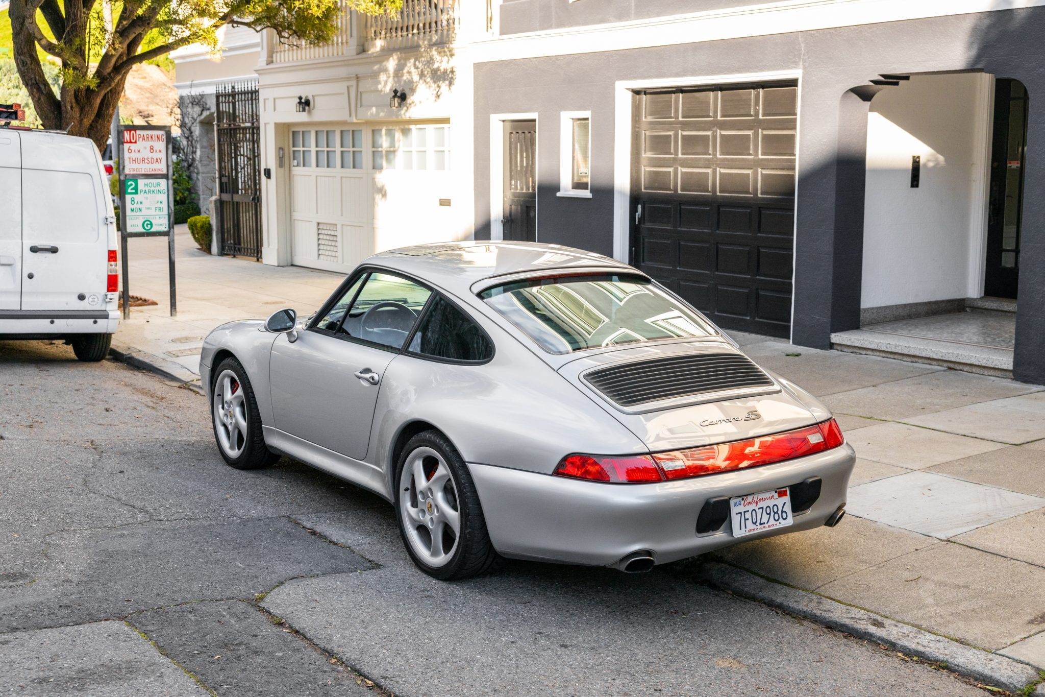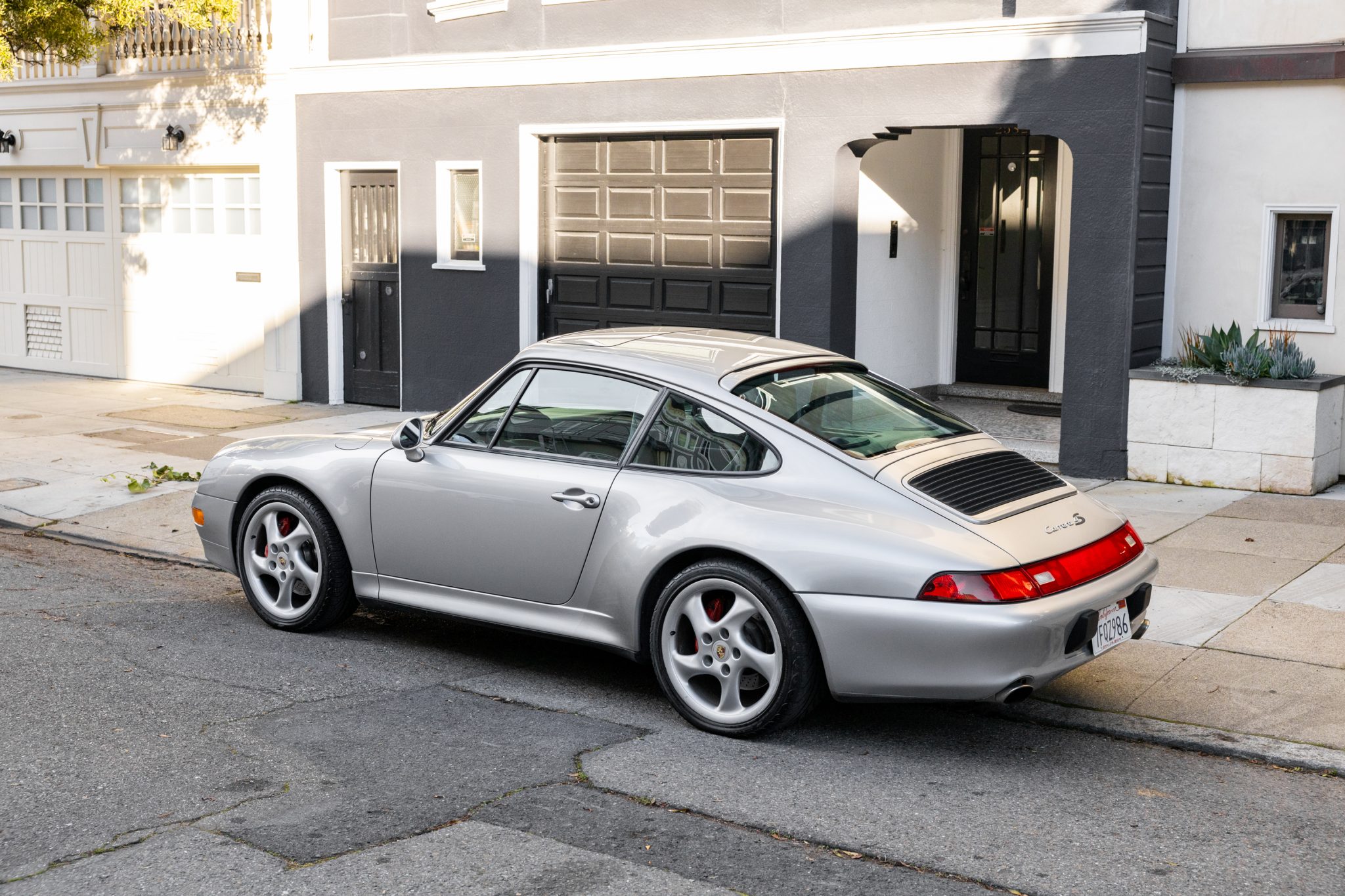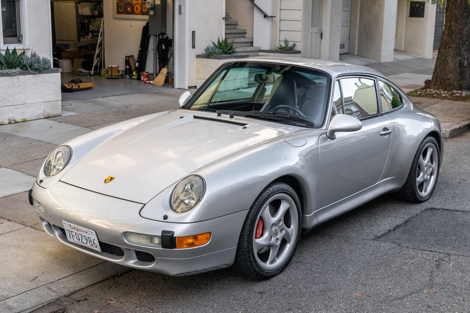 Factory 18″ Turbo Twist wheels feature Porsche-crest center caps and wear Michelin Pilot Sport tires with visible cracks in the rubber. Turbo-spec red brake calipers were standard to the C4S along with cross-drilled rotors at all four corners.